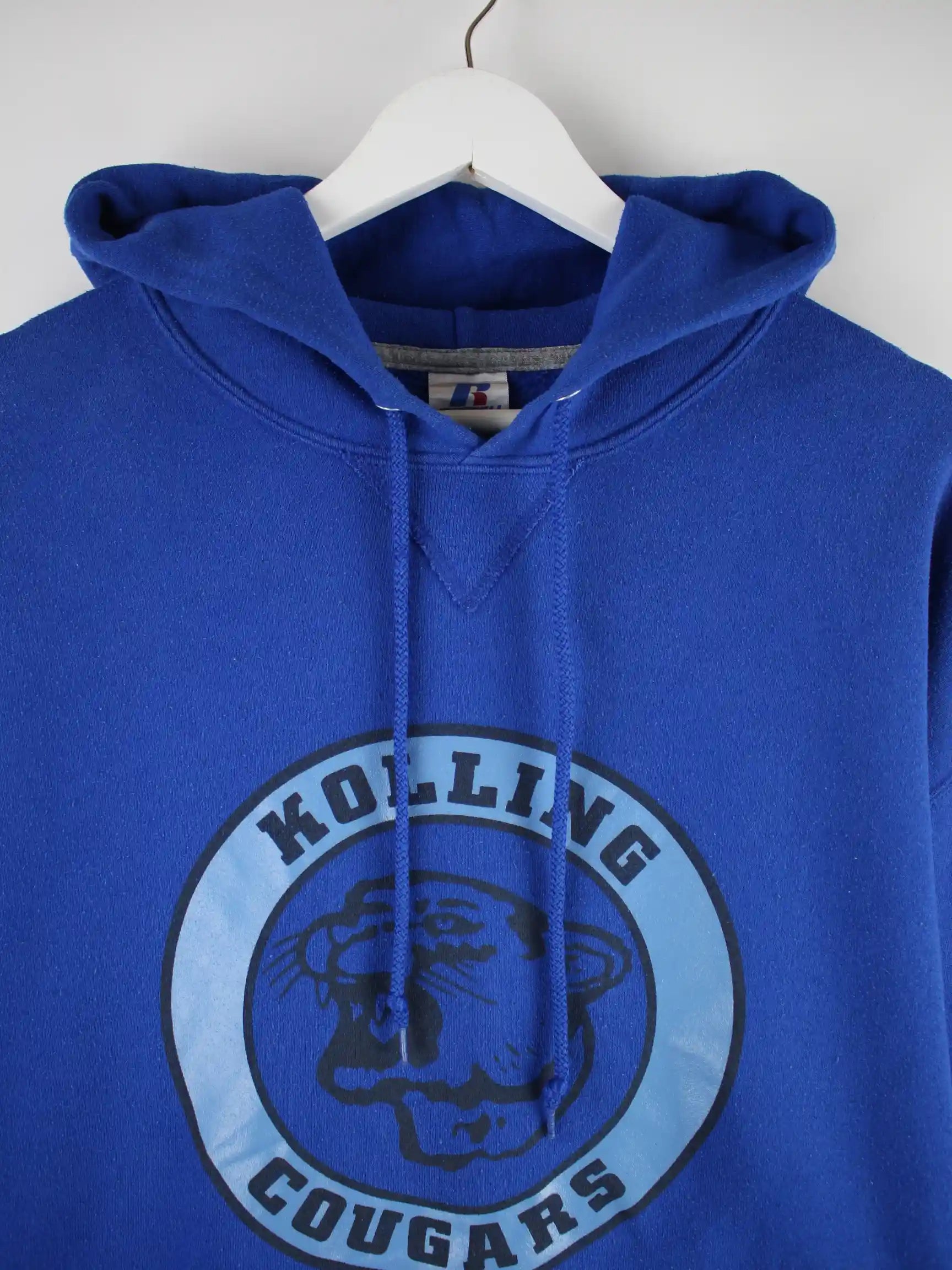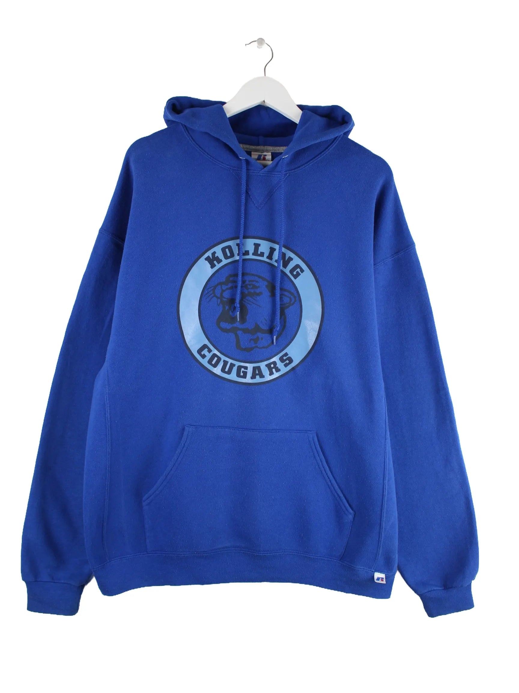 Hoodie vom Label Russell Athletic in Größe XL. Er ist aus einer Baumwollmischung gefertigt und in Blau bei uns vorrätig. Mit schickem Cougars Print.
