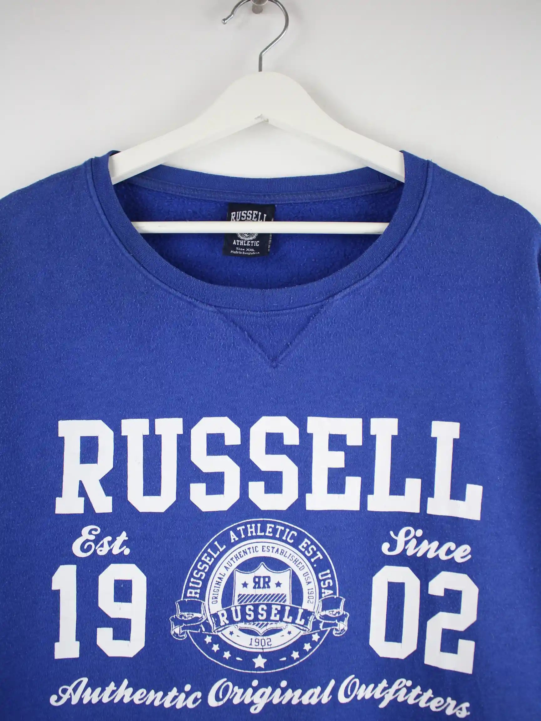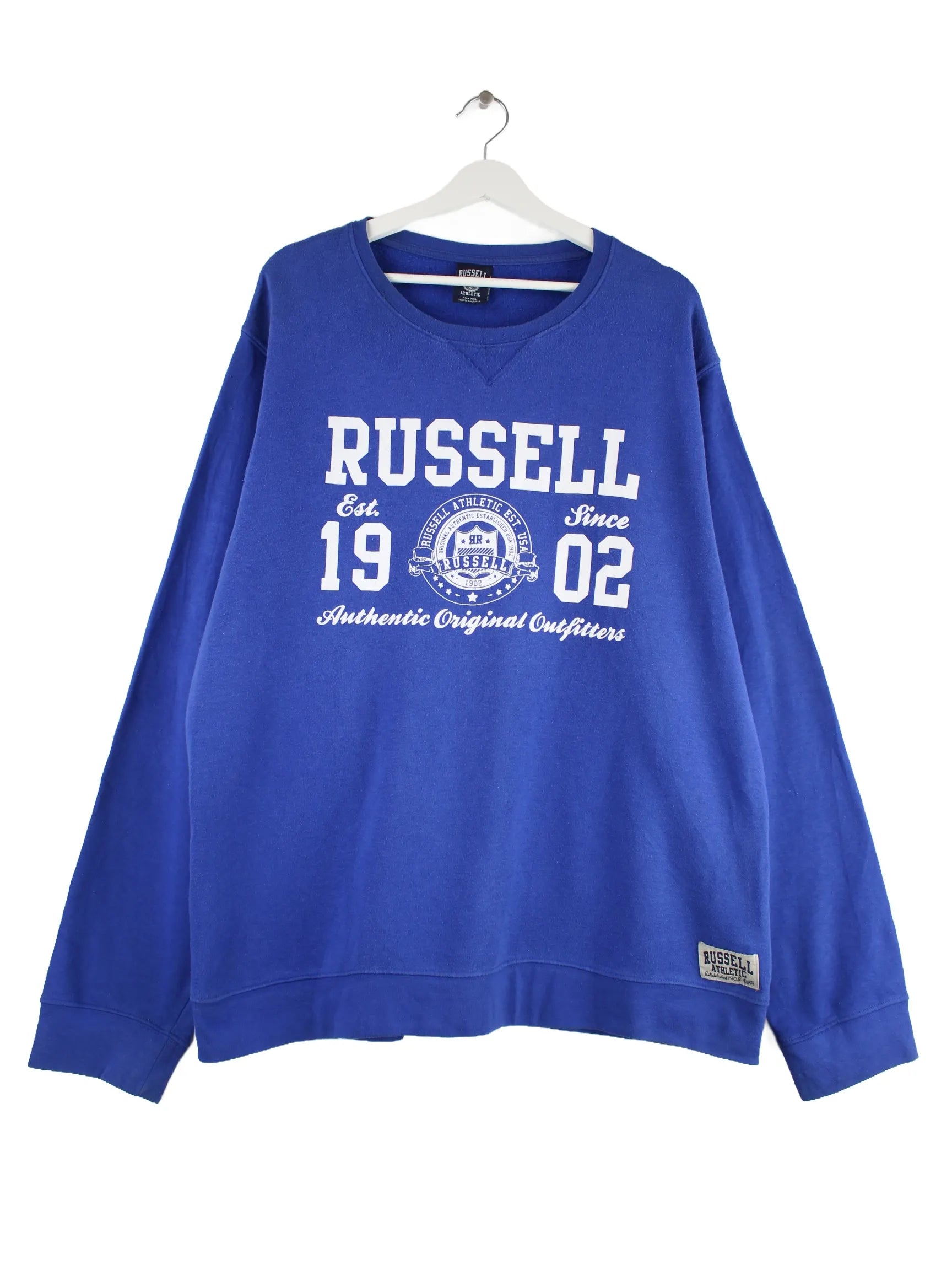 Sweater der Brand Russell Athletic in Größe XXL. Er ist aus einer Baumwollmischung gefertigt und in Blau auf Lager. Mit tollem Print.