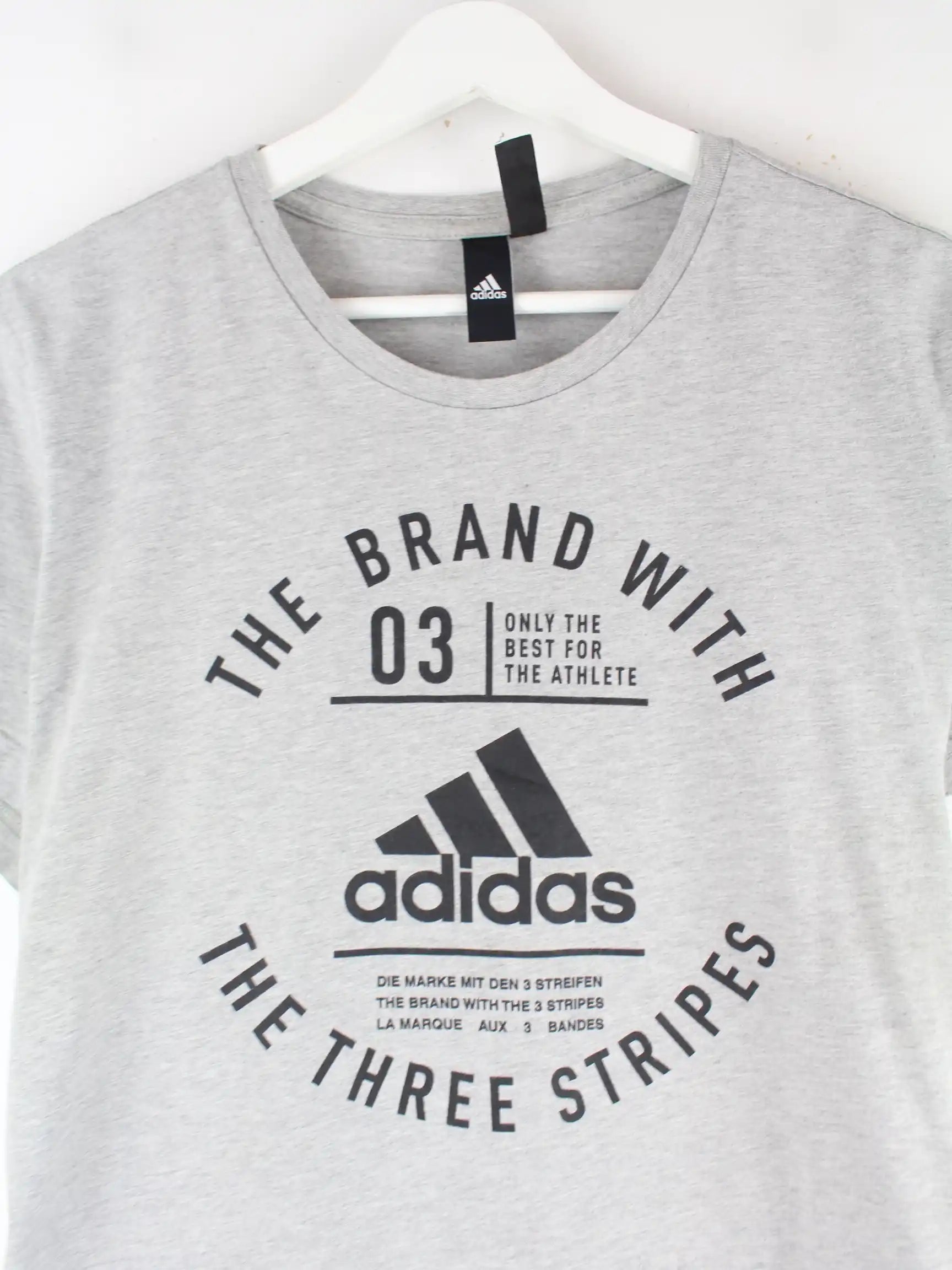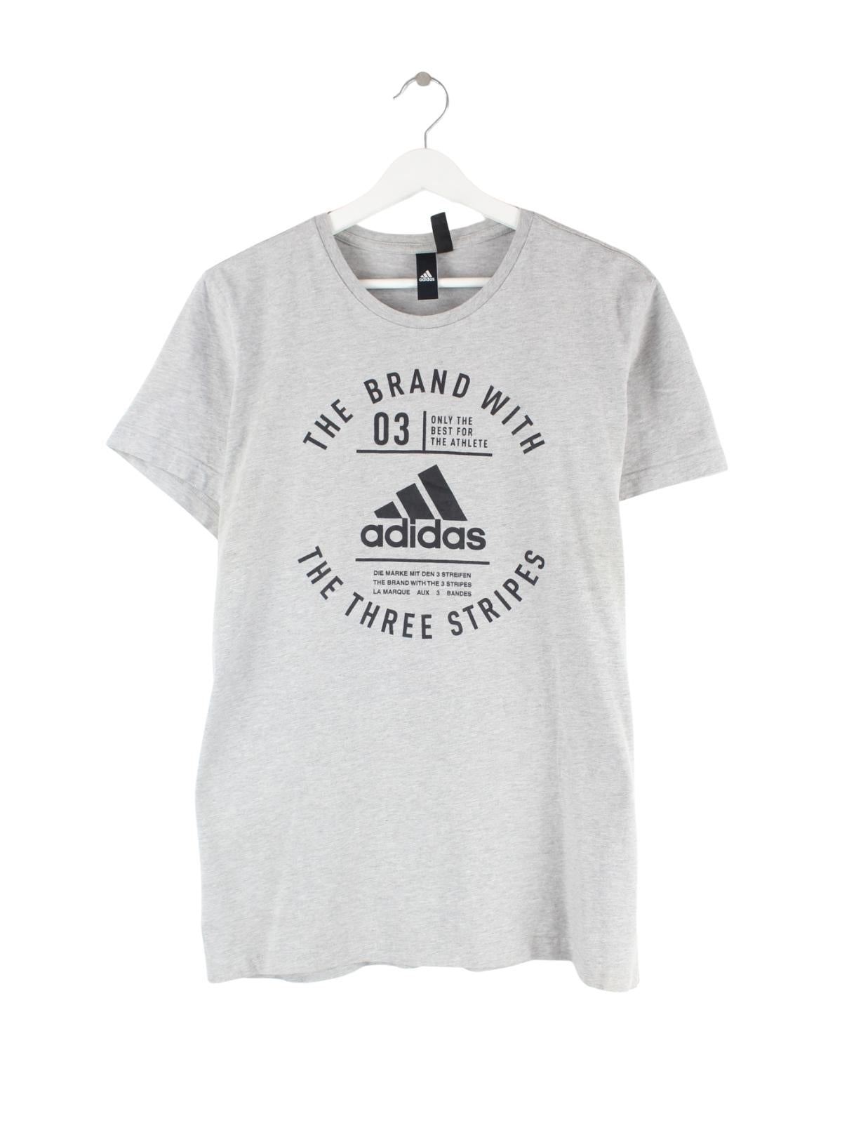 T-Shirt der Brand Adidas in Größe L. Es ist aus Baumwolle gemacht und in Grau lieferbar. Mit schickem Print.