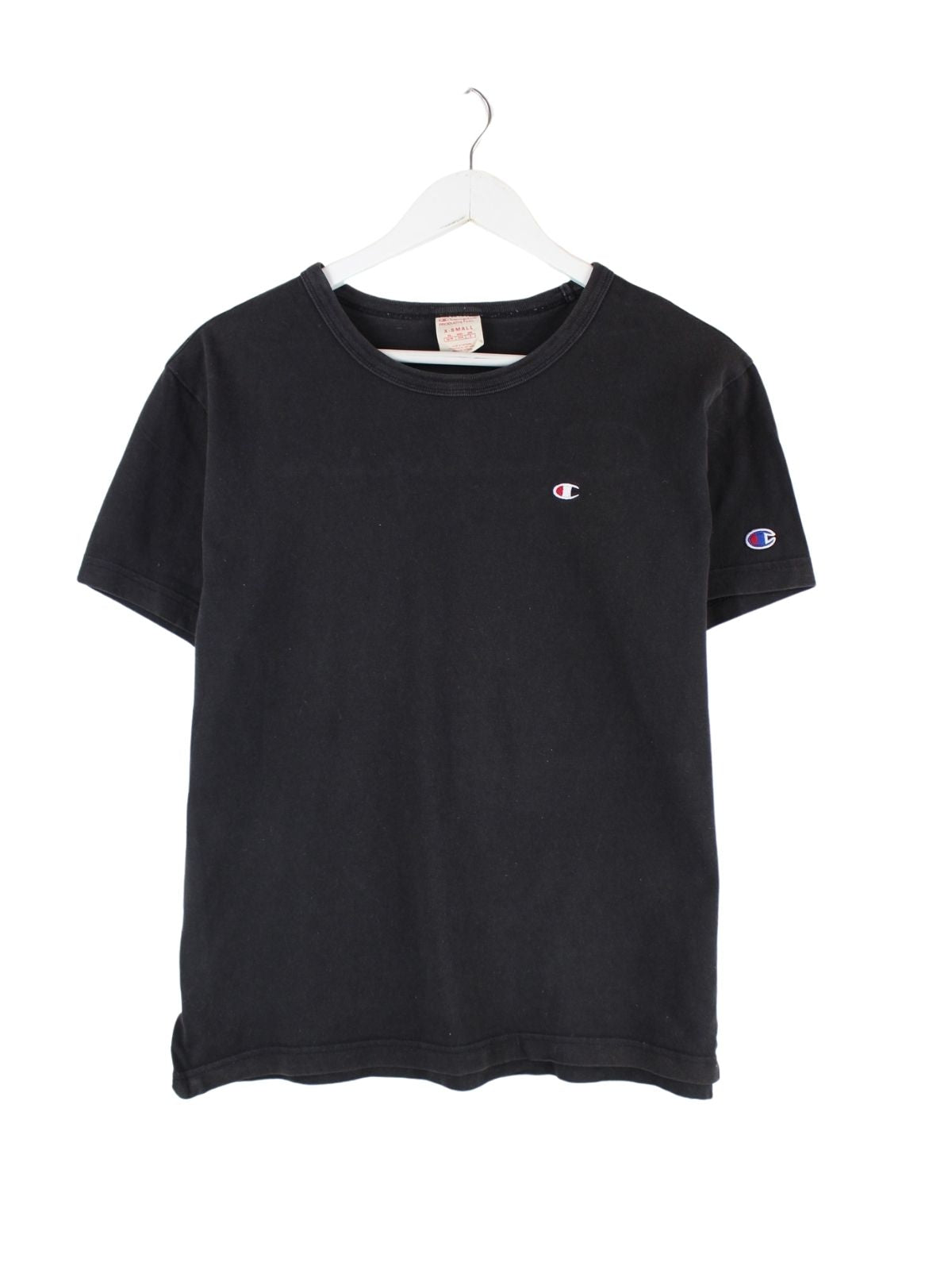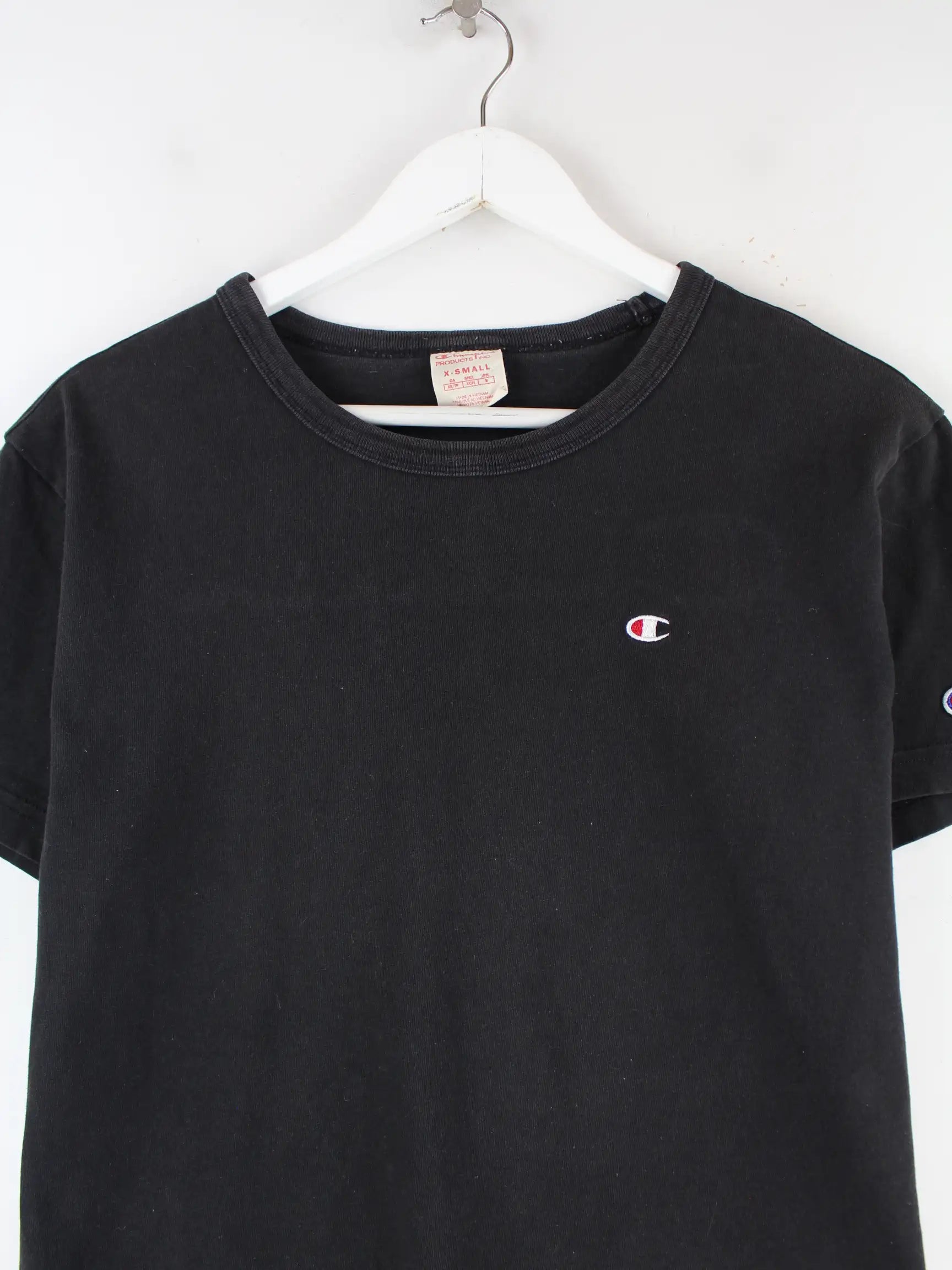 Schwarzes T-Shirt mit gesticktem Logo der Brand Champion in Größe XS. Es ist aus Baumwolle hergestellt und in gutem Zustand bei uns vorrätig.