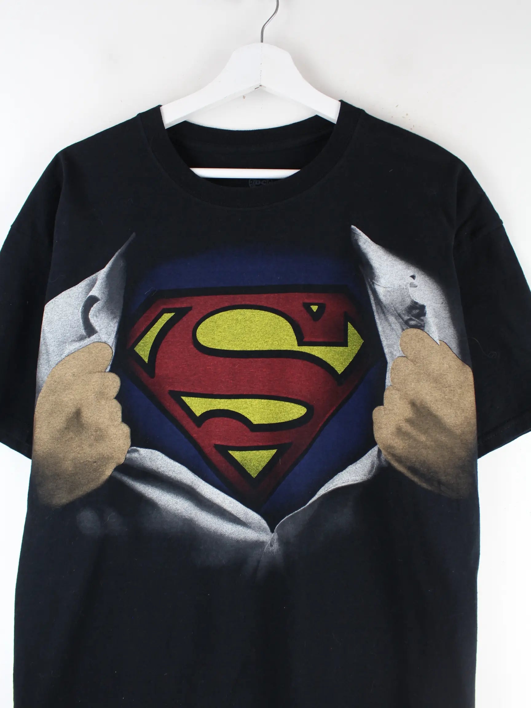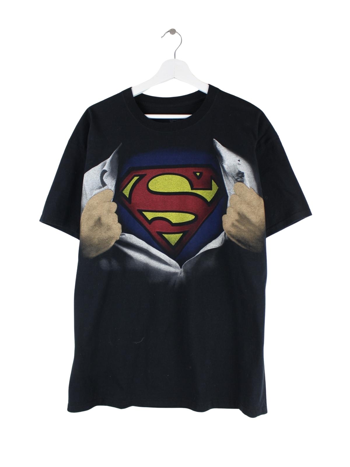 Schwarzes T-Shirt von DC in Größe XL. Es ist aus Baumwolle gefertigt und in sehr gutem Zustand bei uns vorrätig. Mit schickem Superman Print.