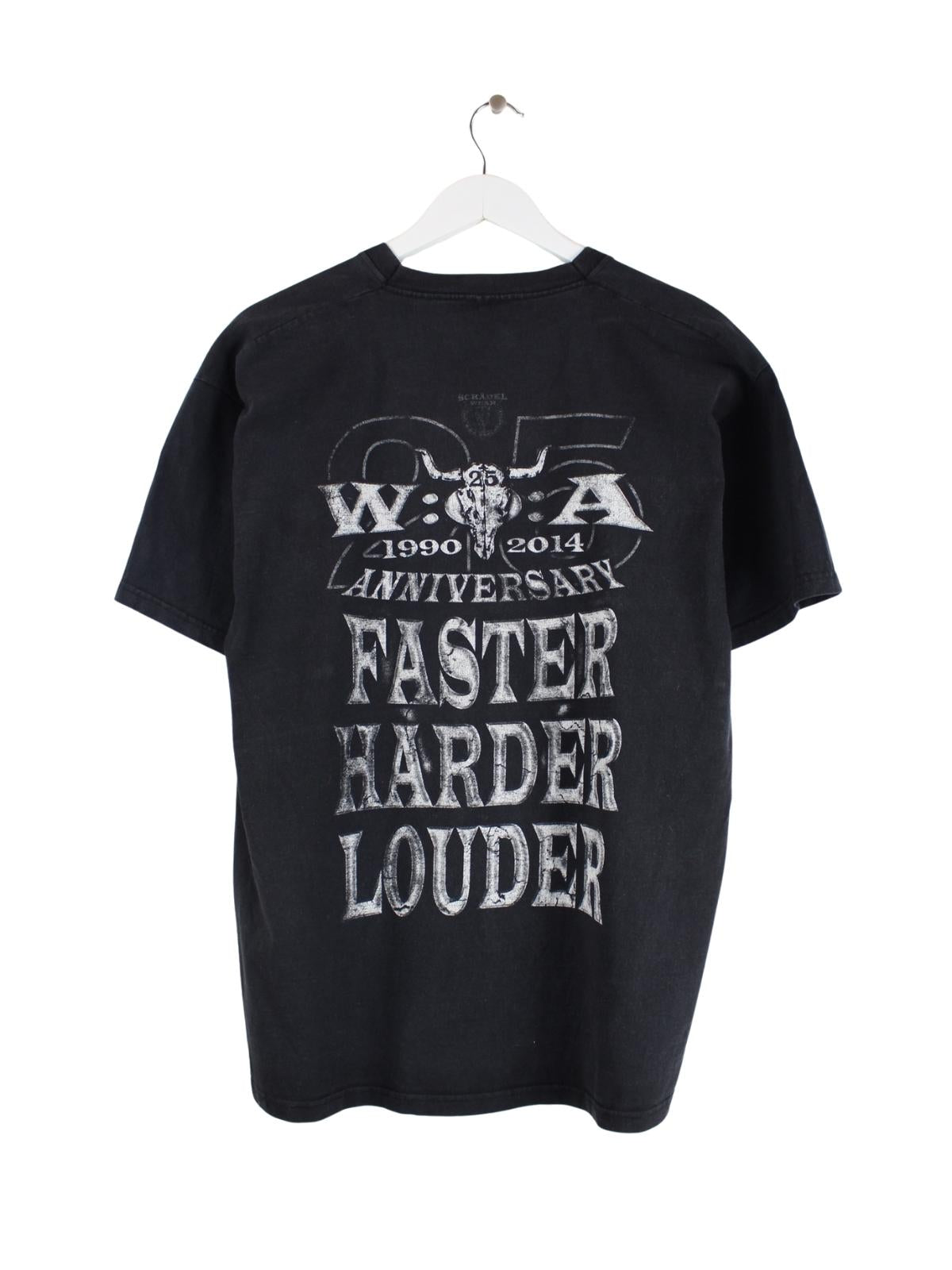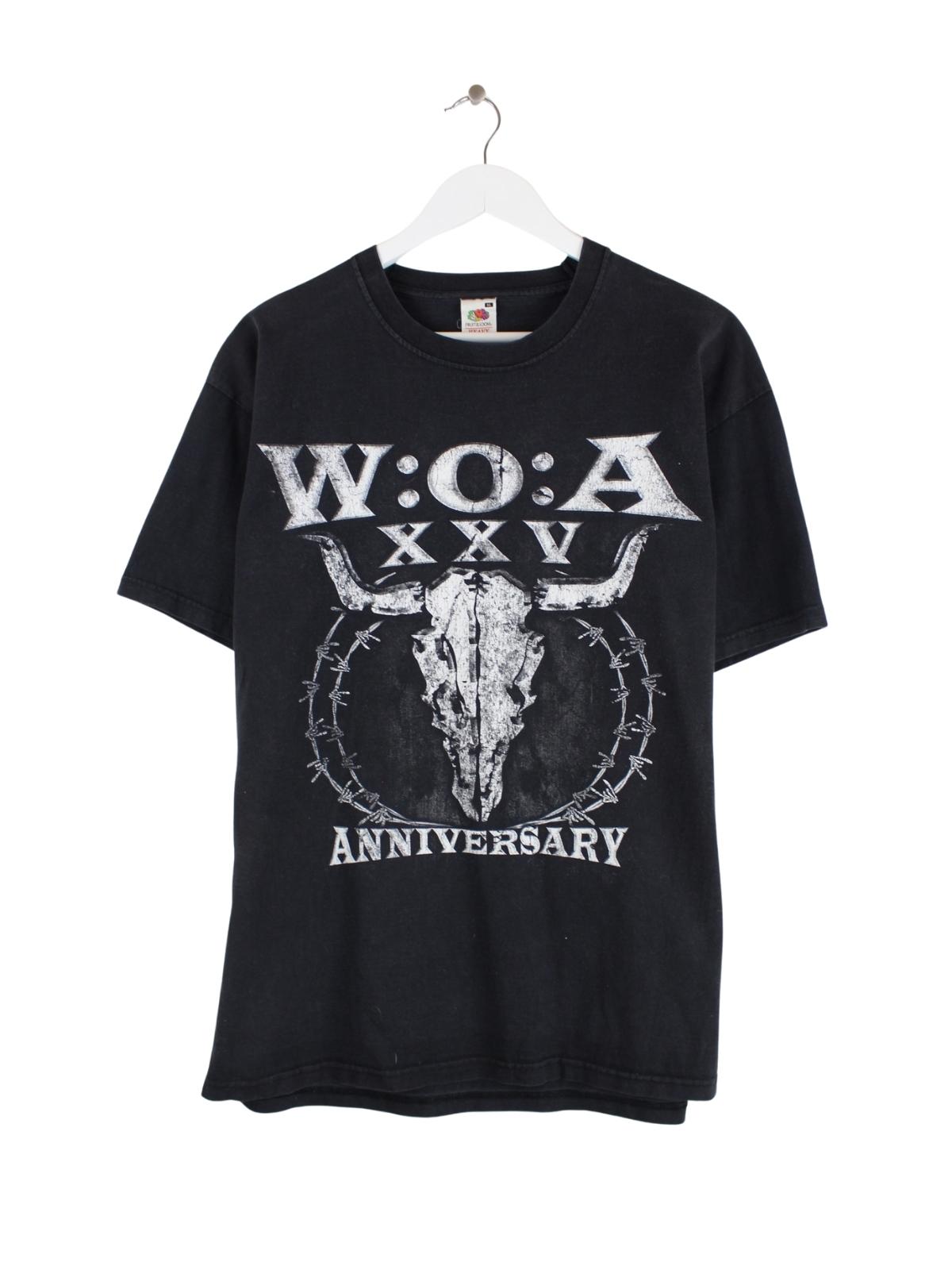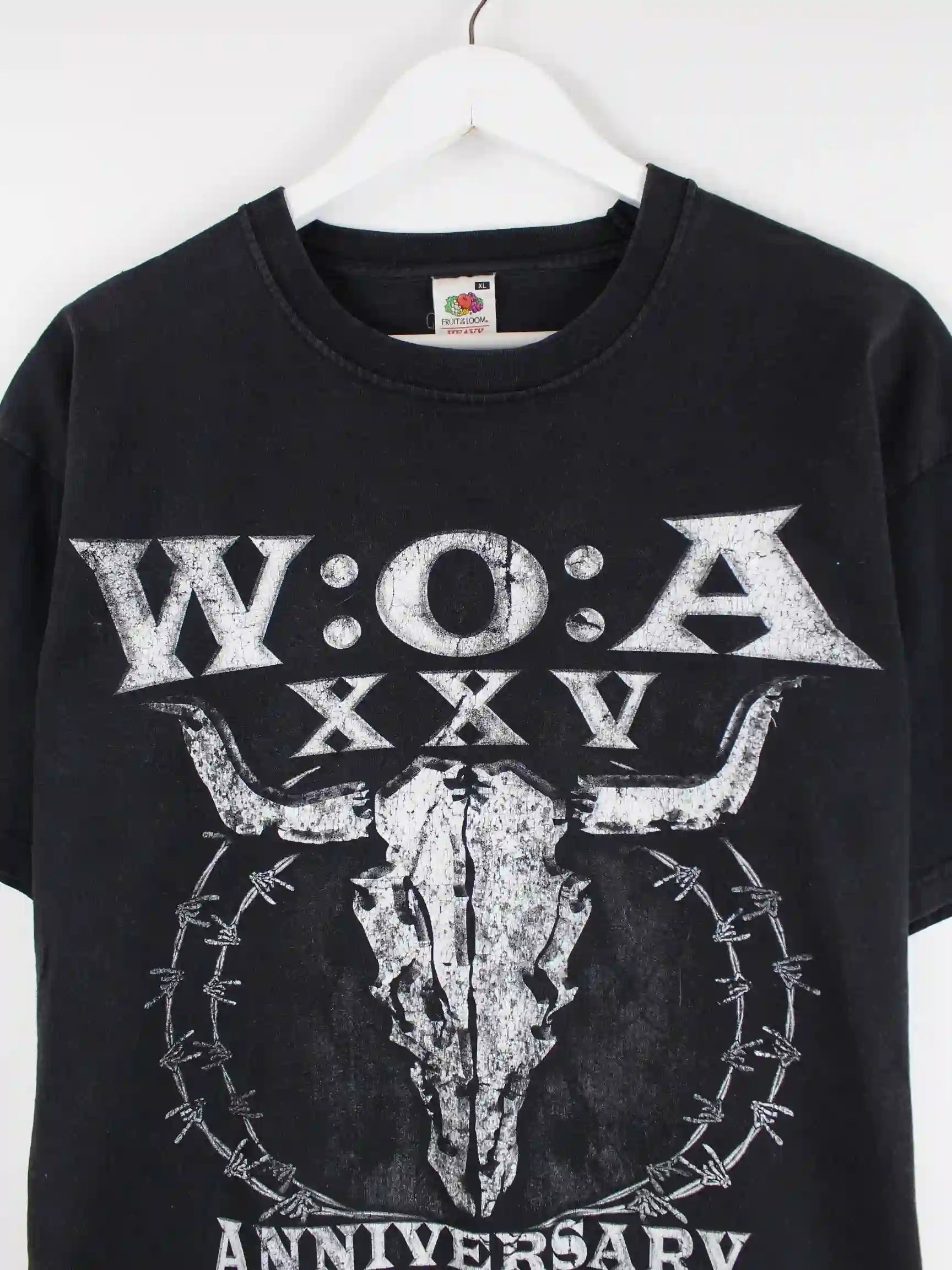 T-Shirt der Marke Fruit of the Loom in Größe XL. Es ist aus Baumwolle gemacht und in Schwarz auf Lager. Mit schickem Rock Print.