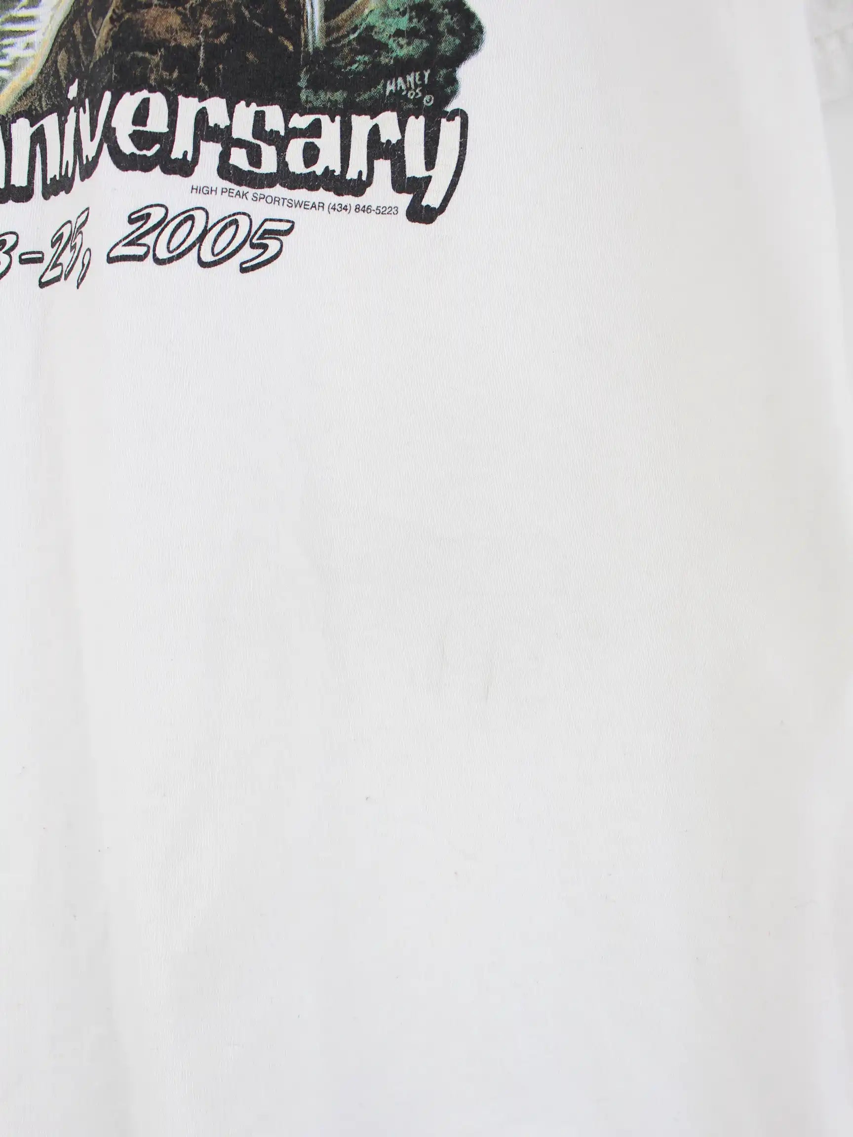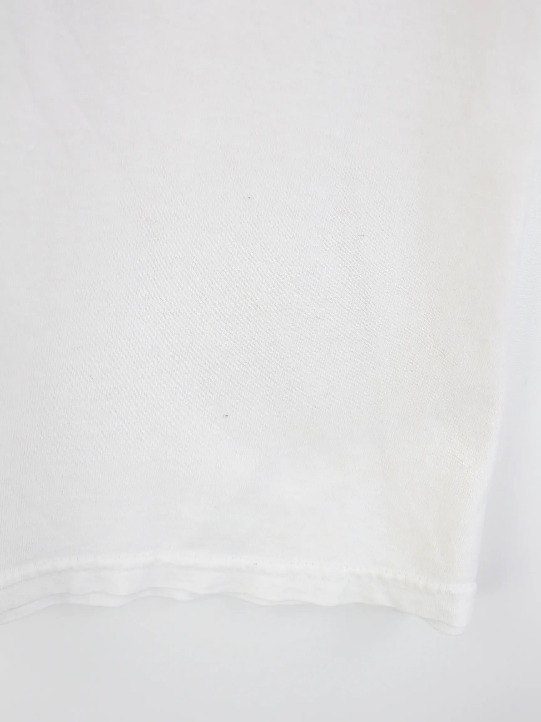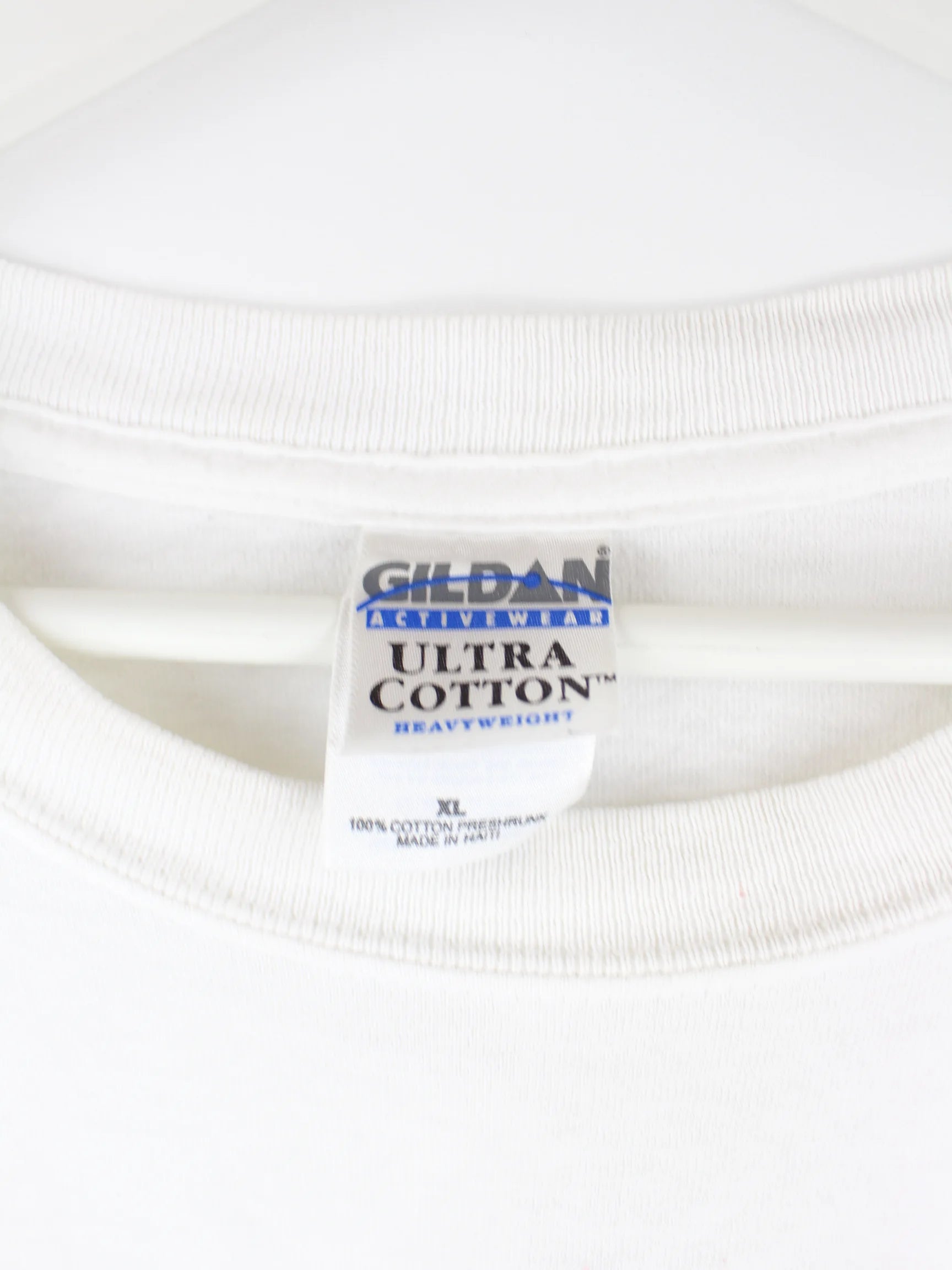T-Shirt der Brand Gildan in Größe XL. Es ist aus Baumwolle und in Weiß im Bestand. Mit seltenem Festival Print.