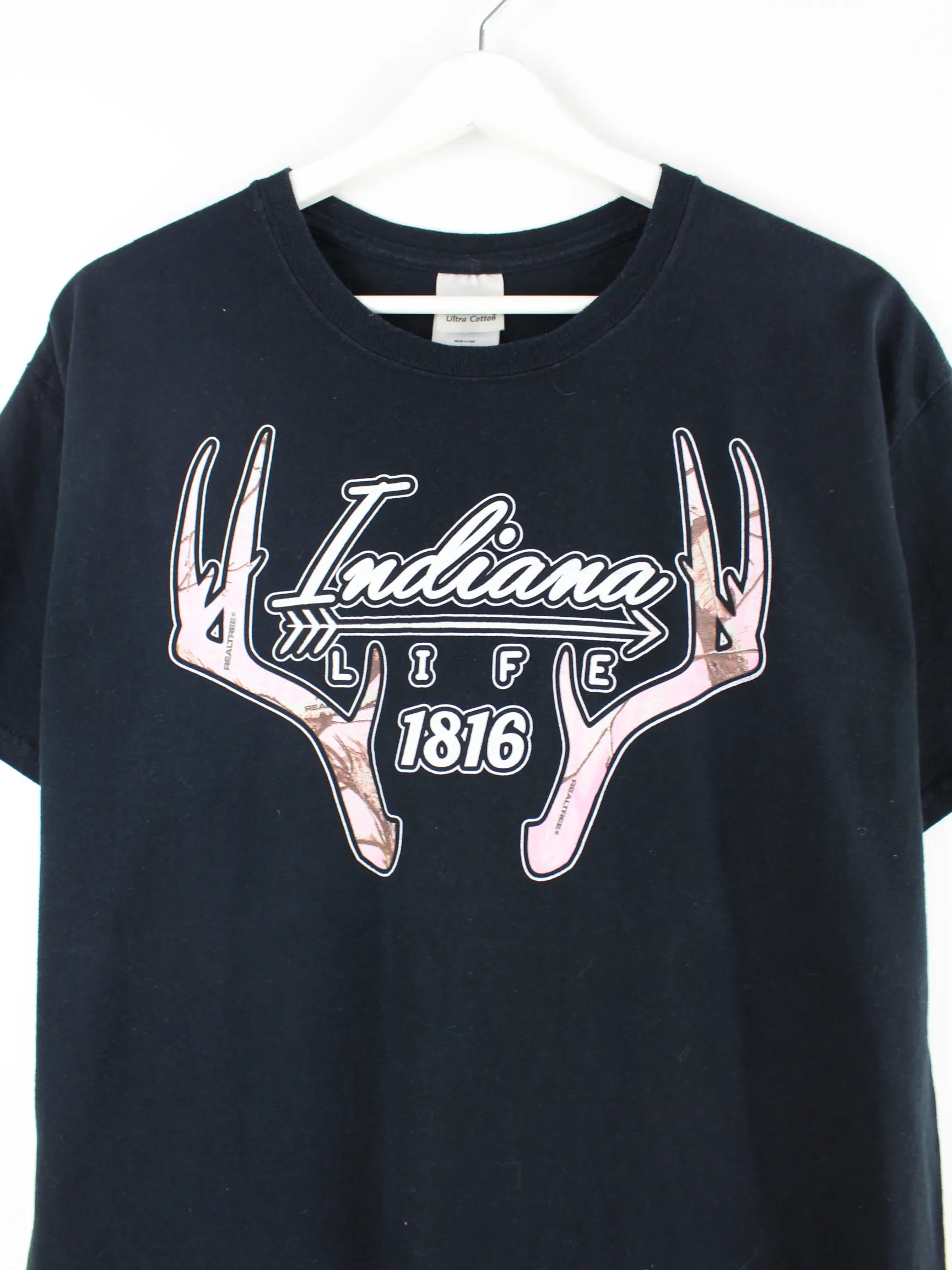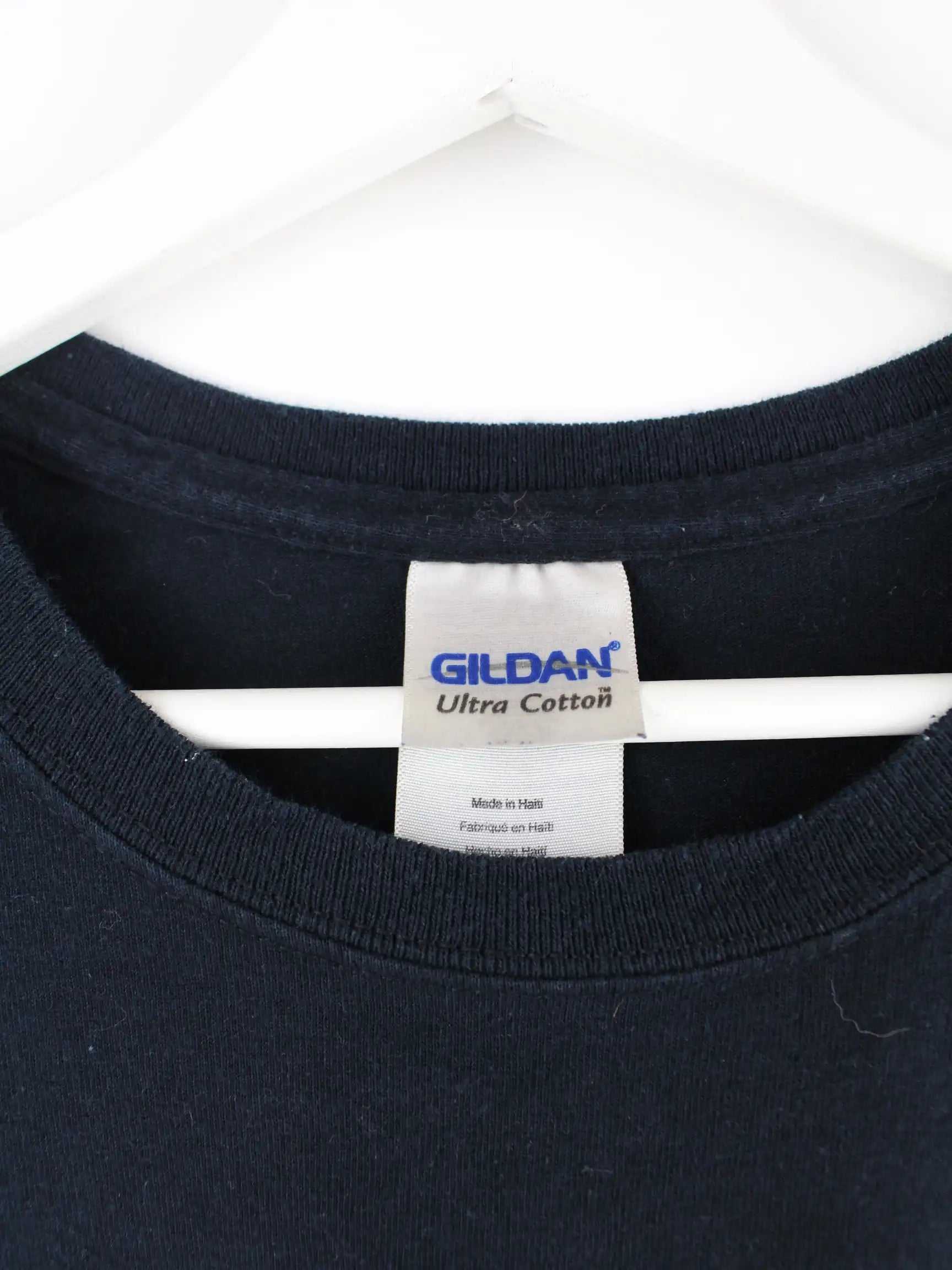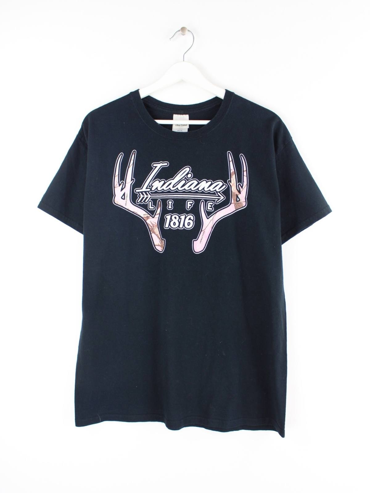 T-Shirt vom Brand Gildan in Größe L. Es ist aus Baumwolle angefertigt und in Schwarz in Stock. Mit schönem Indiana Print.
