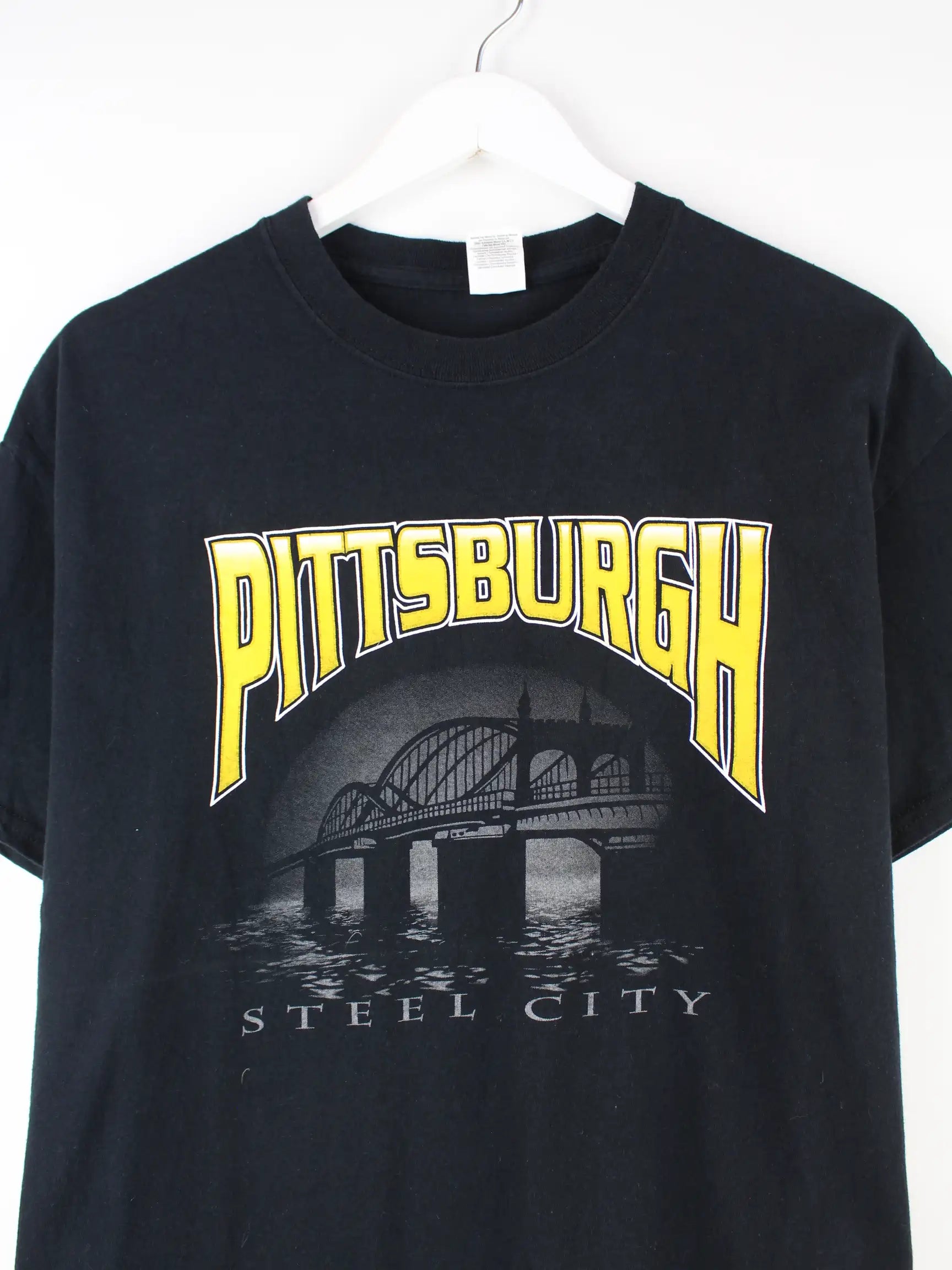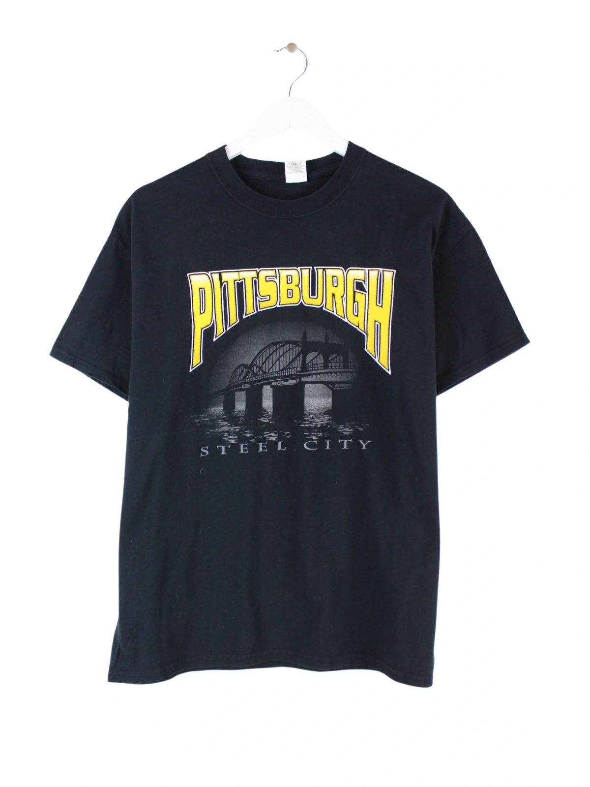 T-Shirt vom Label Gildan in Größe M. Es ist aus Baumwolle produziert und in Schwarz in Stock. Mit schönem Pittsburgh Print.