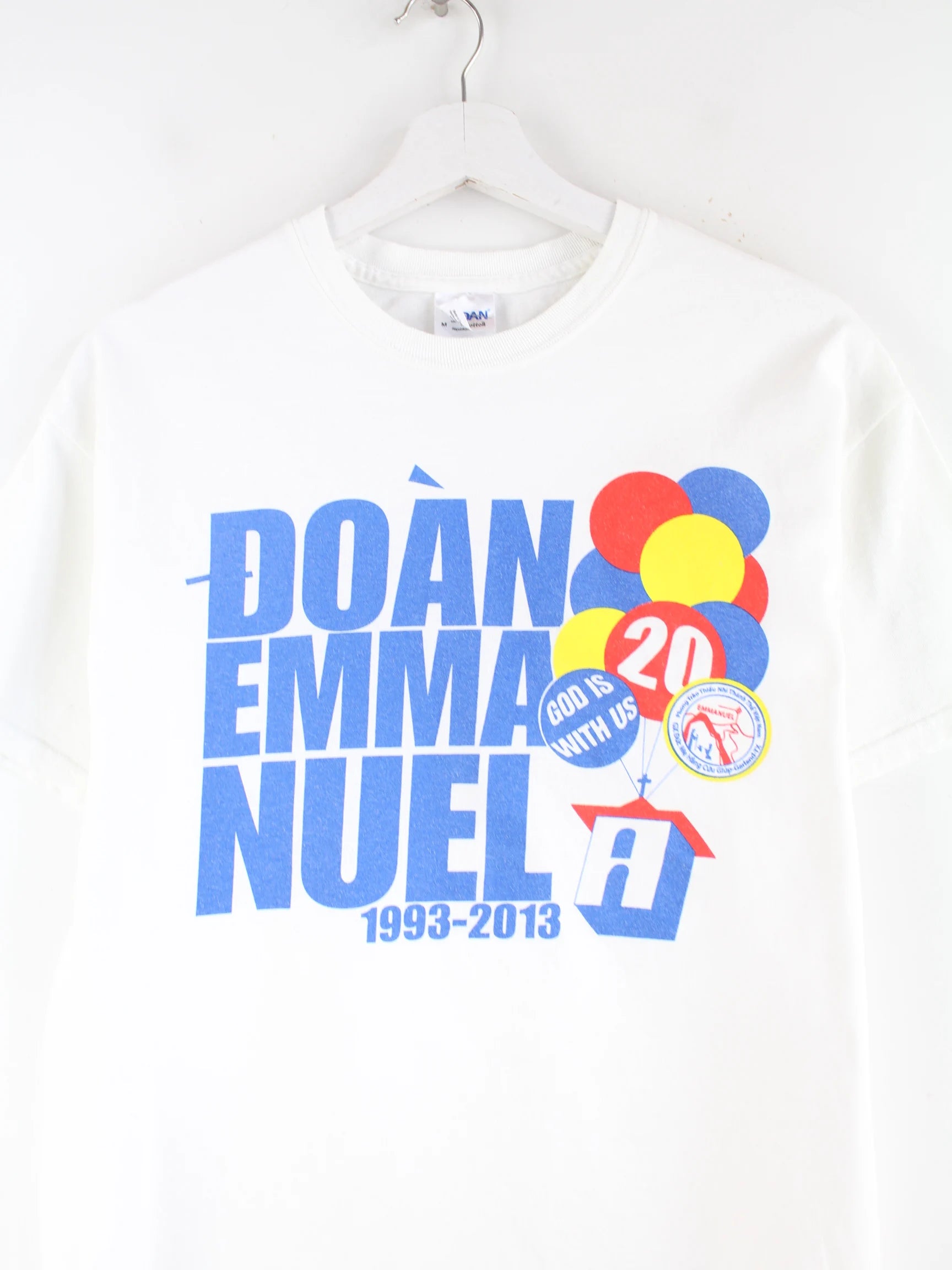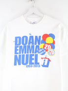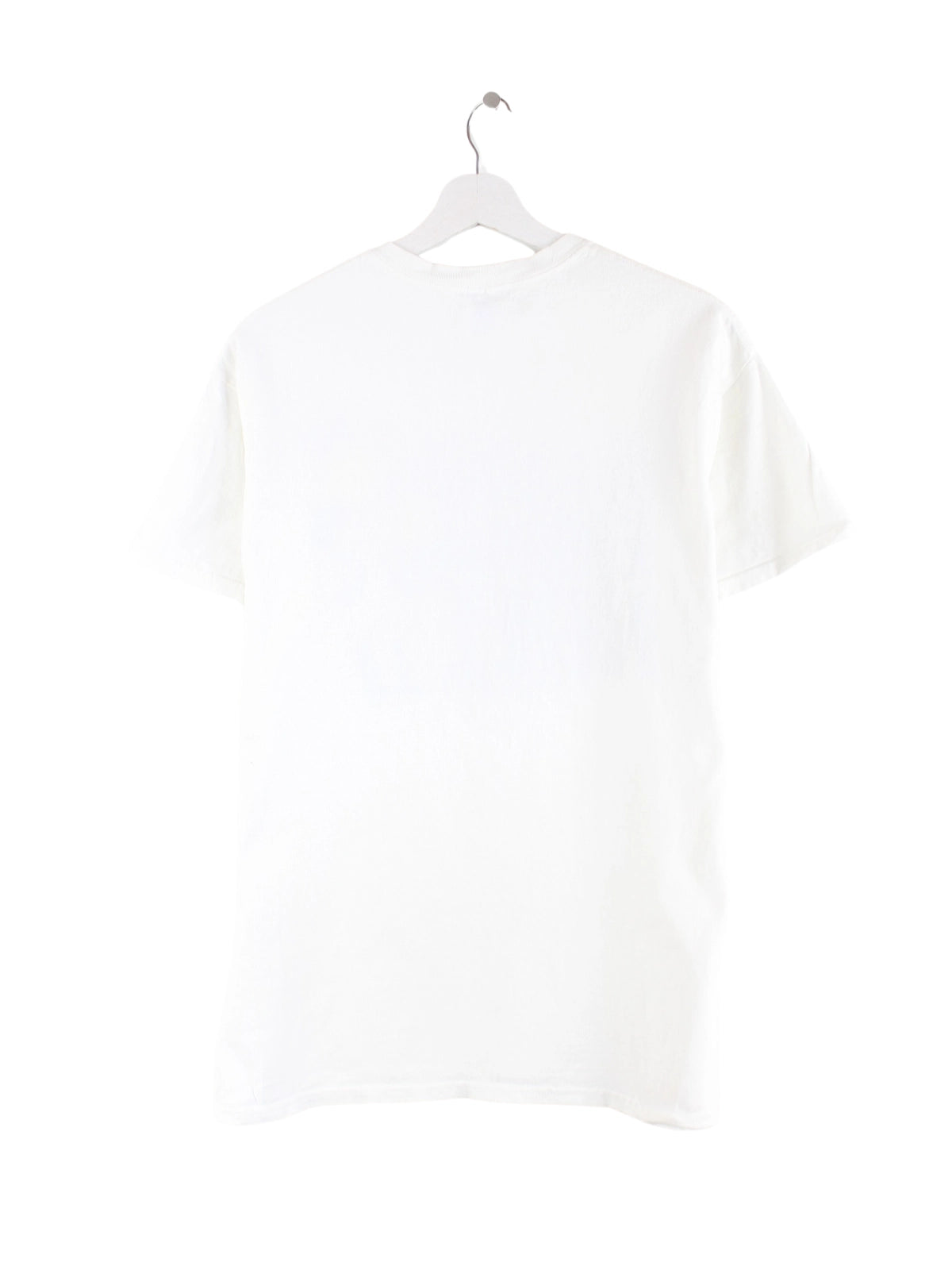 T-Shirt der Brand Gildan in Größe M. Es ist aus Baumwolle produziert und in Weiß im Bestand. Mit schönem Print.