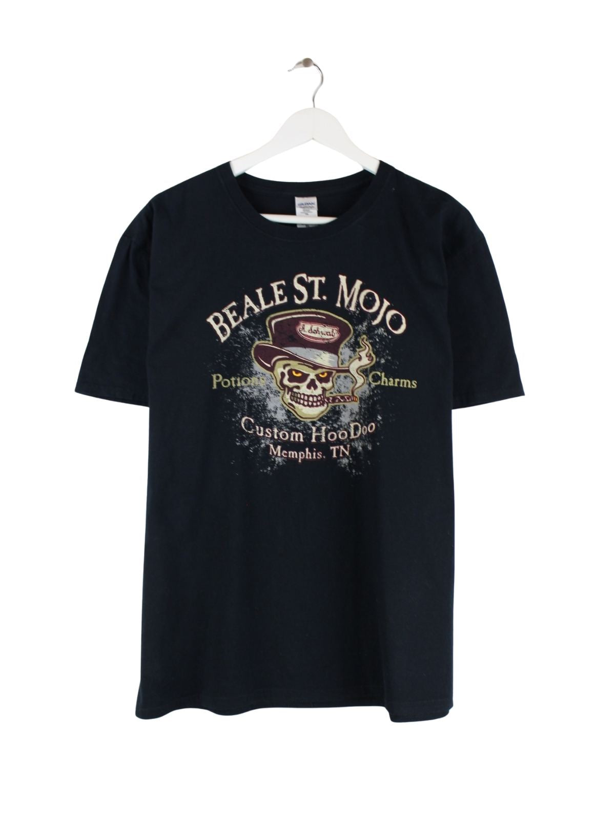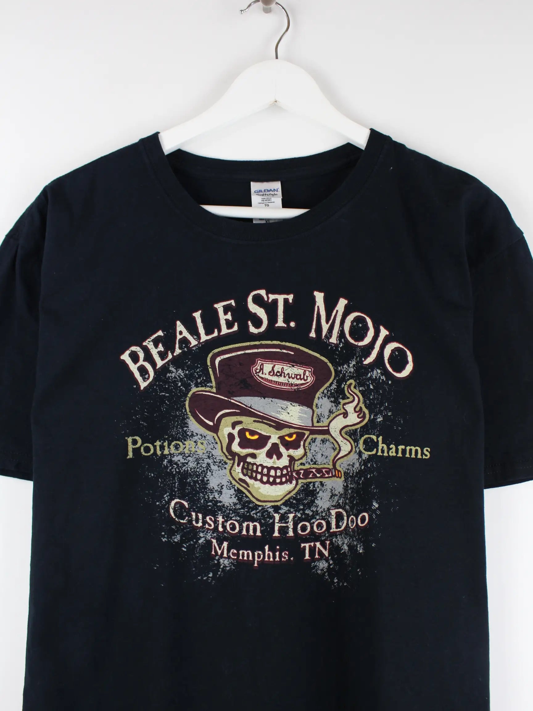 Schwarzes T-Shirt der Marke Gildan in Größe XL. Es ist aus Baumwolle hergestellt und in sehr gutem Zustand bei uns zu bekommen. Mit chiquem Skull Print.