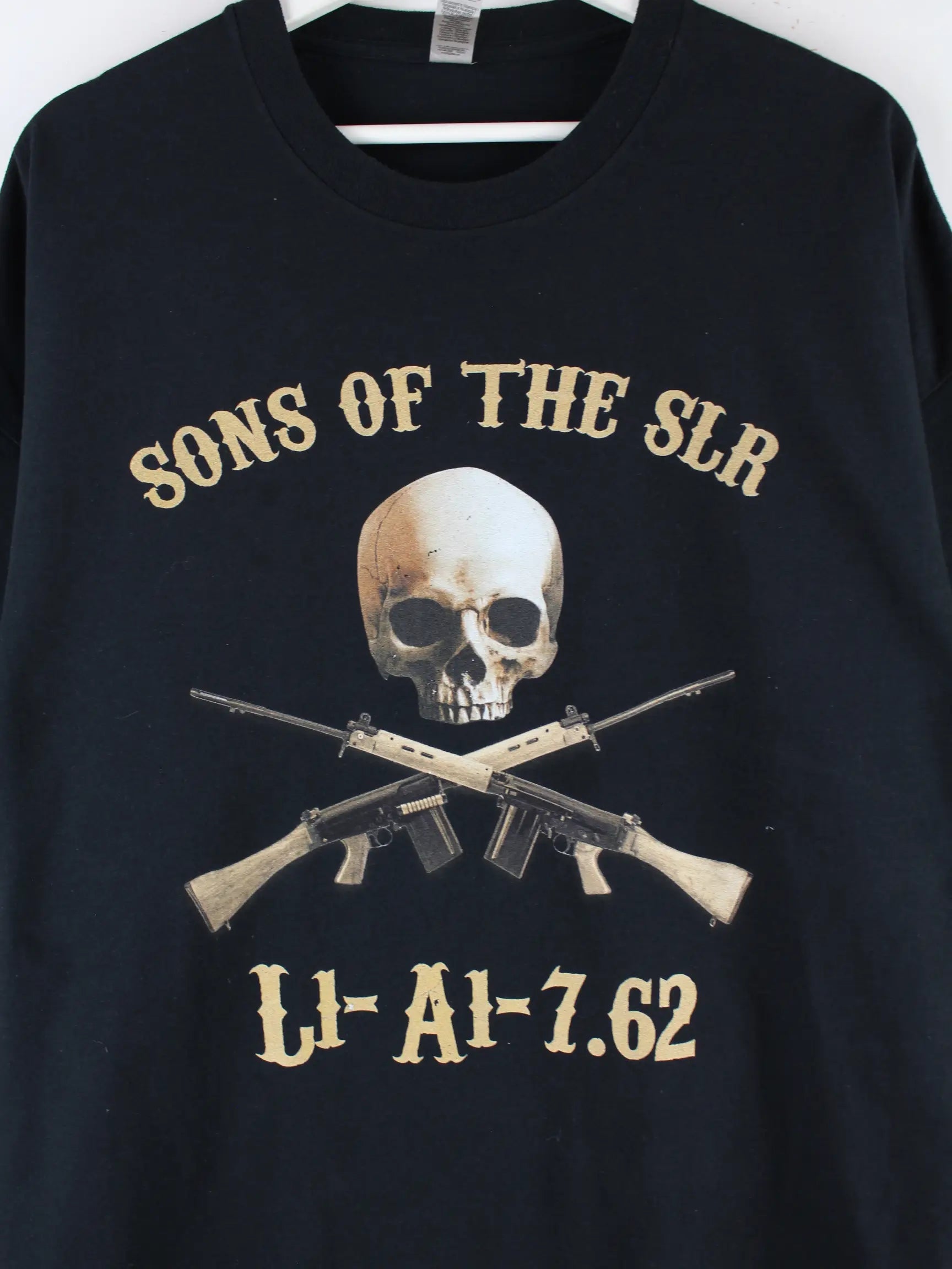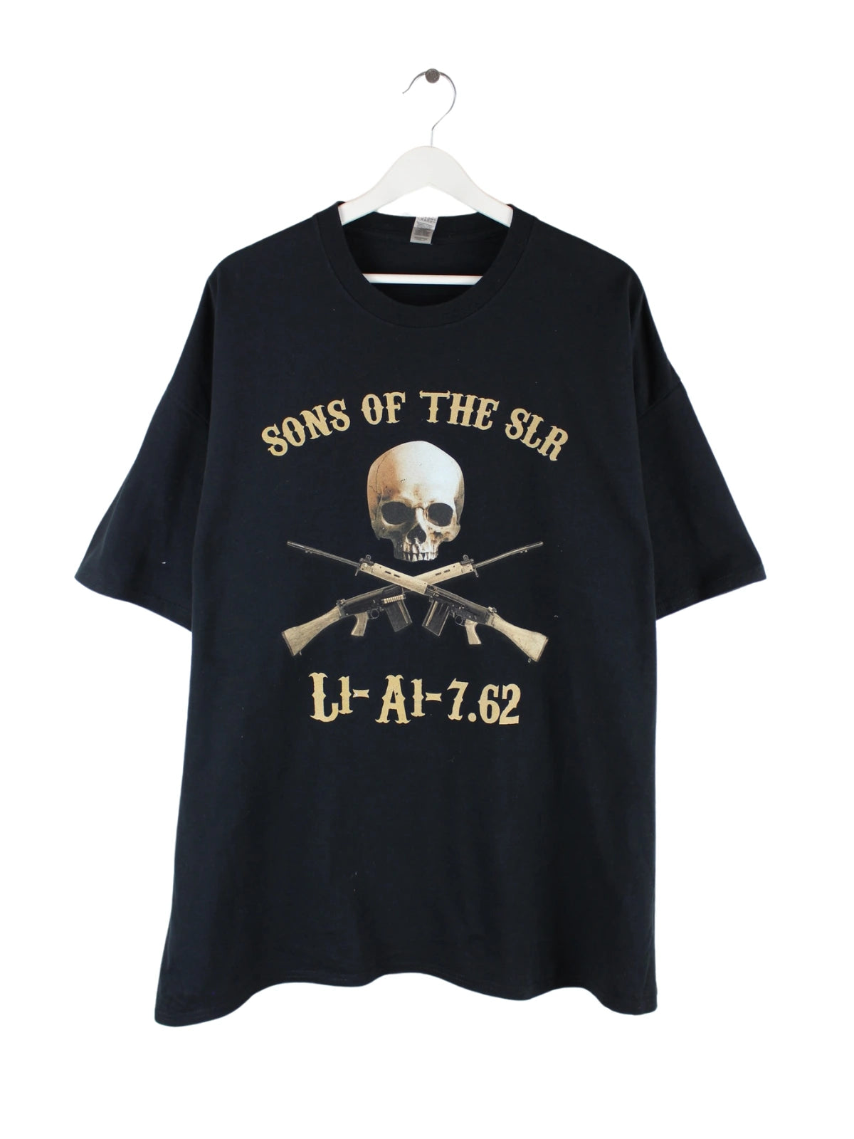 Schwarzes T-Shirt des Labels Gildan in Größe XXL. Es ist aus Baumwolle und in sehr gutem Zustand lieferbar. Mit schickem Skull Print.