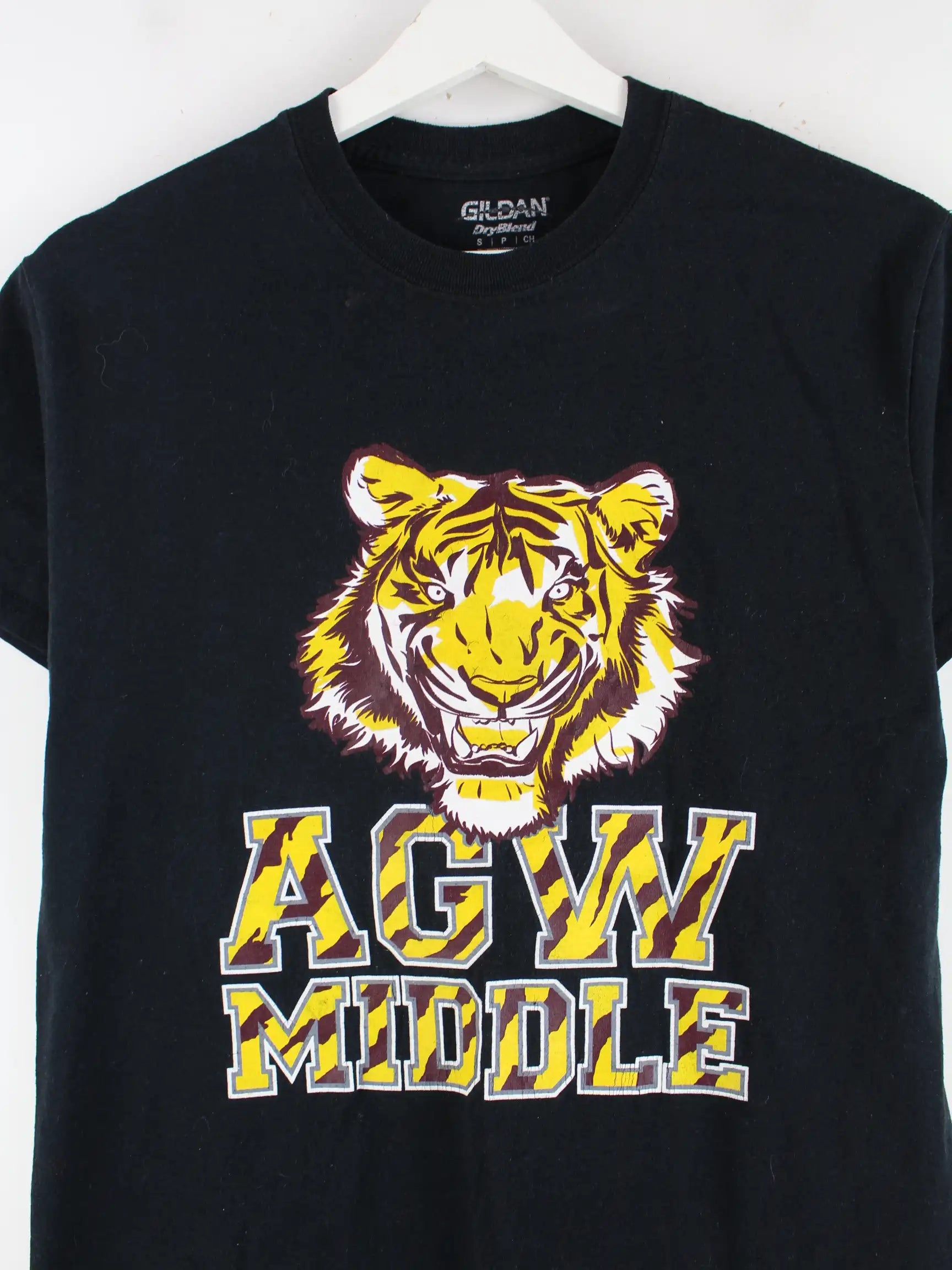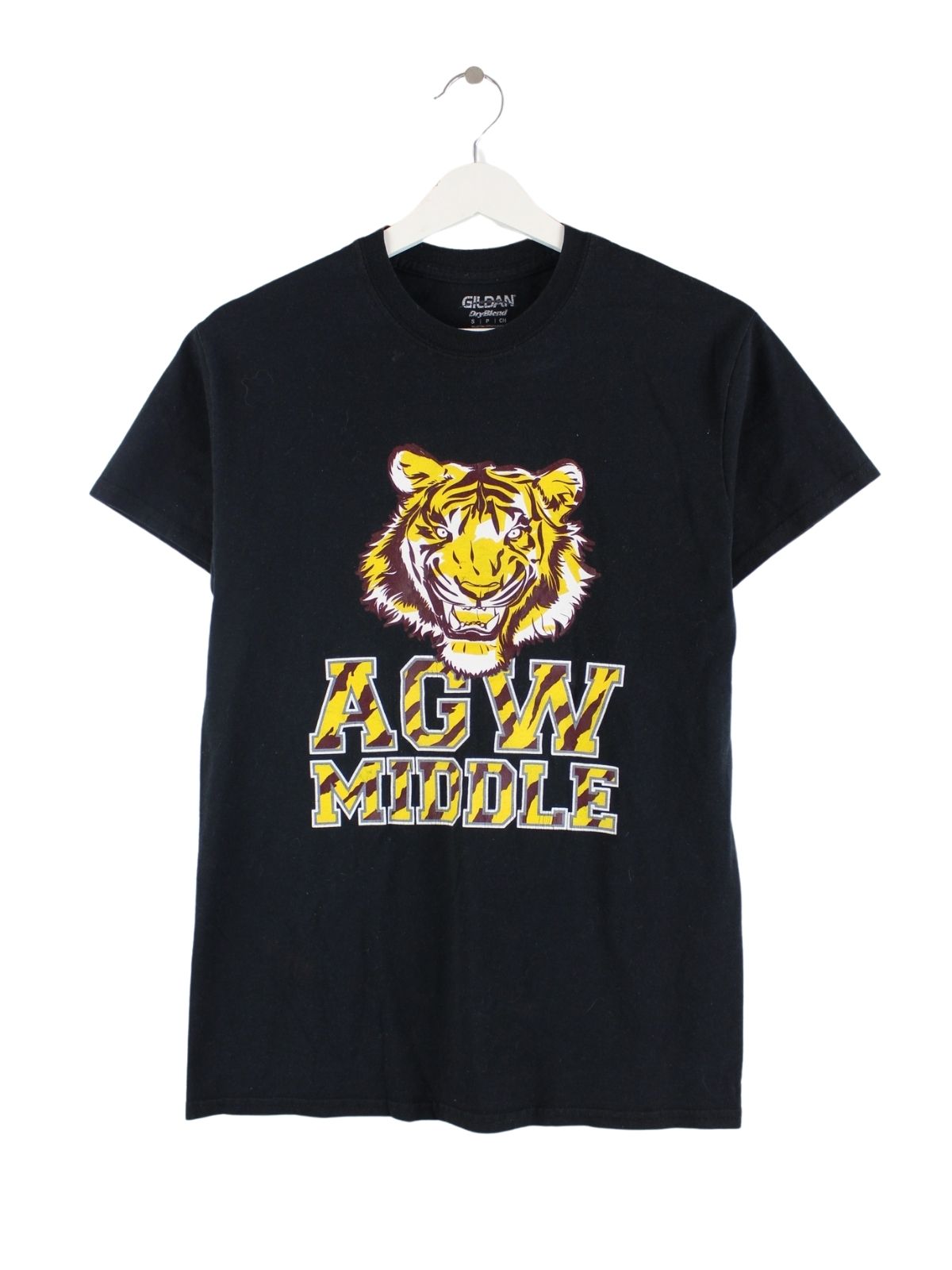T-Shirt der Marke Gildan in Größe S. Es ist aus Baumwolle hergestellt und in Schwarz vorrätig. Mit tollem Tiger Print.