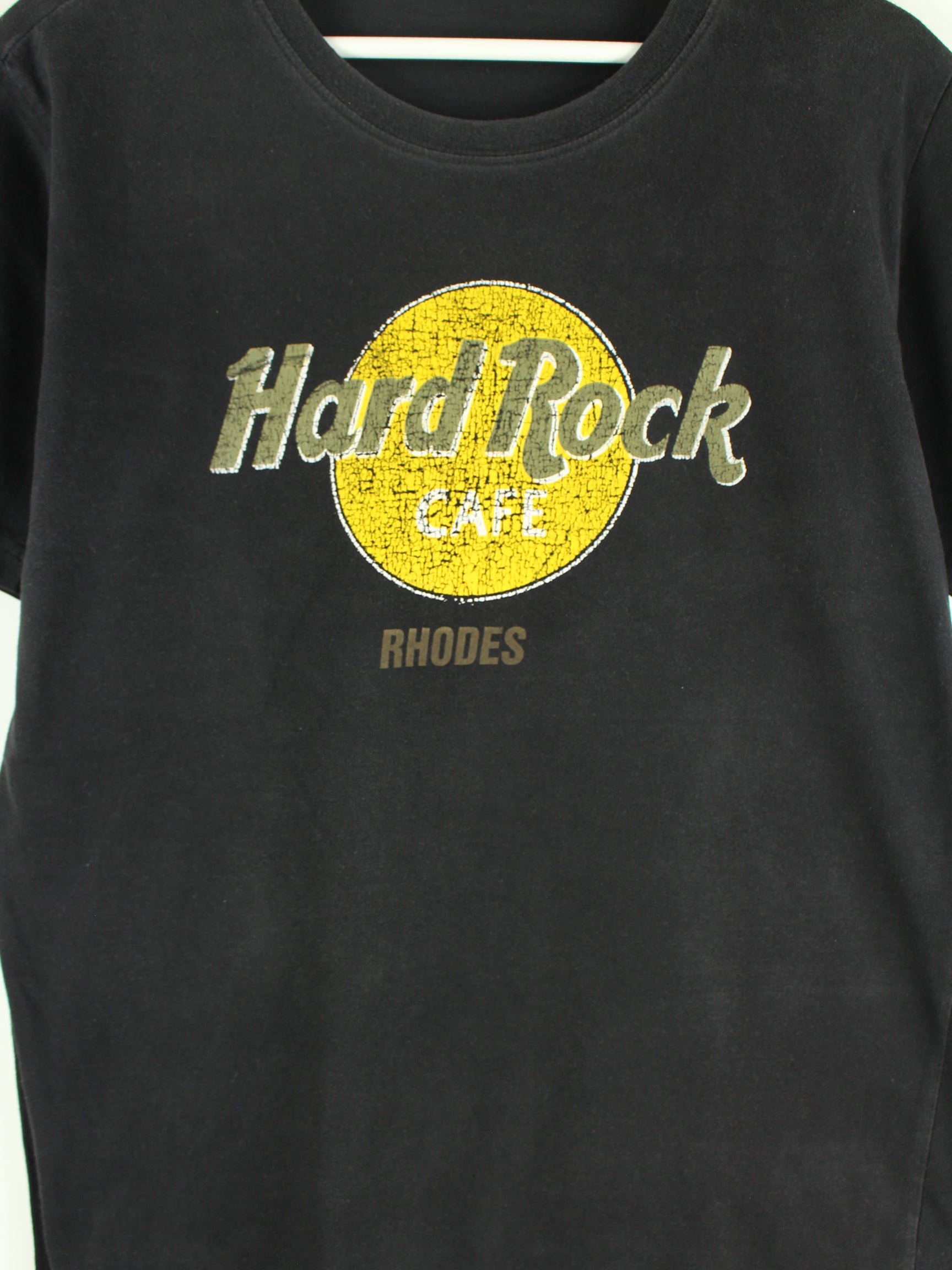 Black T-shirt from the Hard Rock Cafe label in size XS. It is made of cotton and is available from us in very good condition. With a rare Rhodes print.
