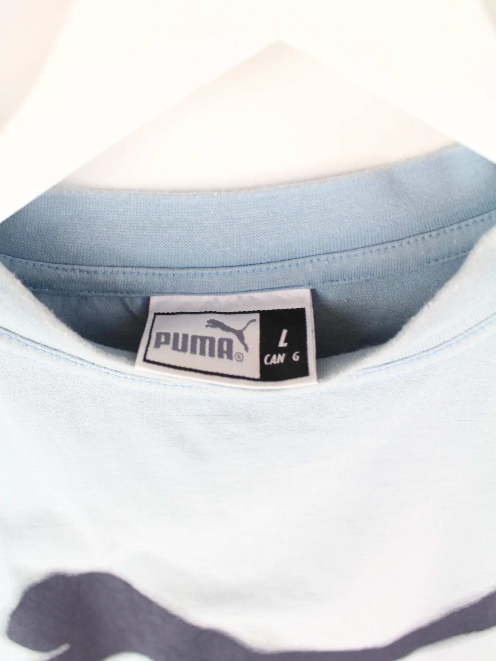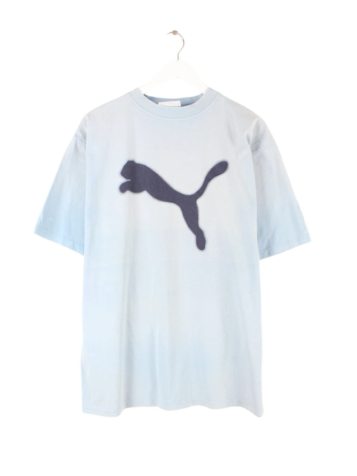 T-Shirt vom Label Puma in Größe L. Es ist aus Baumwolle gemacht und in Blau in Stock. Mit schickem Logo Print.