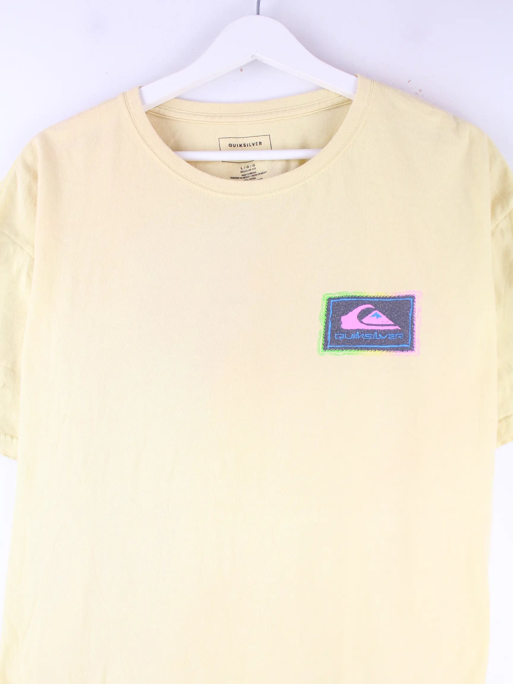 Gelbes T-Shirt des Labels Quiksilver in Größe L. Es ist aus Baumwolle produziert und in gutem Zustand auf Lager. Mit seltenem Print.