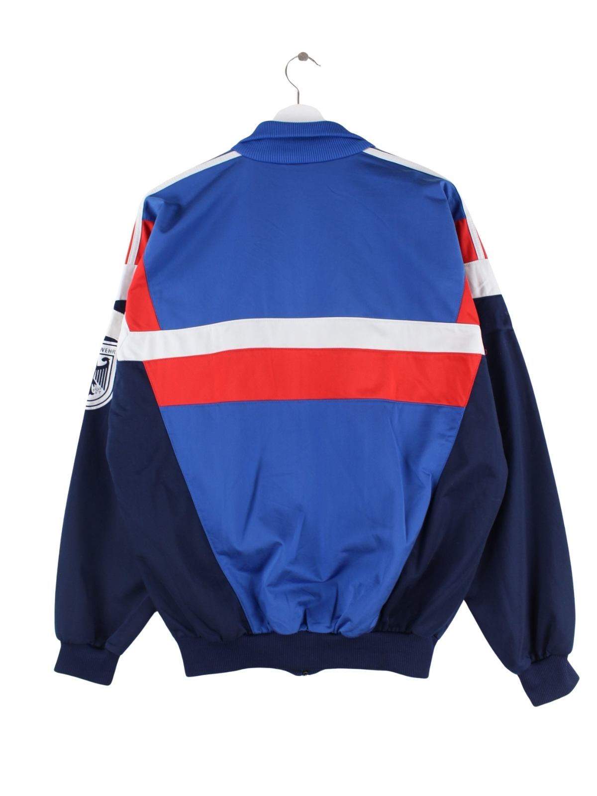Blaue Trainingsjacke von Adidas aus den 90'ern in Größe L. Sie ist aus Synthetik gefertigt und in gutem Zustand auf Lager.