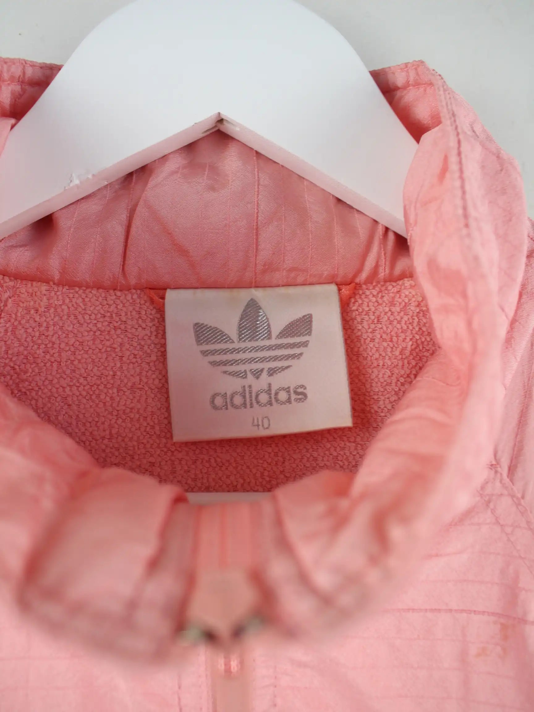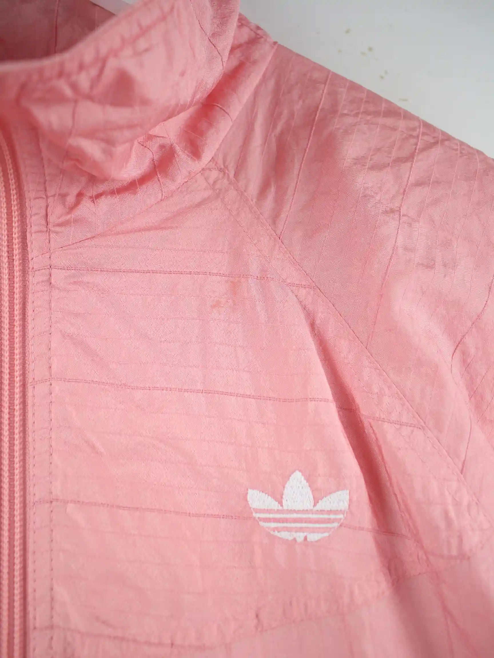 Rosafarbene Leichte Jacke vom Label Adidas aus den 80'ern in Größe L. Sie ist aus Synthetik produziert und in gutem Zustand im Bestand.