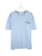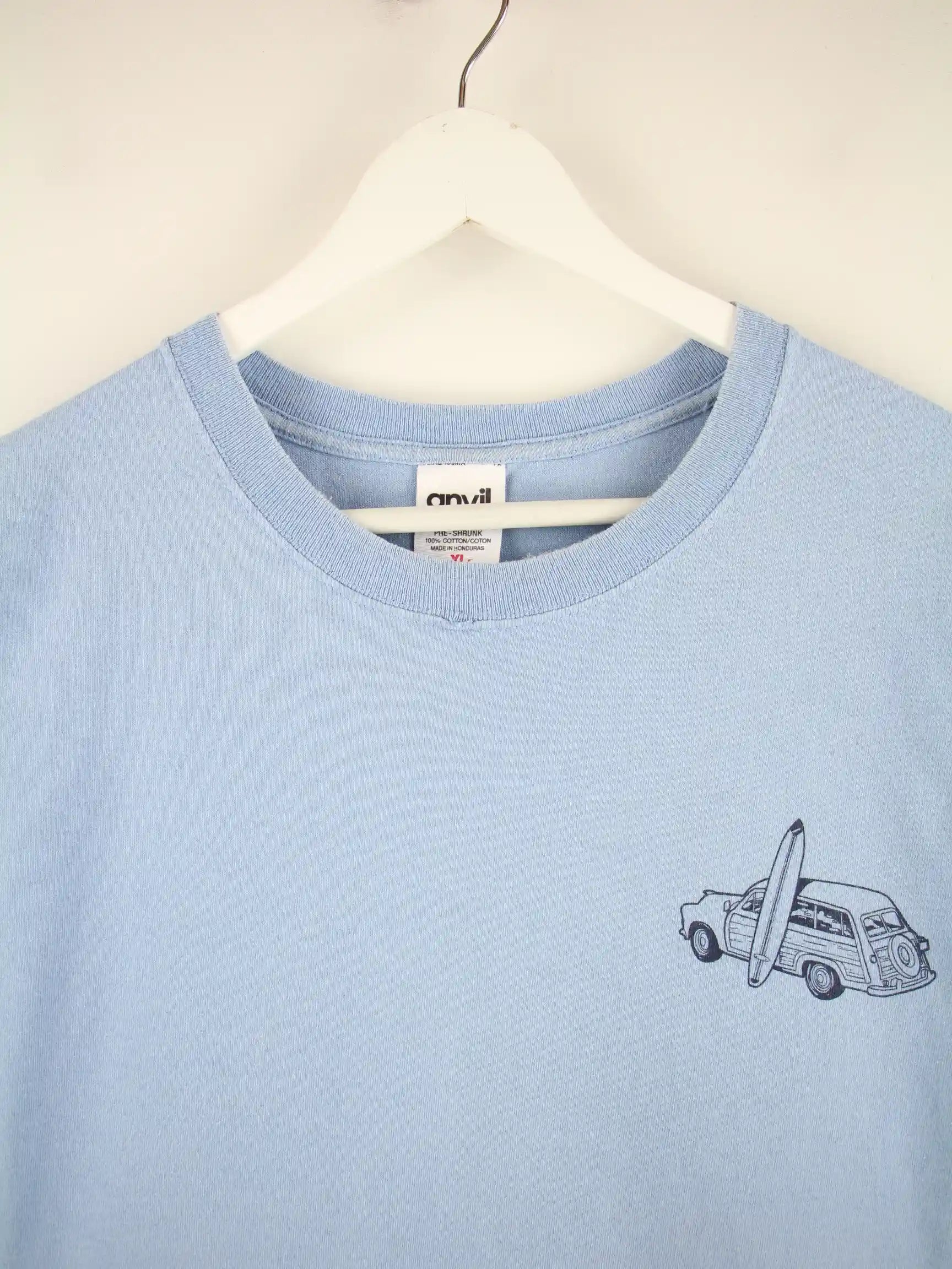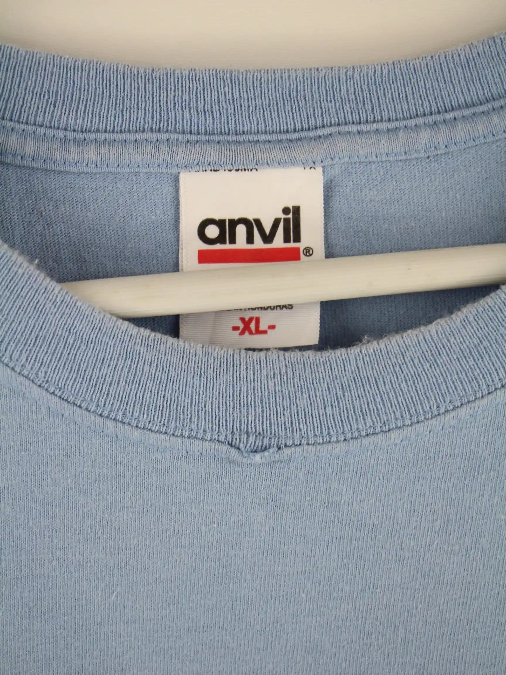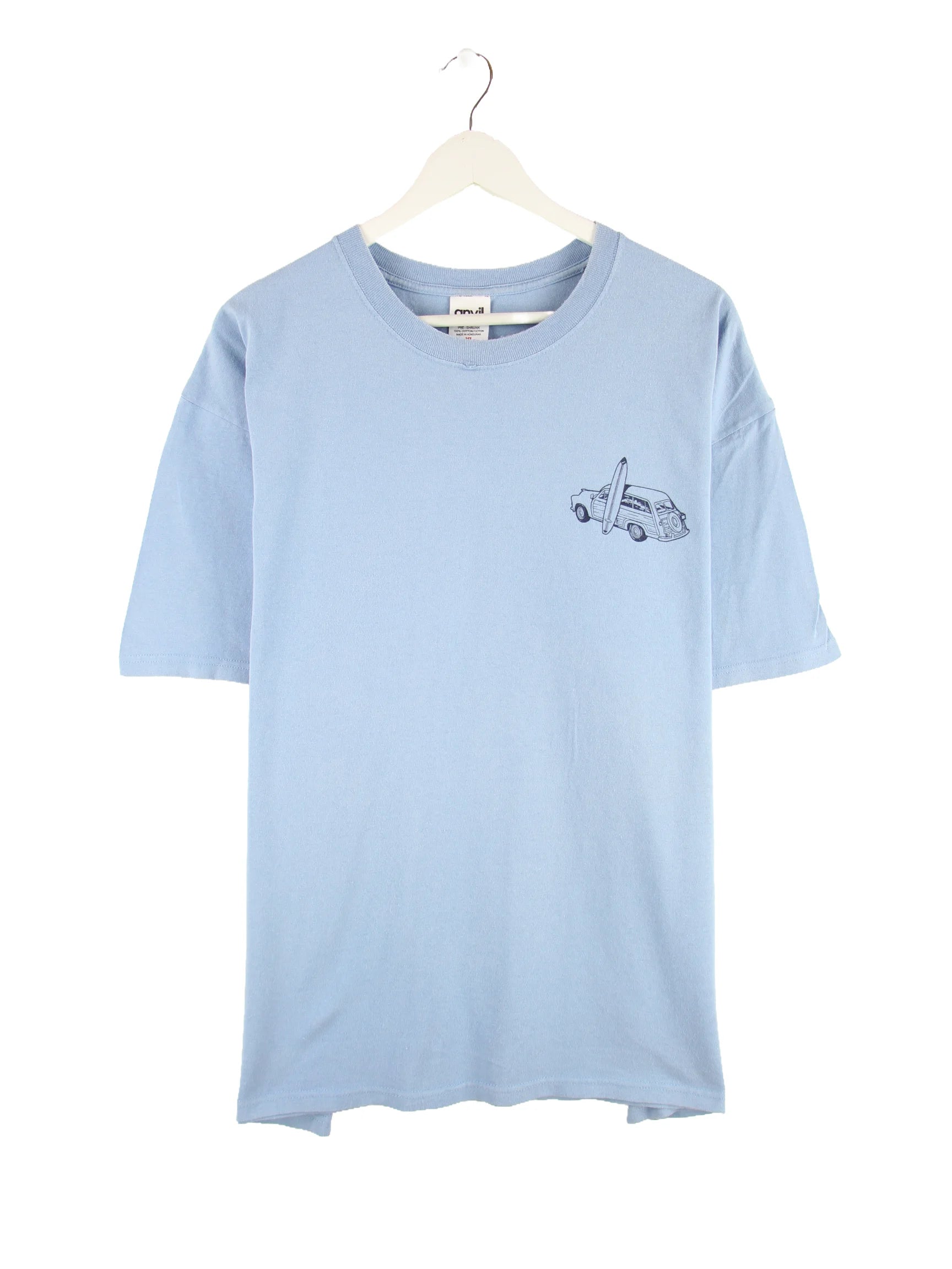 Blaues T-Shirt vom Brand Anvil in Größe XL. Es ist aus Baumwolle produziert und in gutem Zustand auf Lager. Mit chiquem Surfer Print.
