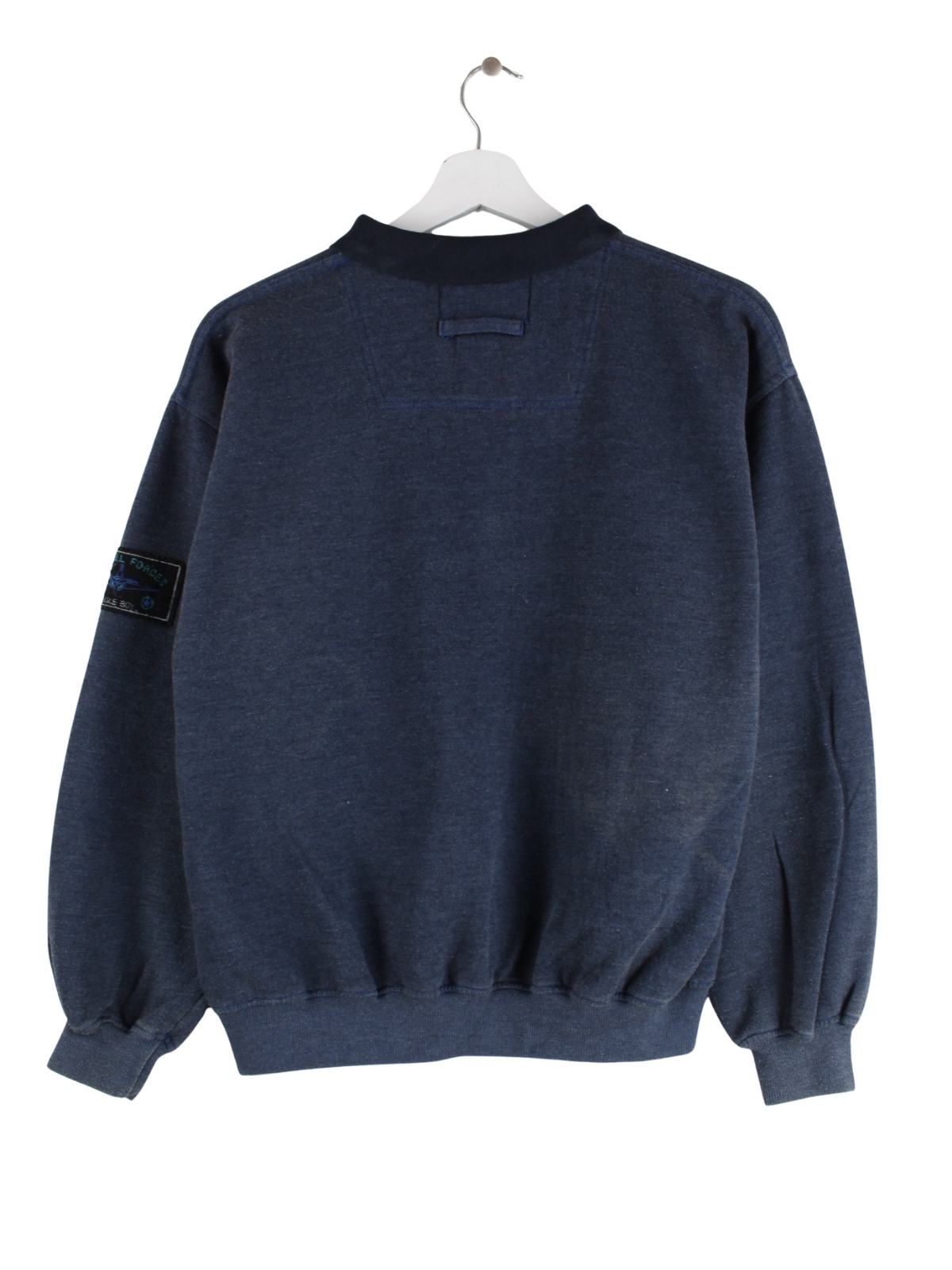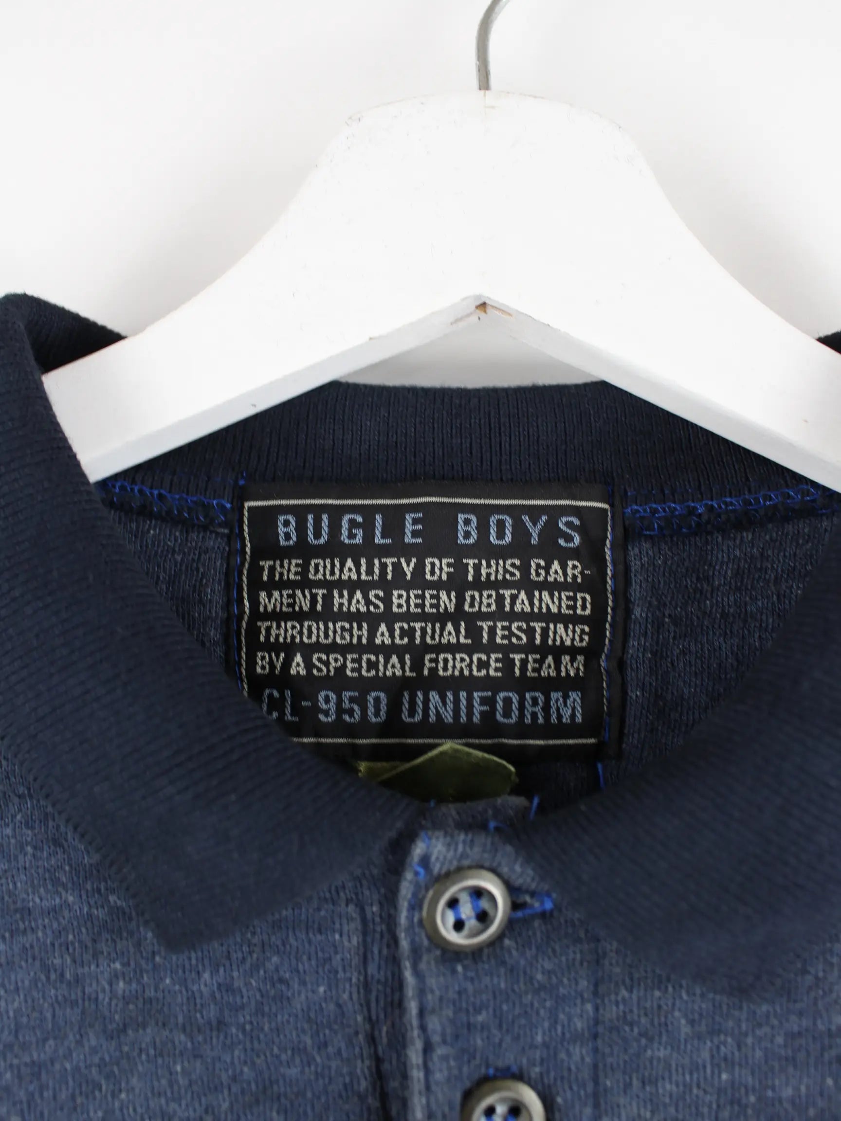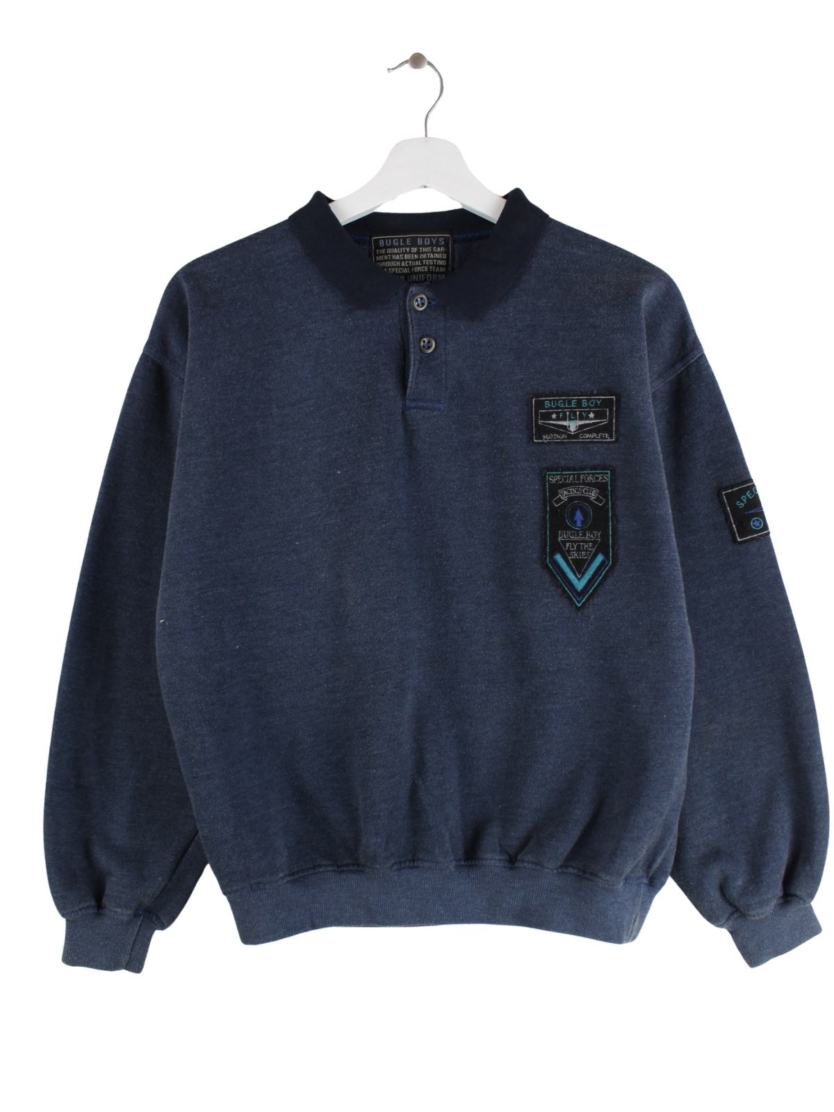 Blauer Sweater des Labels Bugle Boy aus den 90'ern in Größe XS. Er ist aus einer Baumwollmischung hergestellt. Den Zustand würden wir als 'In Ordnung' bezeichnen (vergl. Bilder).
