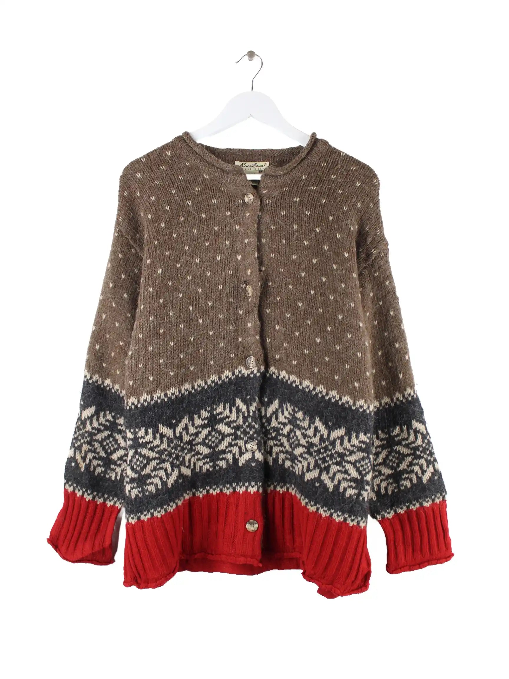Strickjacke vom Brand Eddie Bauer in Größe XL. Sie ist aus Wolle hergestellt und in Braun zu bekommen.