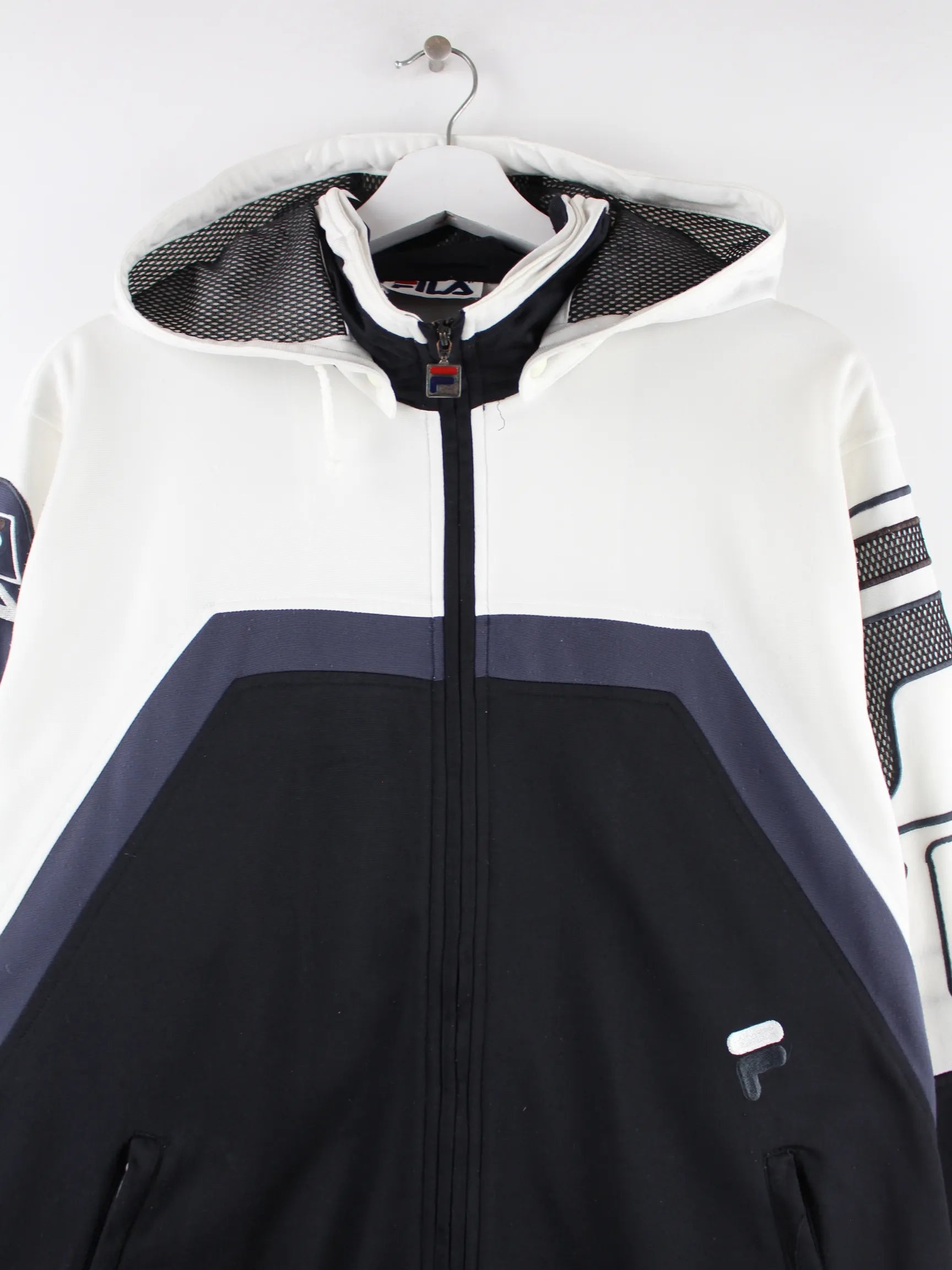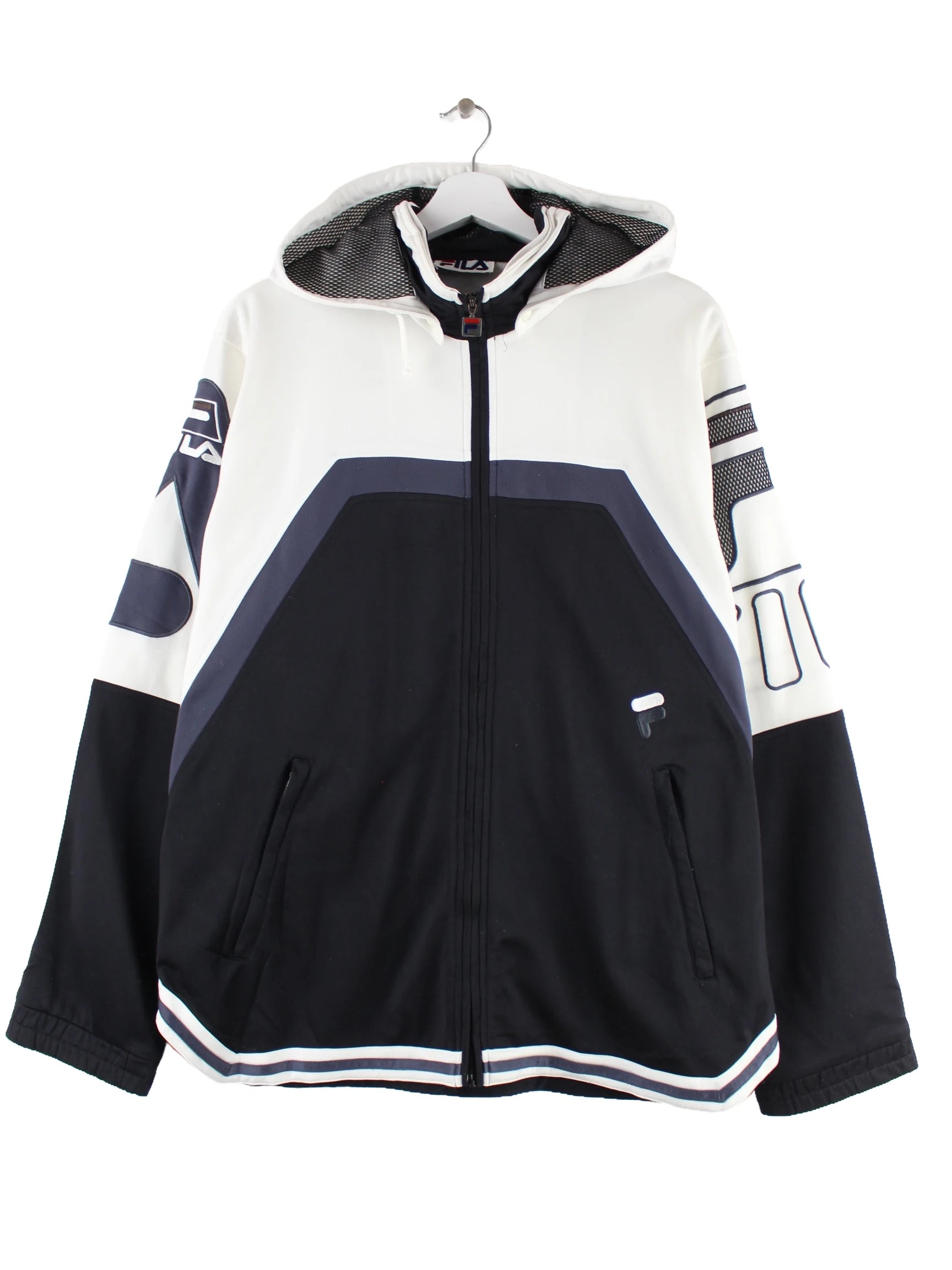 Hoodie vom Label Fila mit langem Reißverschluß in Größe M. Er ist aus Synthetik gefertigt und in Schwarz bei uns zu bekommen.