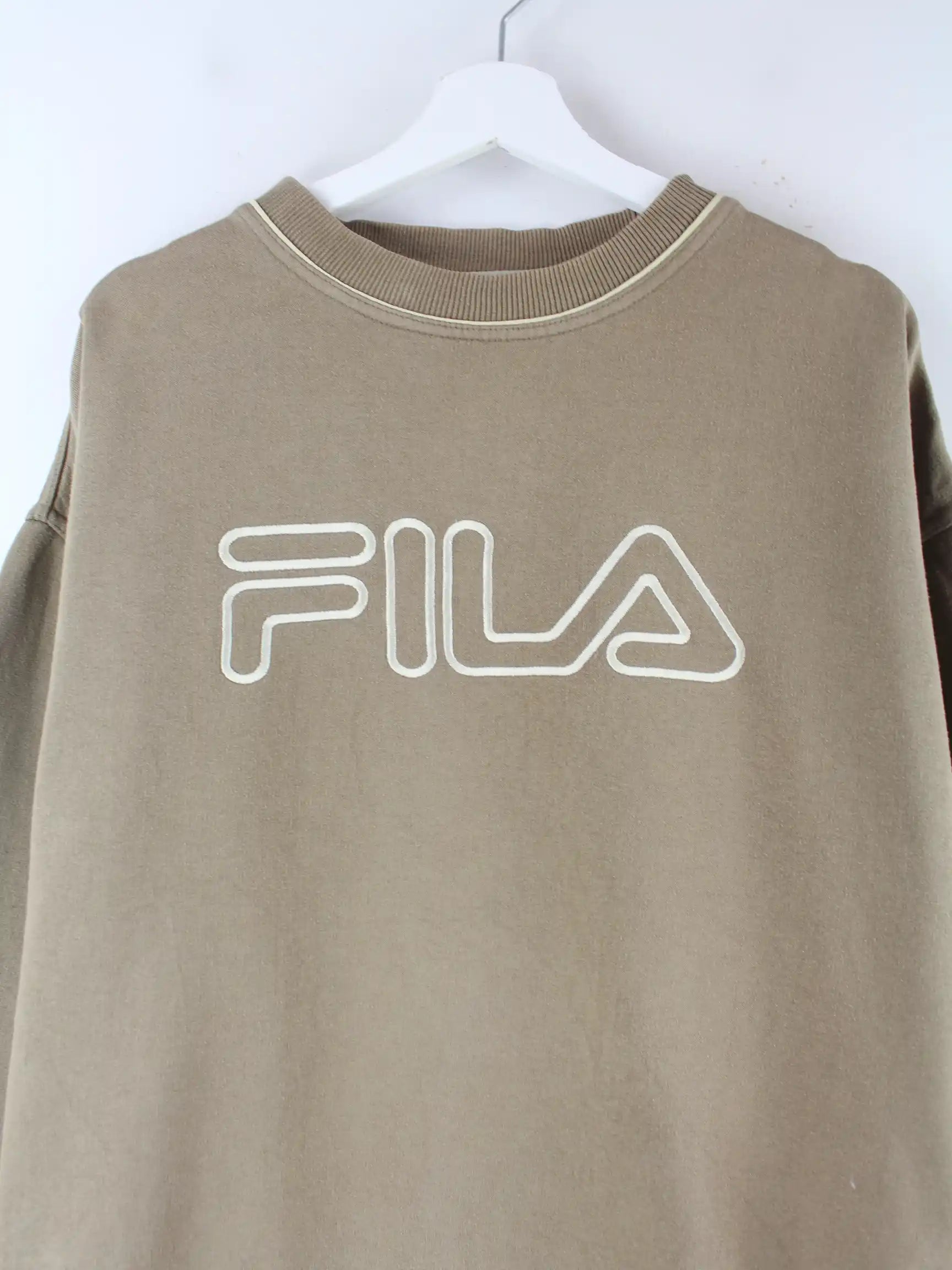 Sweater von Fila mit gestickten Motiven in Größe XXL aus den 90'ern. Er ist aus einer Baumwollmischung hergestellt und in Braun bei uns zu bekommen.