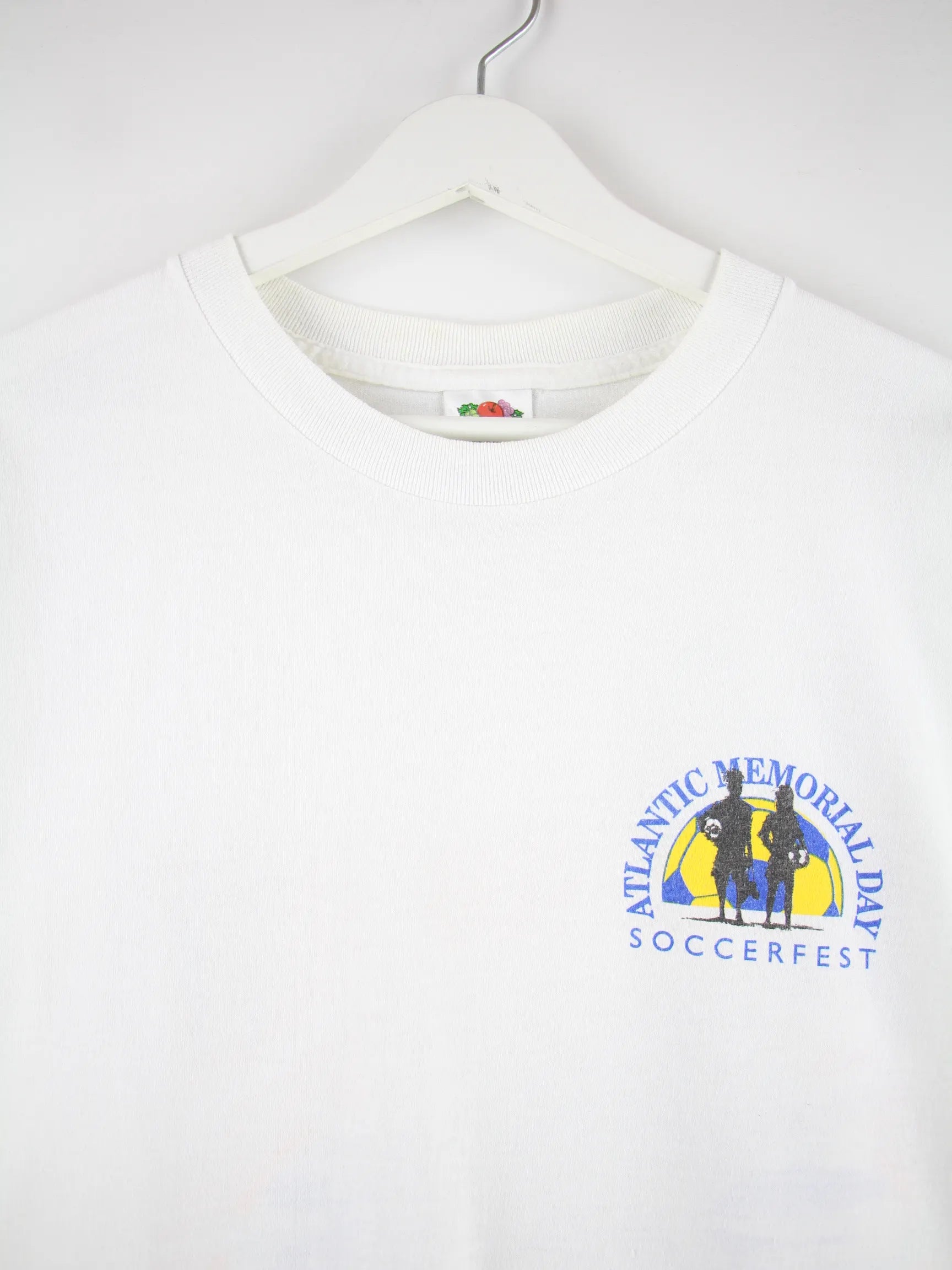 T-Shirt von Fruit of the Loom in Größe XL. Es ist aus Baumwolle gemacht und in Weiß bei uns vorrätig. Mit schickem Soccerfest Print.