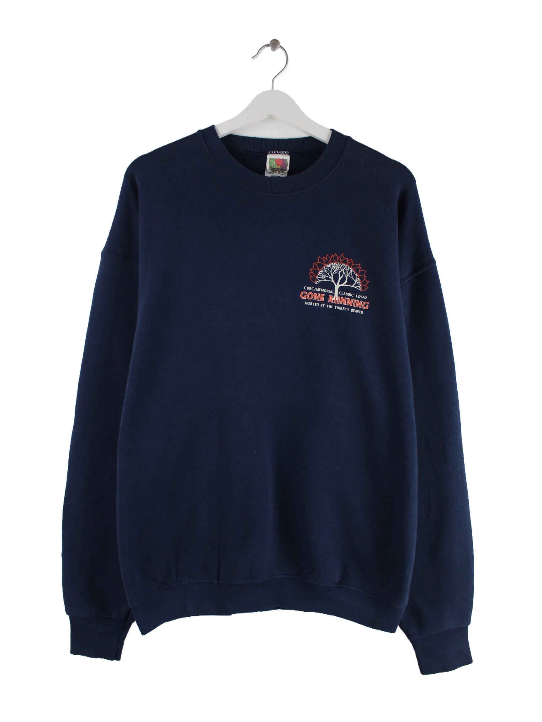 Blauer Sweater vom Label Fruit of the Loom in Größe XL. Er ist aus einer Baumwollmischung angefertigt und in sehr gutem Zustand lieferbar. Mit seltenem Run Print.