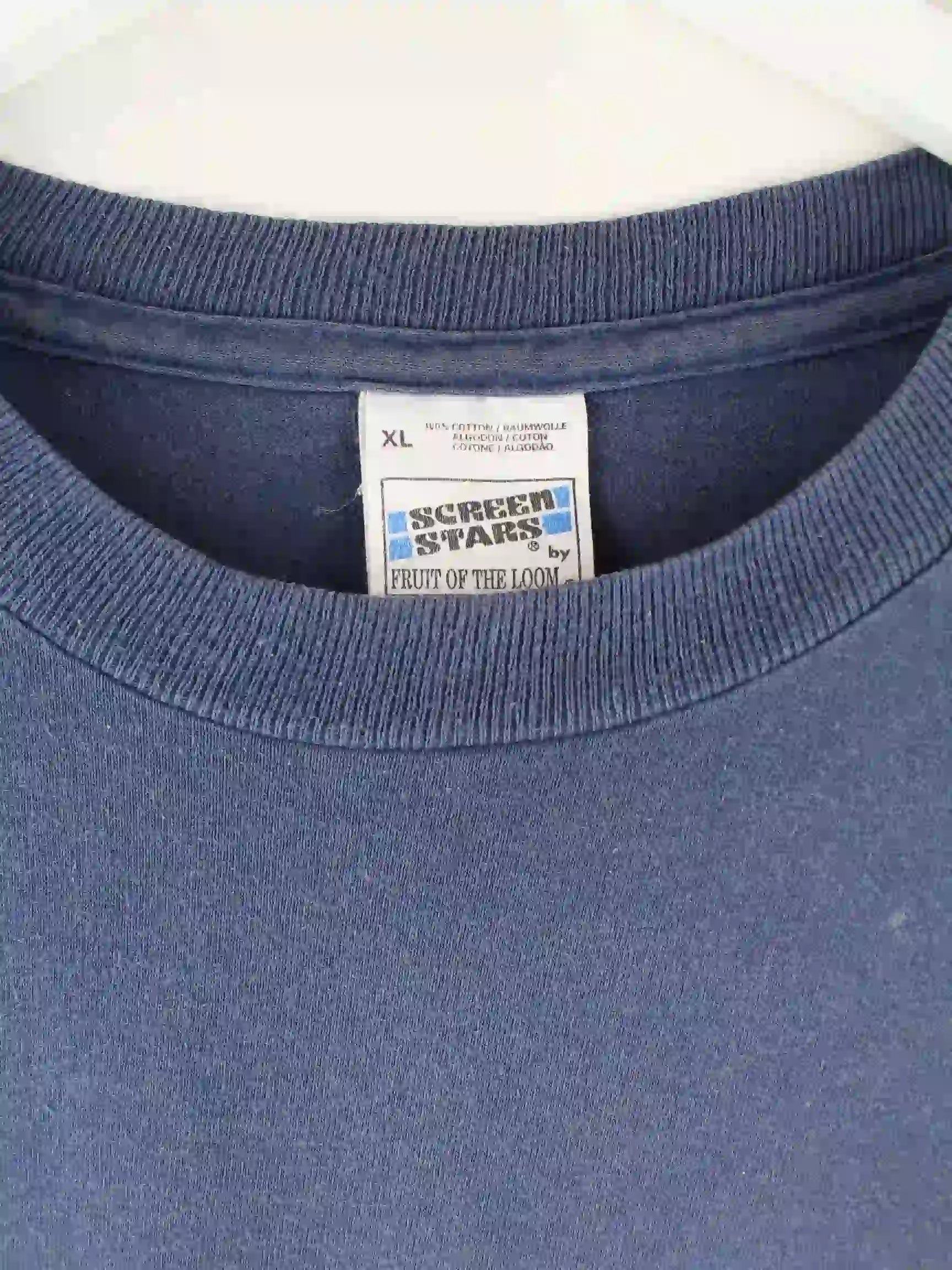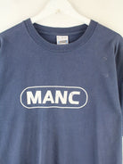 Blaues T-Shirt vom Label Fruit of the Loom aus den 90'ern in Größe XL. Es ist aus Baumwolle und in gutem Zustand im Angebot. Mit tollem Manc Print.