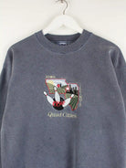 Grauer Sweater aus dem Hause Gildan aus den 90'ern in Größe L. Er ist aus einer Baumwollmischung gemacht und in gutem Zustand vorrätig.