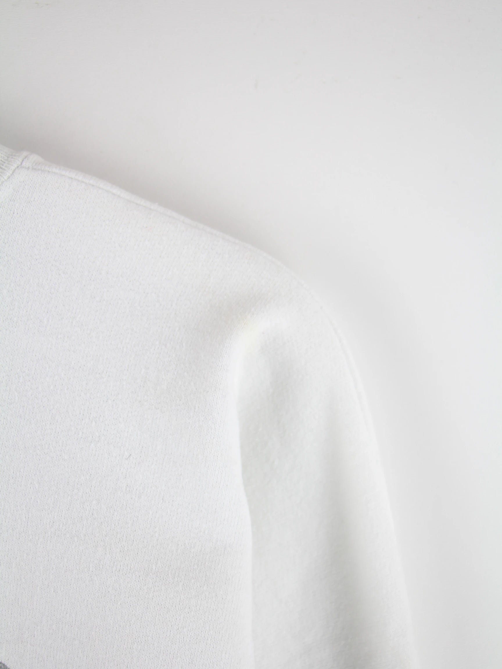 Weißer Sweater vom Label Hanes in Größe L. Er ist aus einer Baumwollmischung gemacht. Den Zustand würden wir als 'In Ordnung' bezeichnen (vergl. Bilder).Mit chiquem Racing Print.