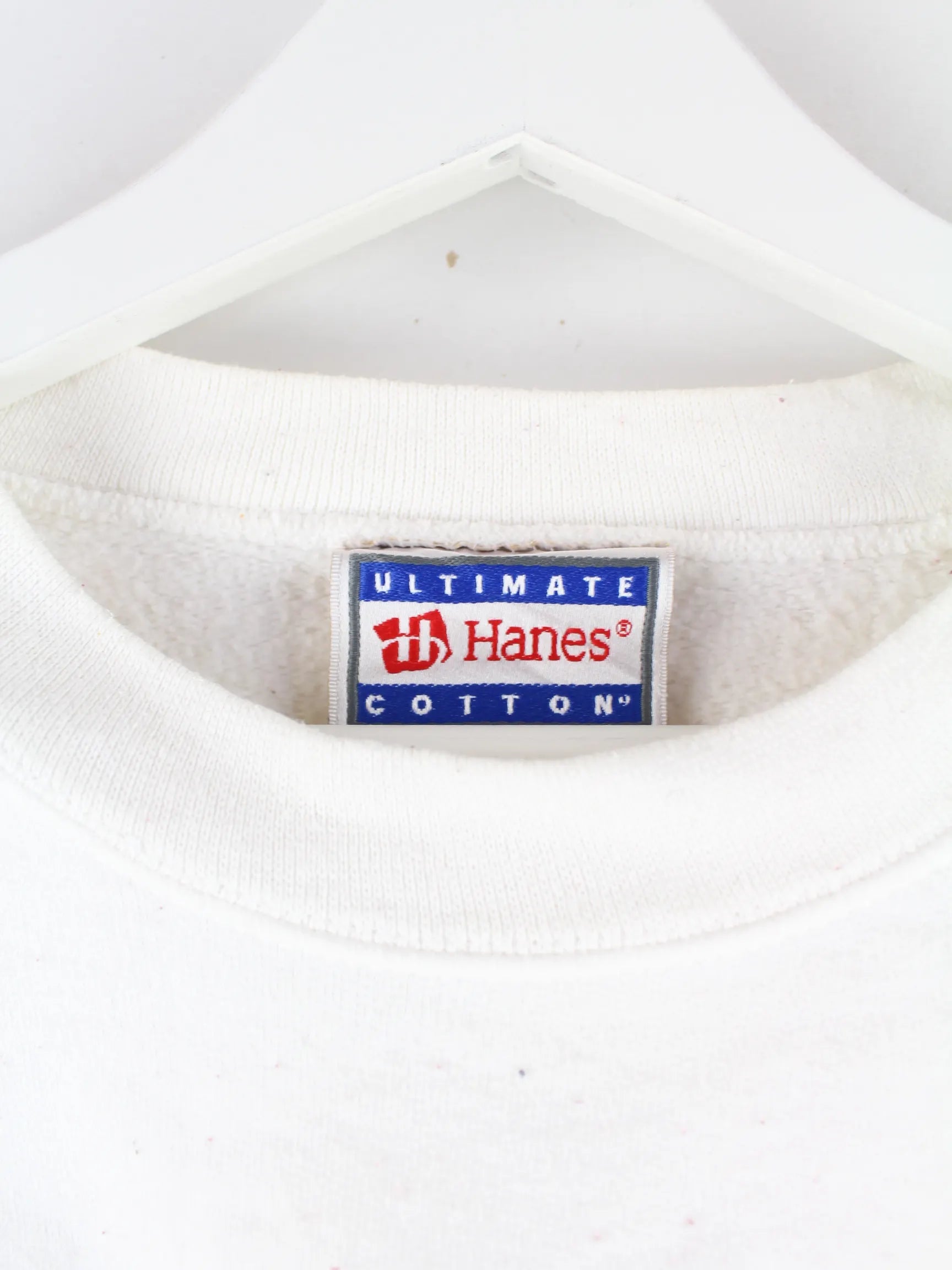 Weißer Sweater vom Brand Hanes aus den 90'ern in Größe XL. Er ist aus einer Baumwollmischung produziert und in gutem Zustand vorrätig. Mit tollem Racing Print.