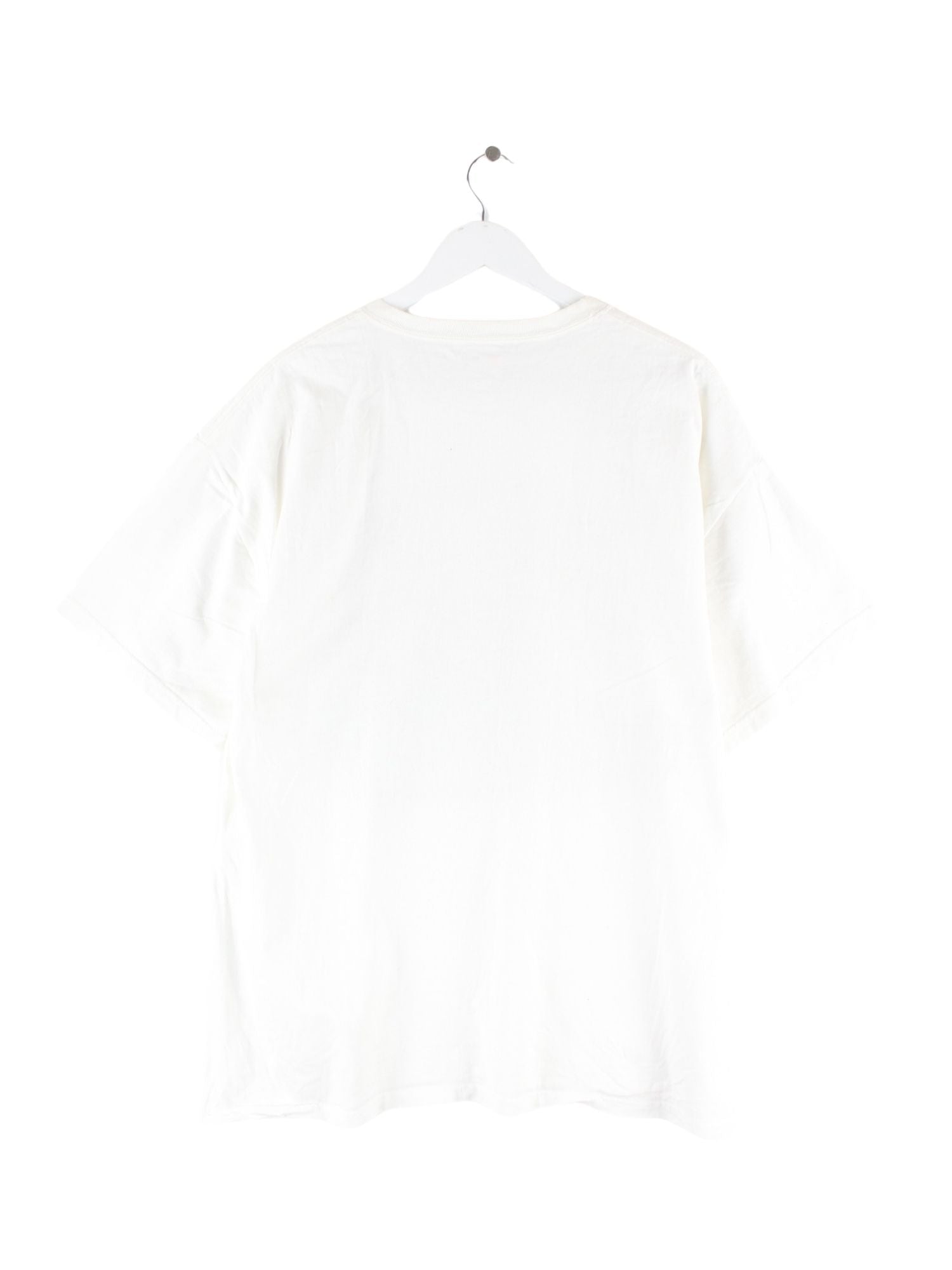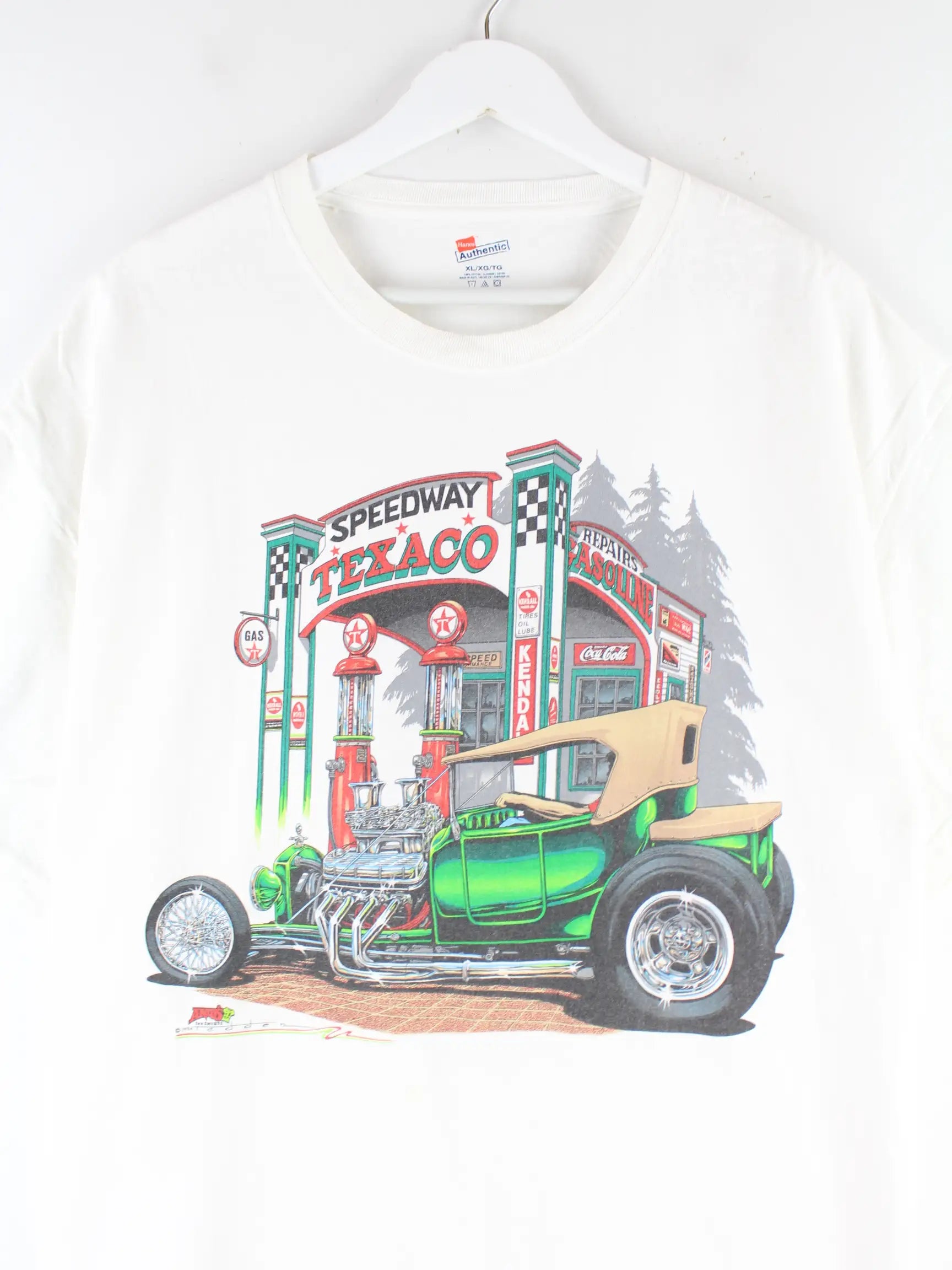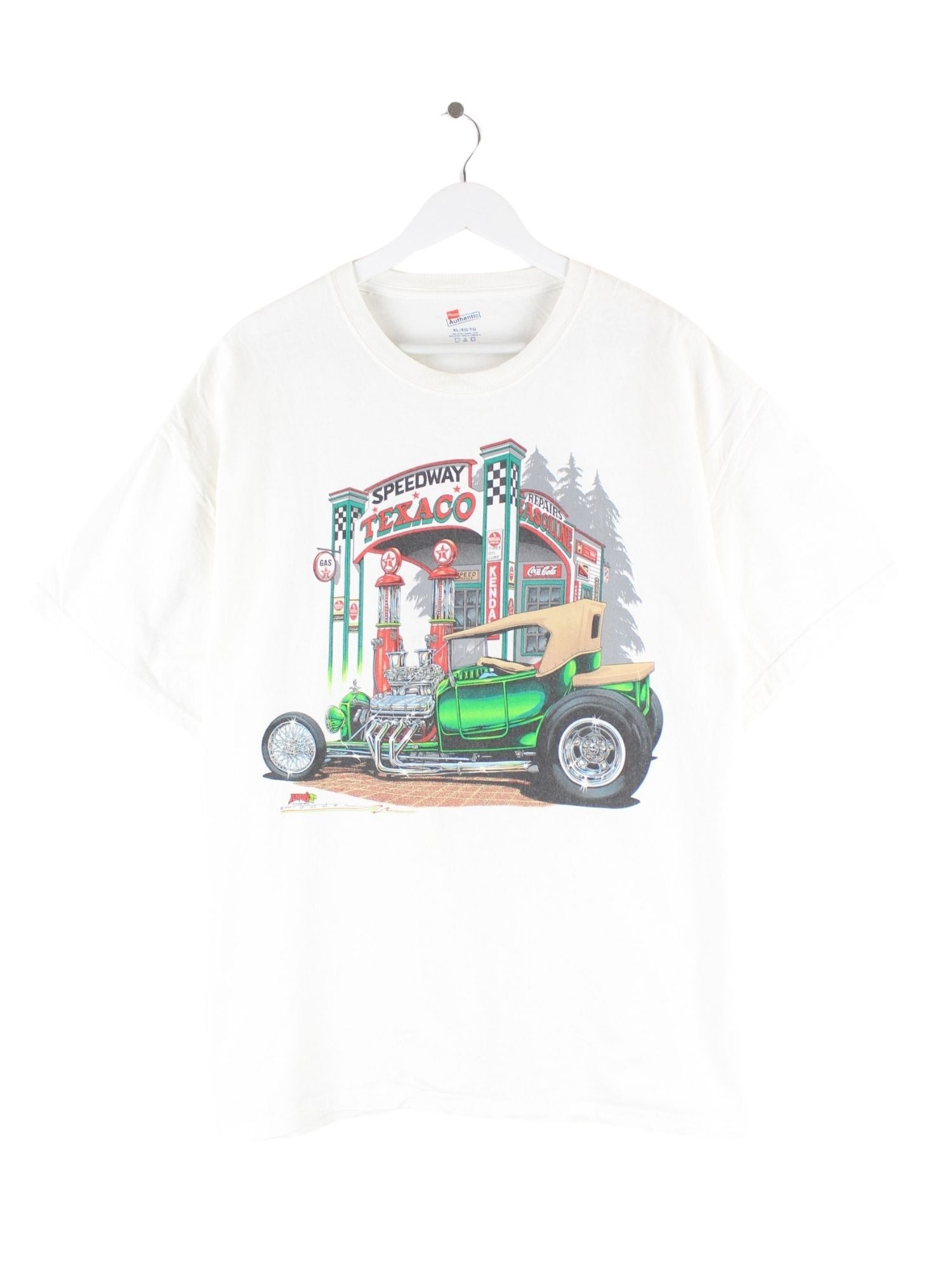 T-Shirt der Marke Hanes in Größe XL. Es ist aus Baumwolle gemacht und in Weiß bei uns zu bekommen. Mit chiquem Car Print.