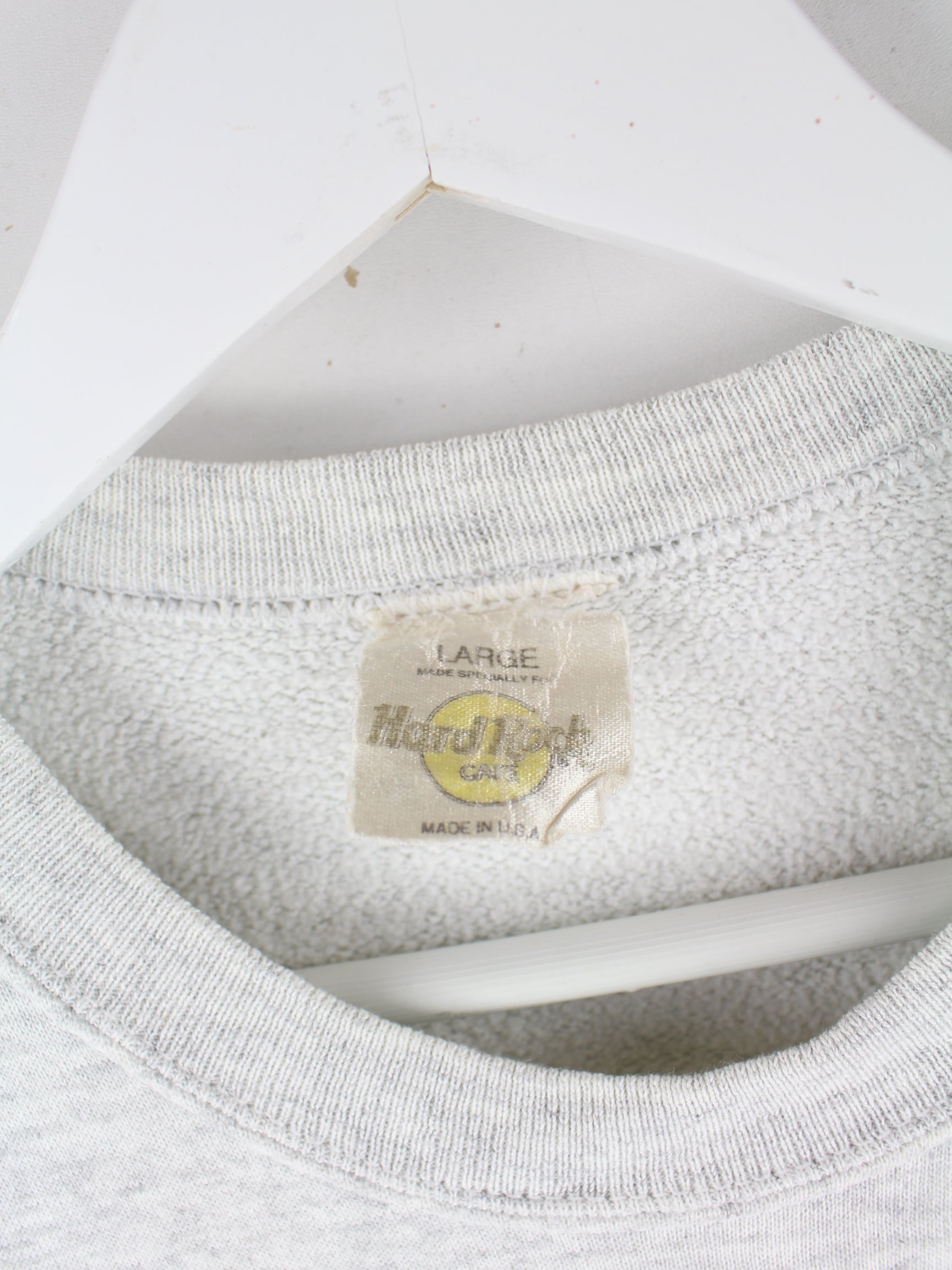 Grauer Sweater mit Stickereien aus dem Hause Hard Rock Cafe aus den 90'ern in Größe M. Er ist aus einer Baumwollmischung angefertigt und in sehr gutem Zustand zu bekommen.