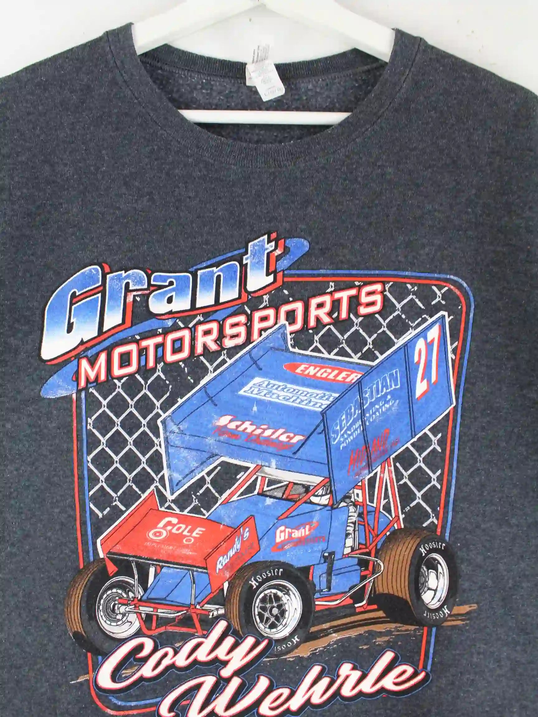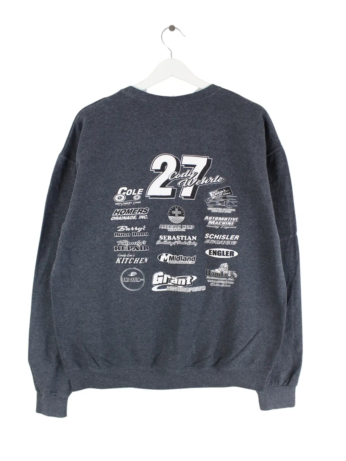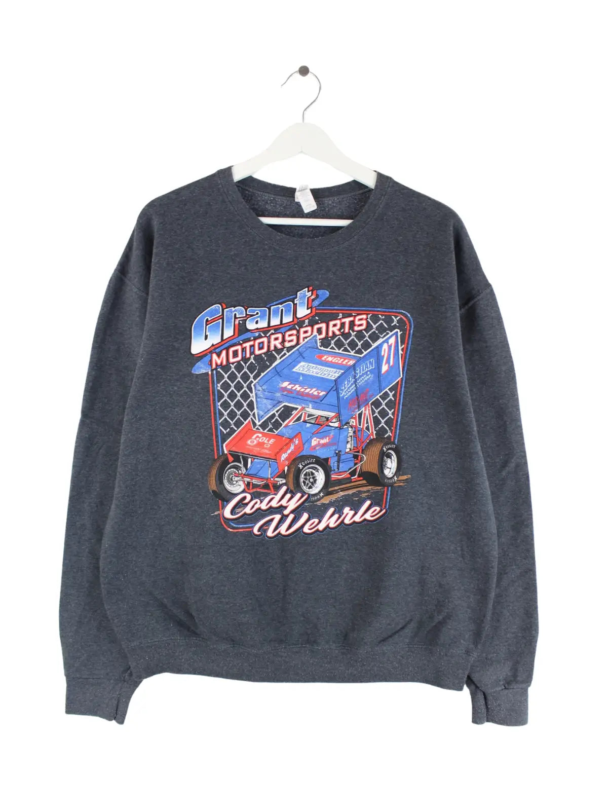 Grauer Sweater vom Brand Jerzees in Größe L. Er ist aus einer Baumwollmischung angefertigt und in sehr gutem Zustand zu bekommen. Mit seltenem Racing Print.