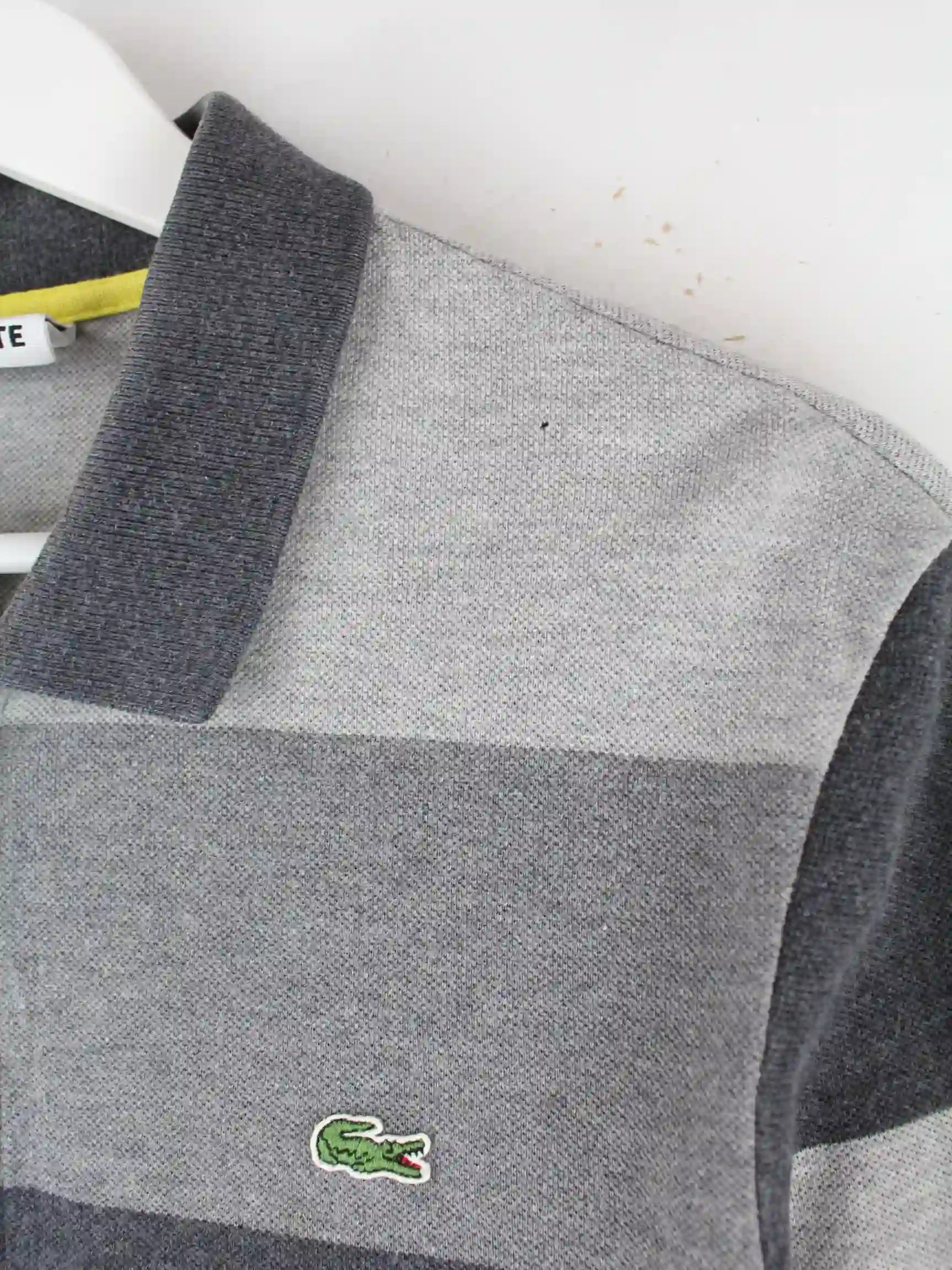 Graues Poloshirt vom Label Lacoste in Größe M. Es ist aus Baumwolle hergestellt und in gutem Zustand im Angebot.