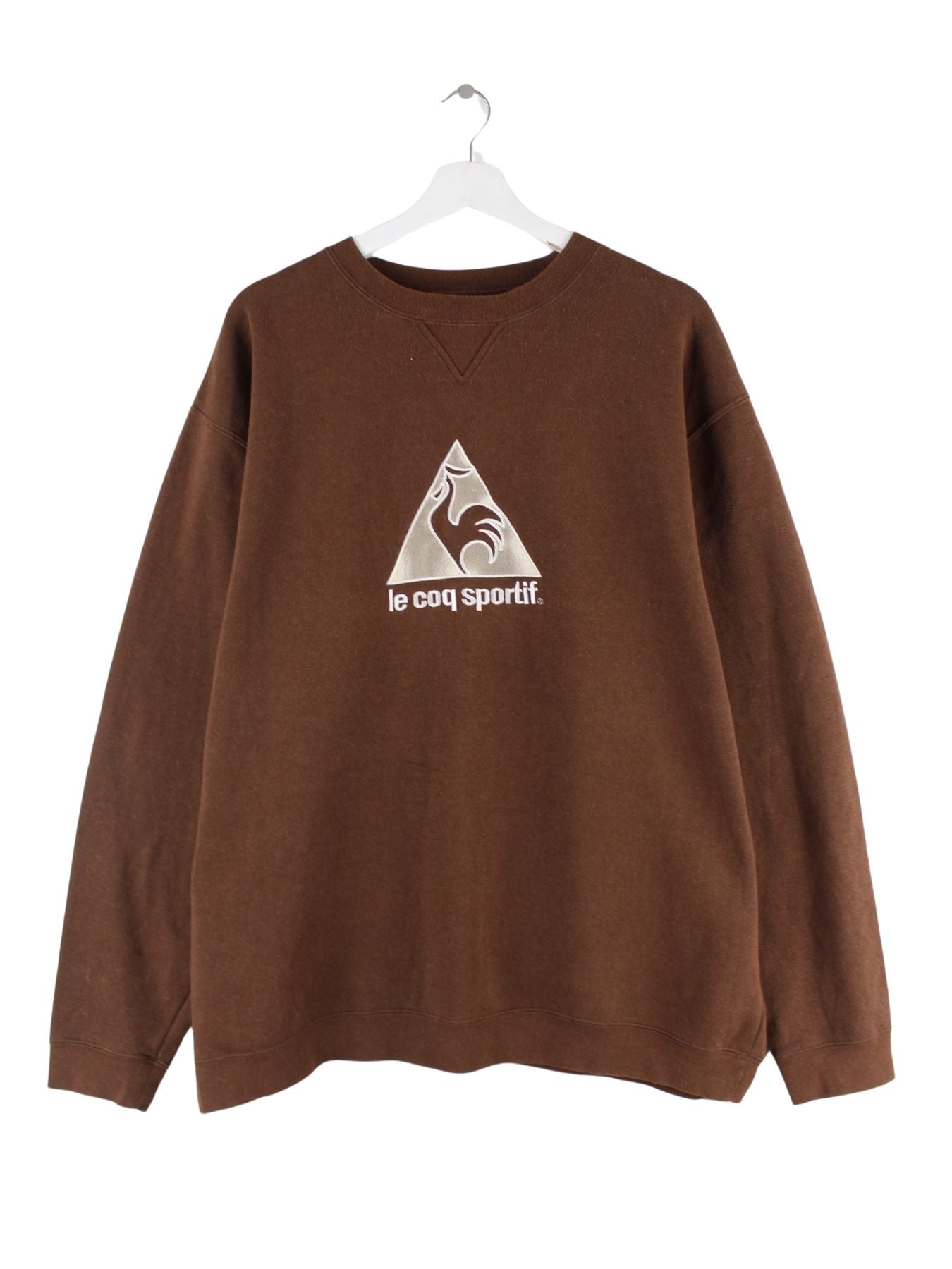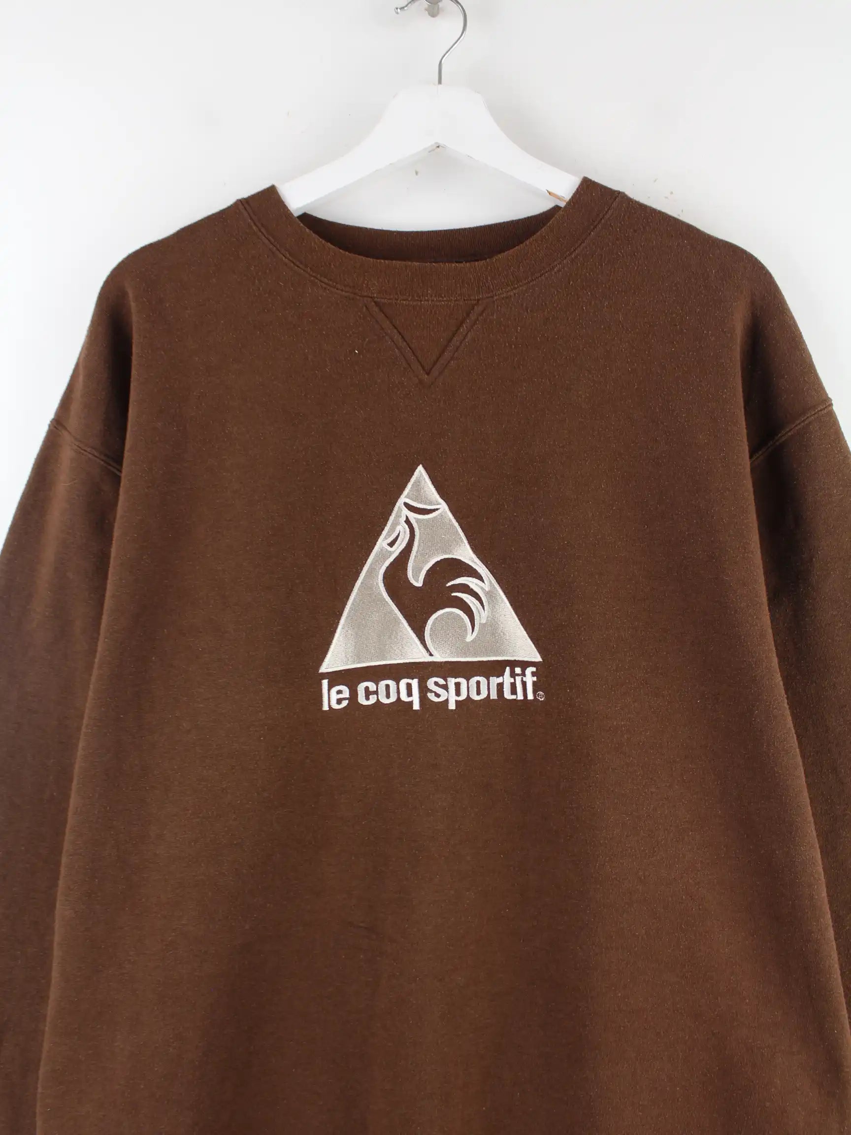 Brauner Sweater mit gestickten Motiven des Labels Le Coq Sportif in Größe XXL. Er ist aus einer Baumwollmischung hergestellt und in sehr gutem Zustand bei uns zu bekommen.