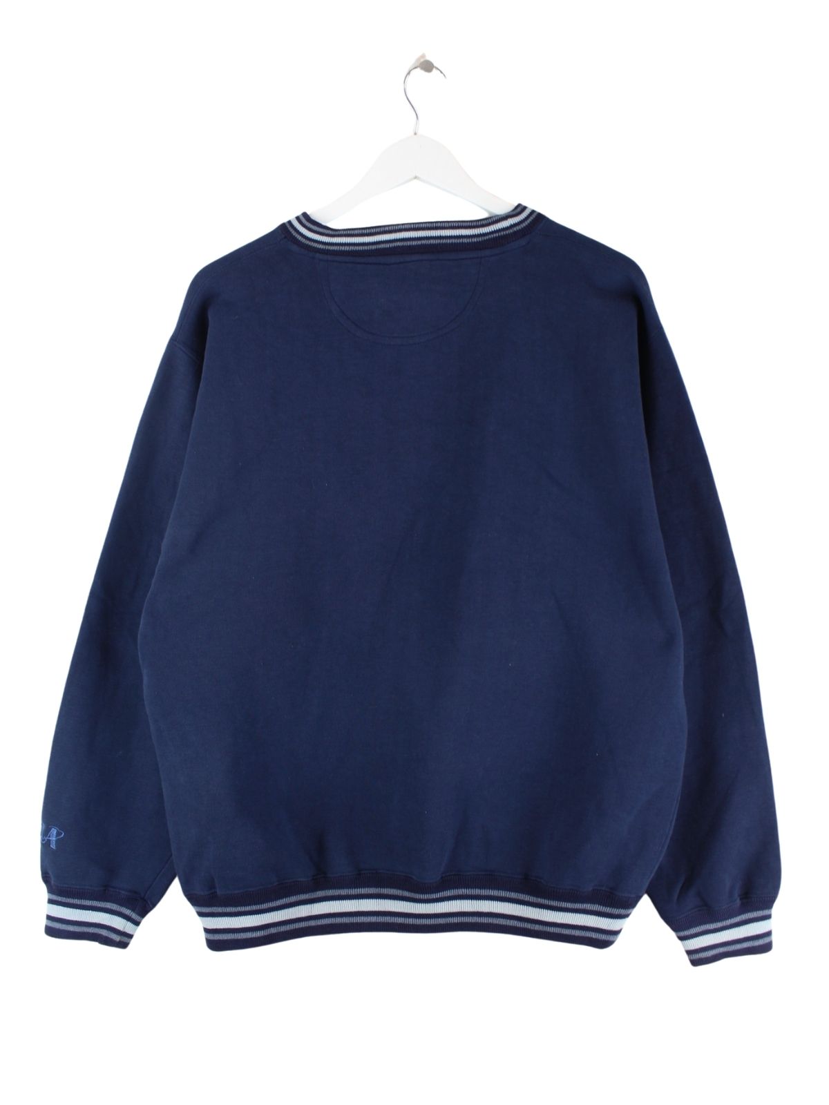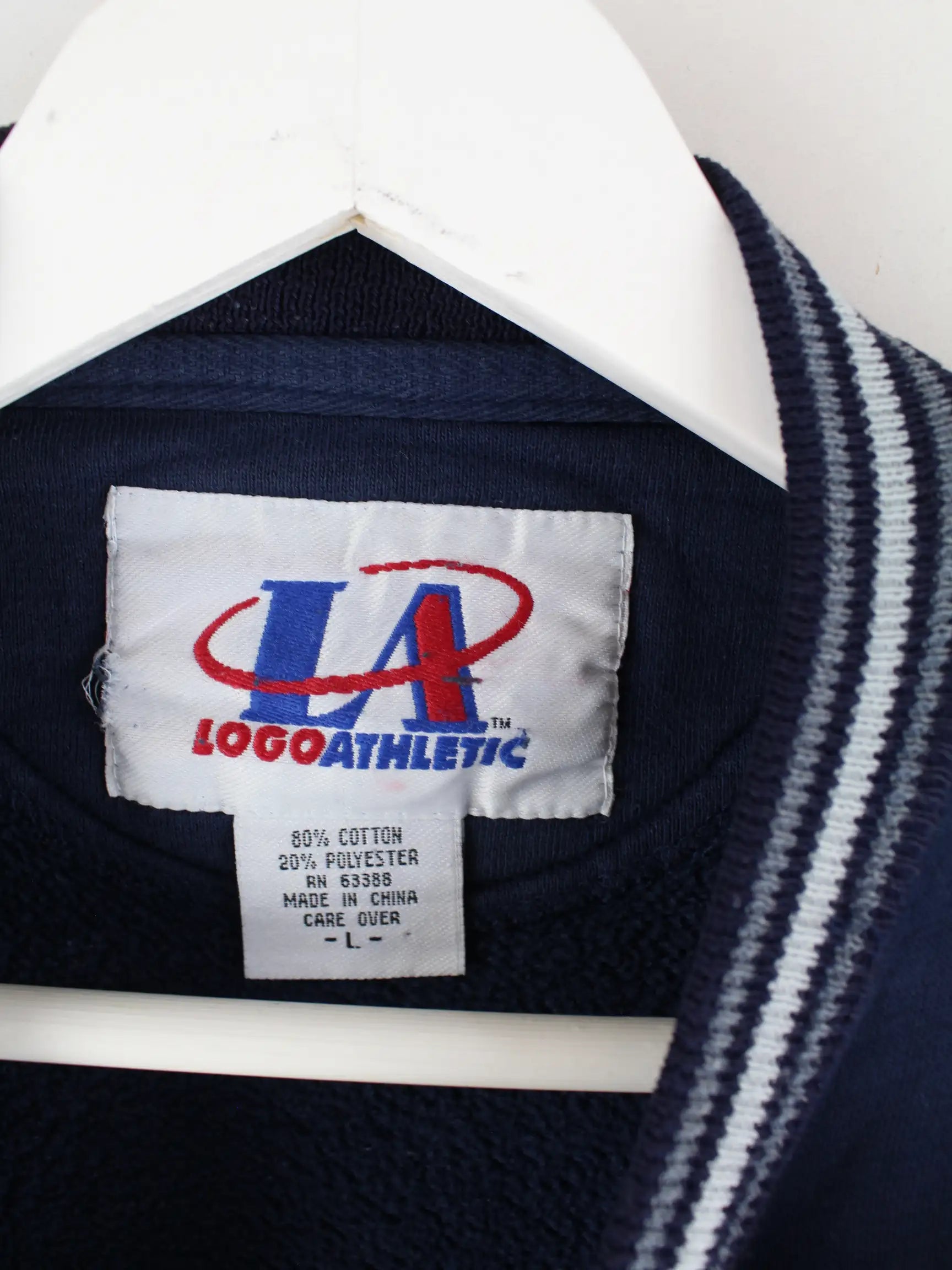 Blauer Sweater mit Stickereien aus dem Hause Logo Athletic in Größe L. Er ist aus einer Baumwollmischung produziert. Den Zustand würden wir als 'In Ordnung' bezeichnen (vergl. Bilder).