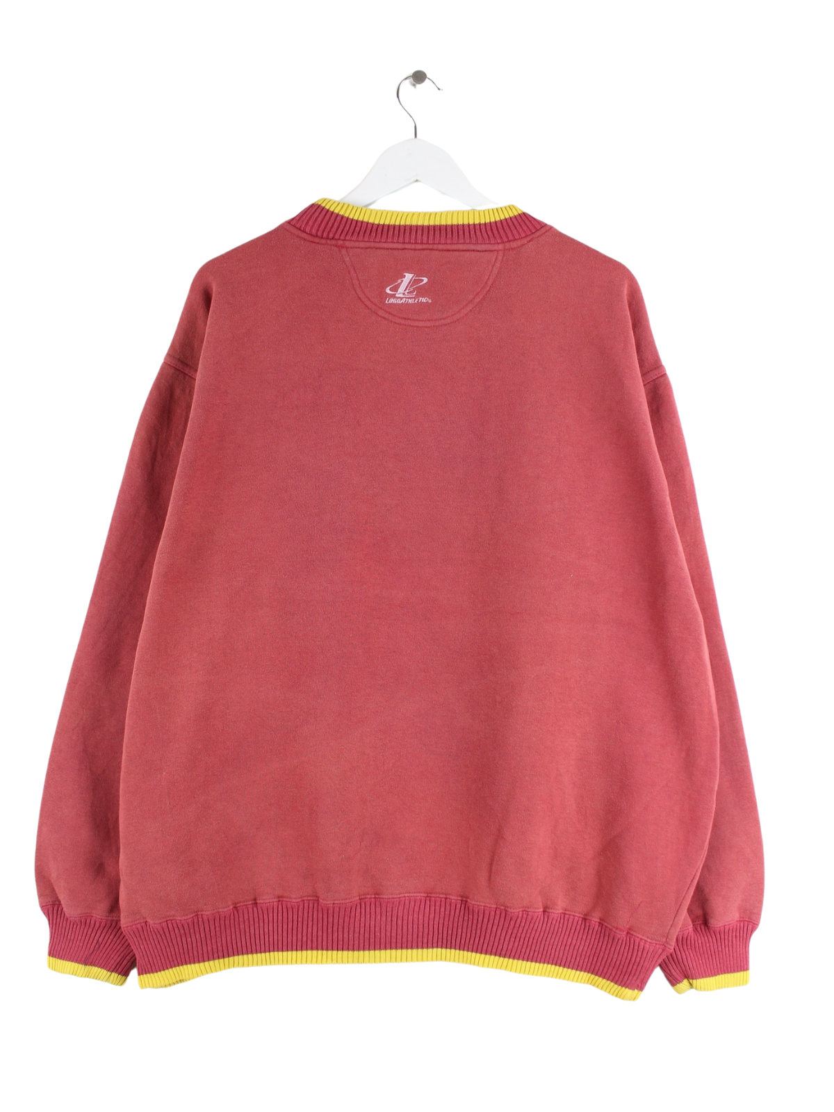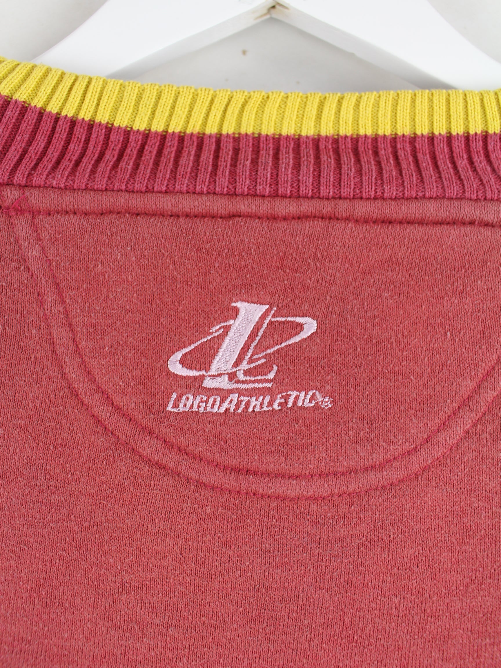 Roter Sweater mit gesticktem Logo vom Brand Logo Athletic aus den 90'ern in Größe XL. Er ist aus einer Baumwollmischung gefertigt und in gutem Zustand in Stock.