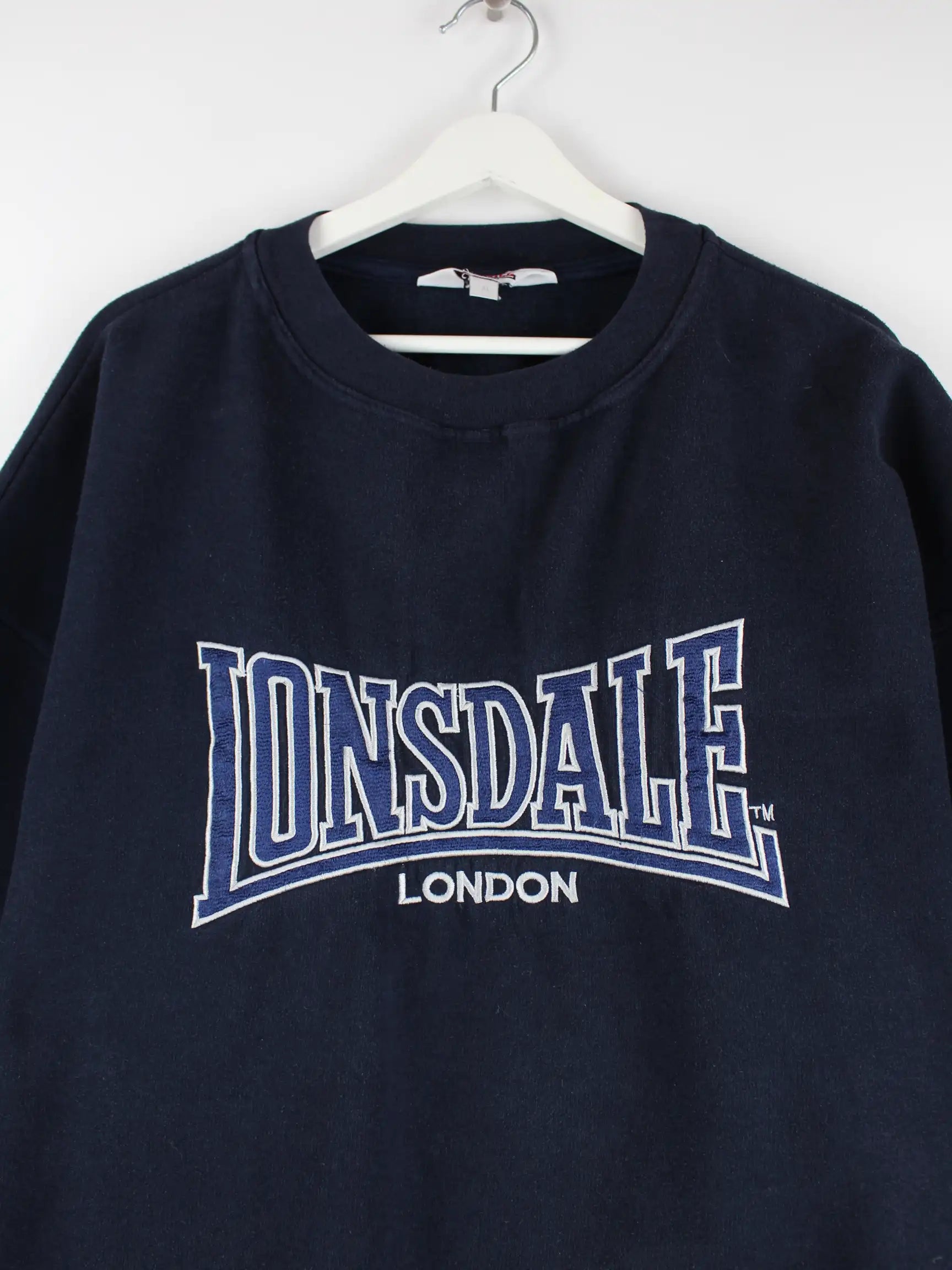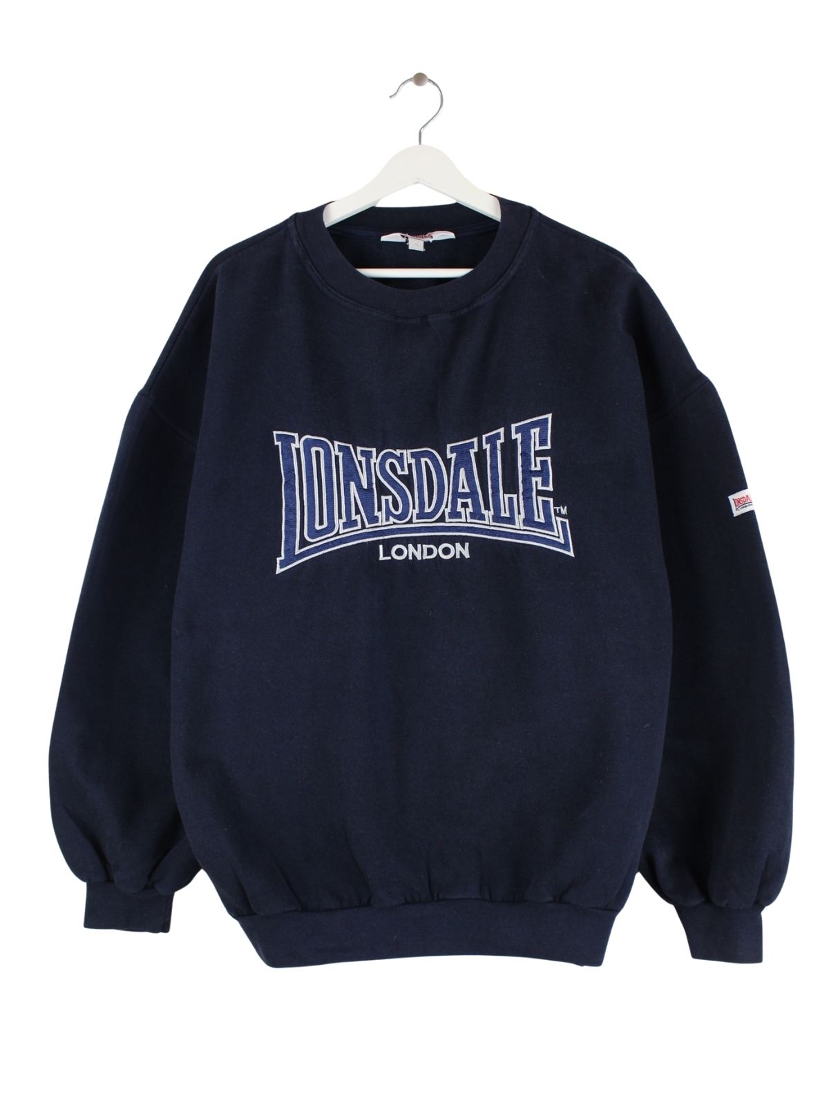Blauer Sweater von Lonsdale aus den 90'ern in Größe XL. Er ist aus einer Baumwollmischung hergestellt und in gutem Zustand zu bekommen.