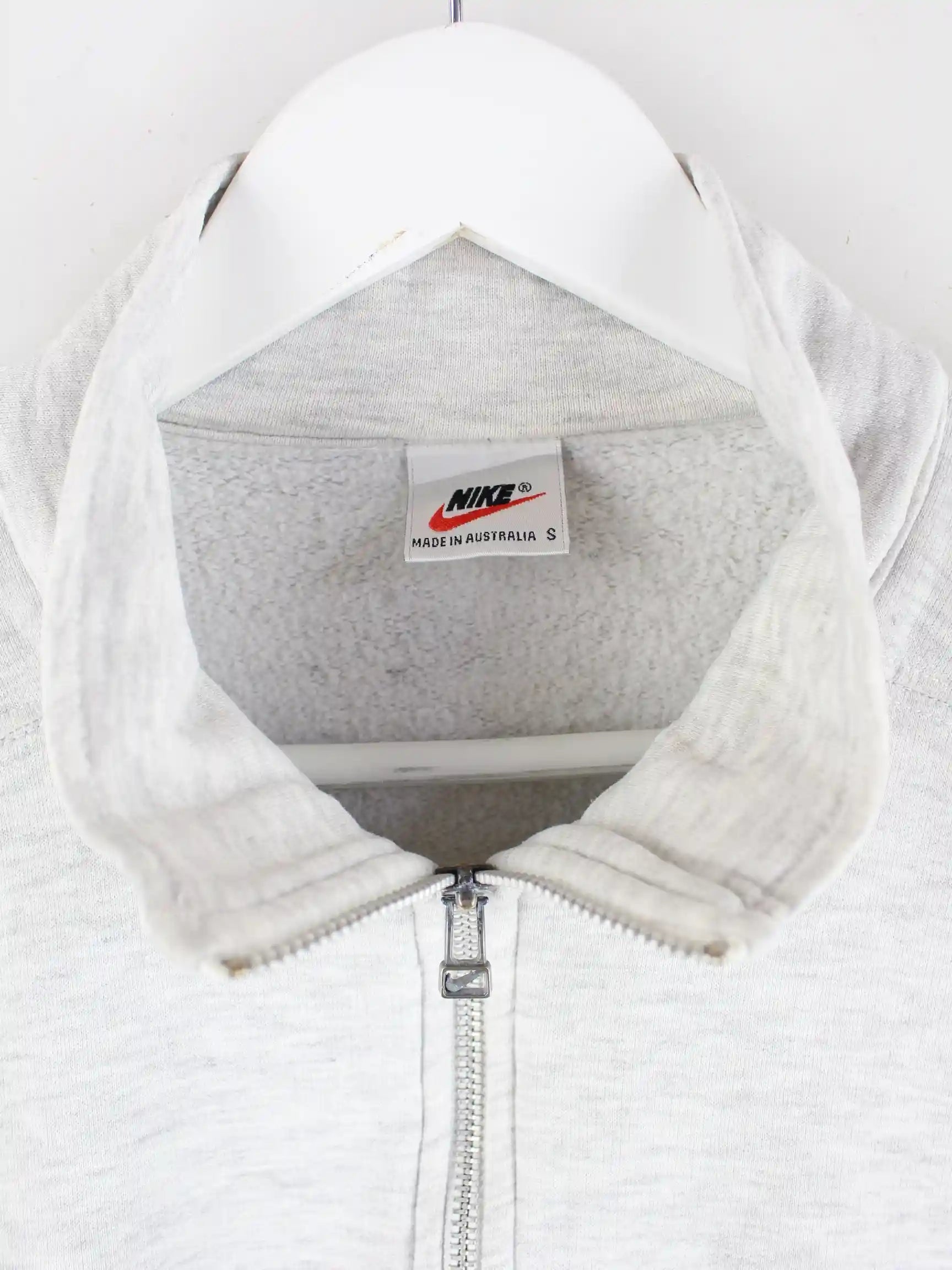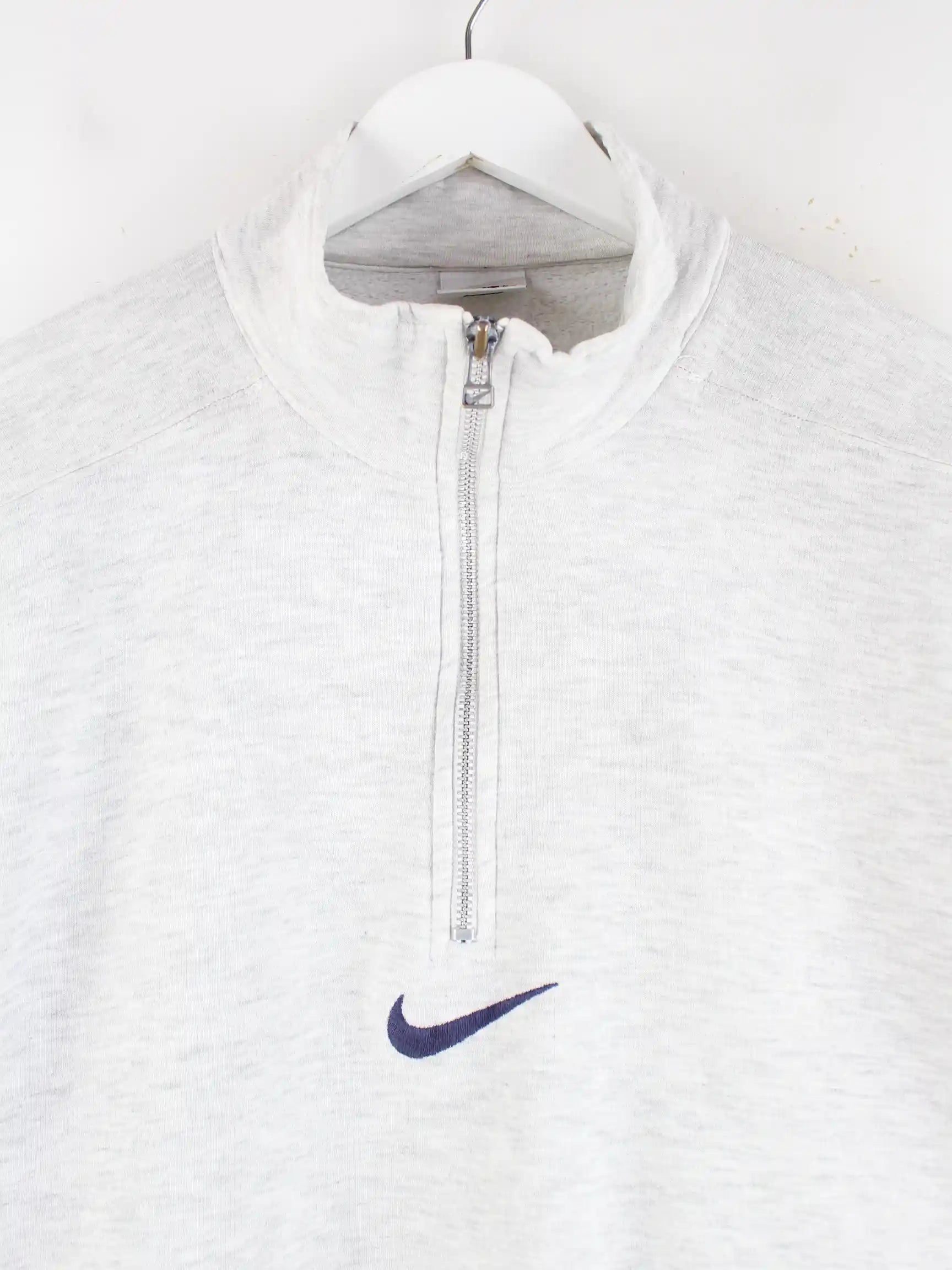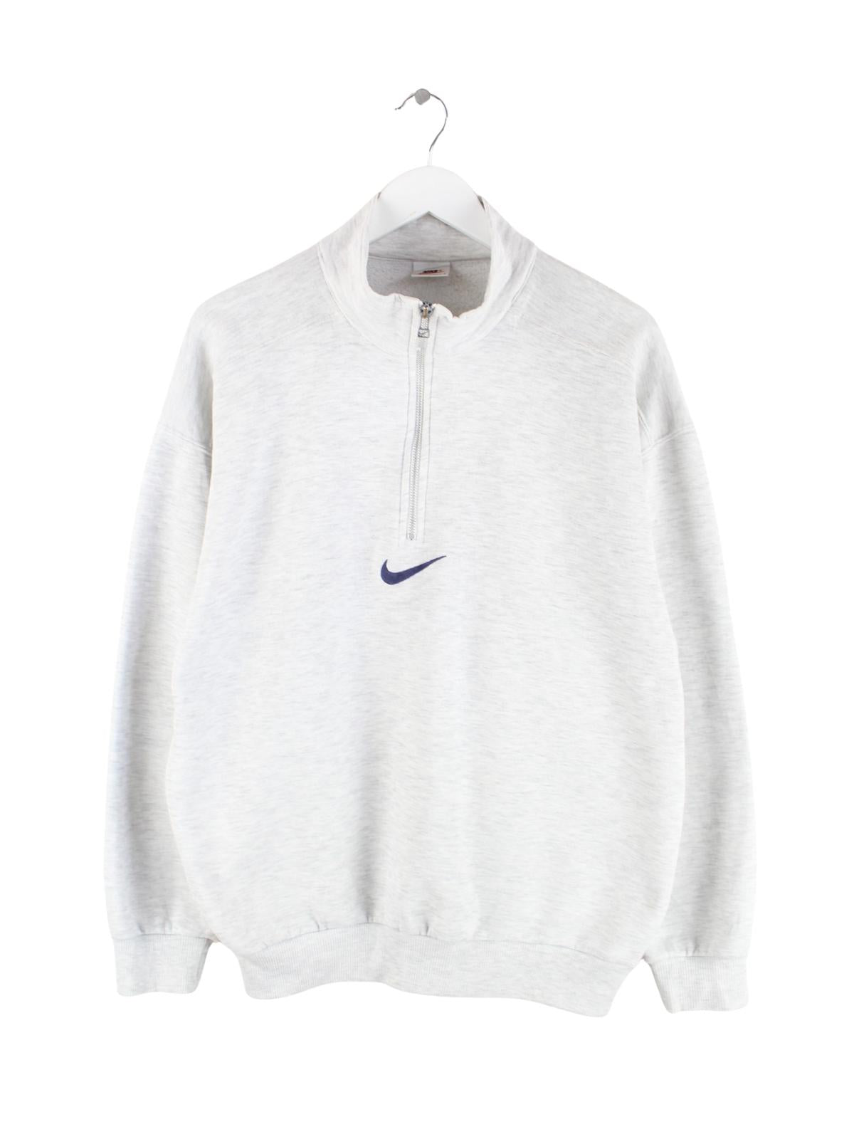 Sweater vom Brand Nike mit halbem Reißverschluß in Größe S aus den 90'ern. Er ist aus einer Baumwollmischung und in Grau zu bekommen.