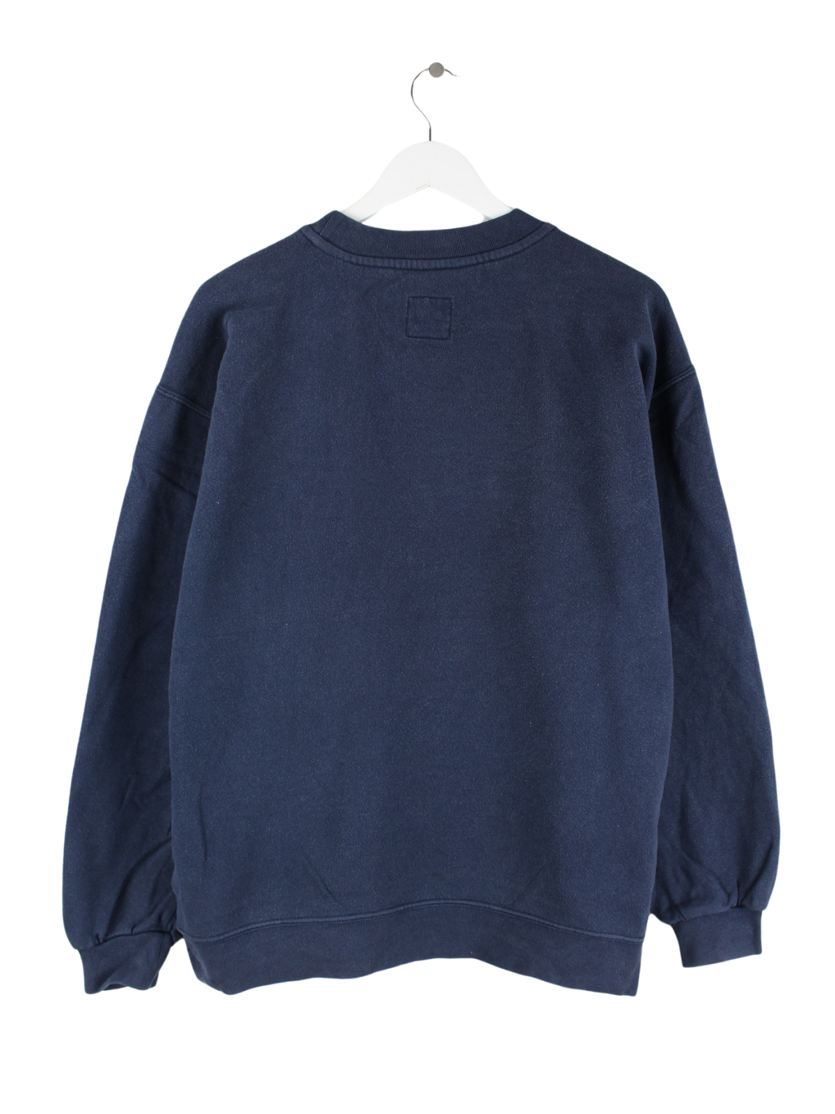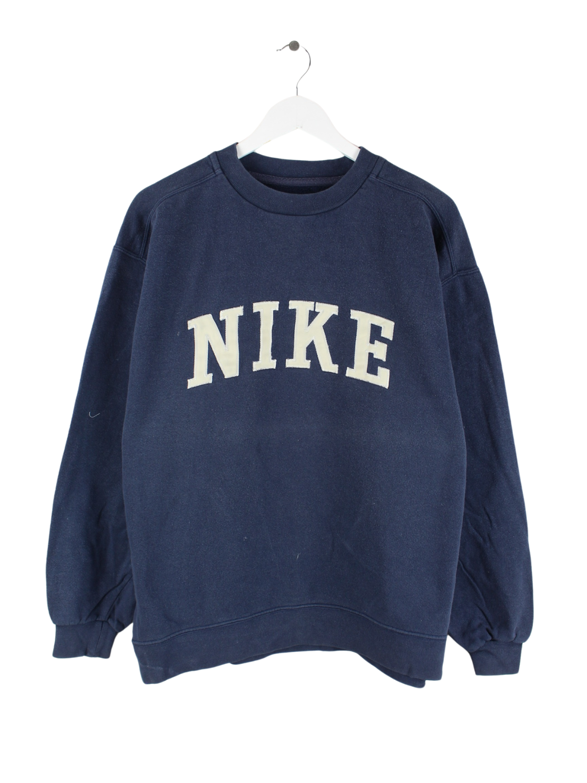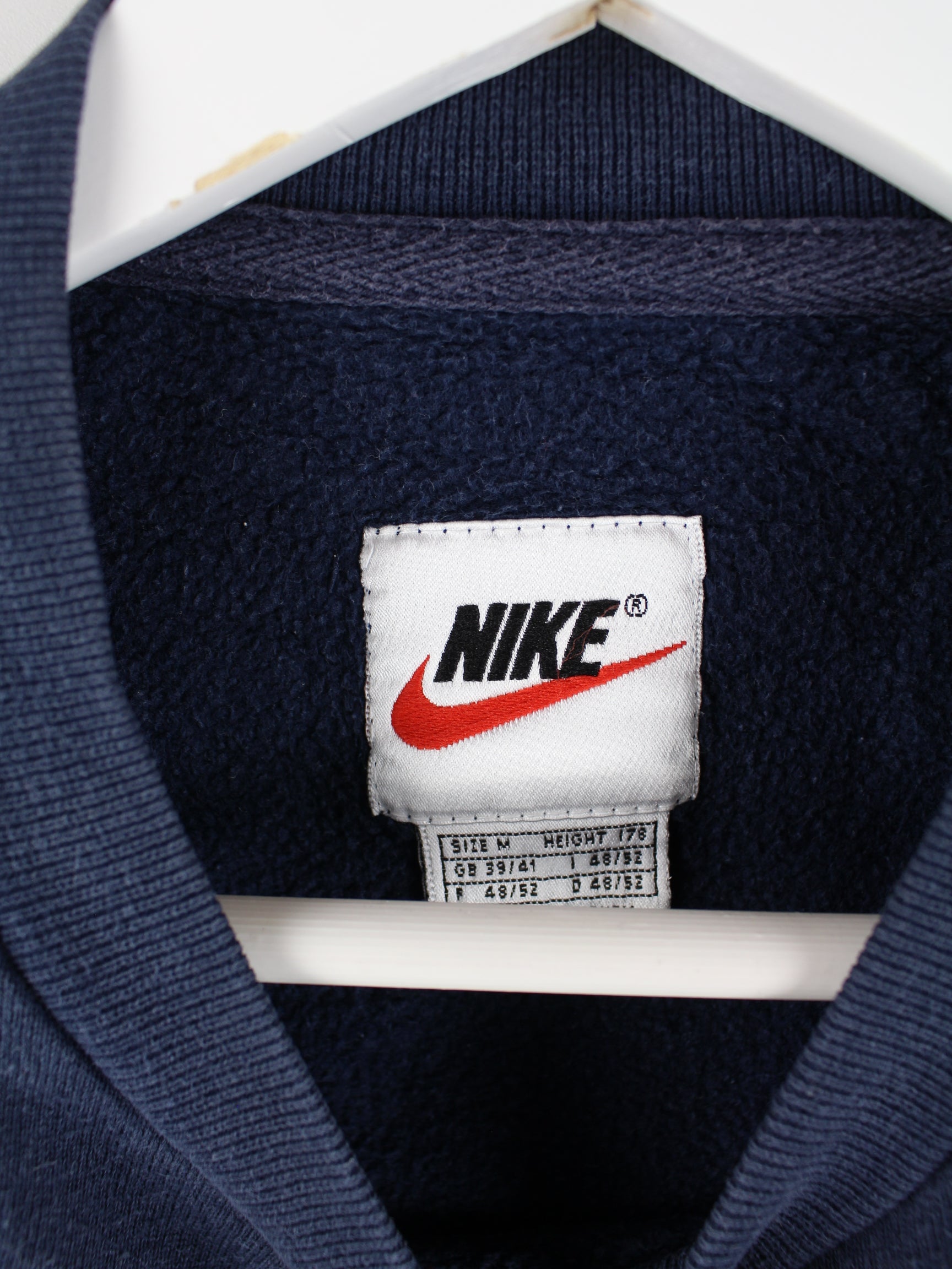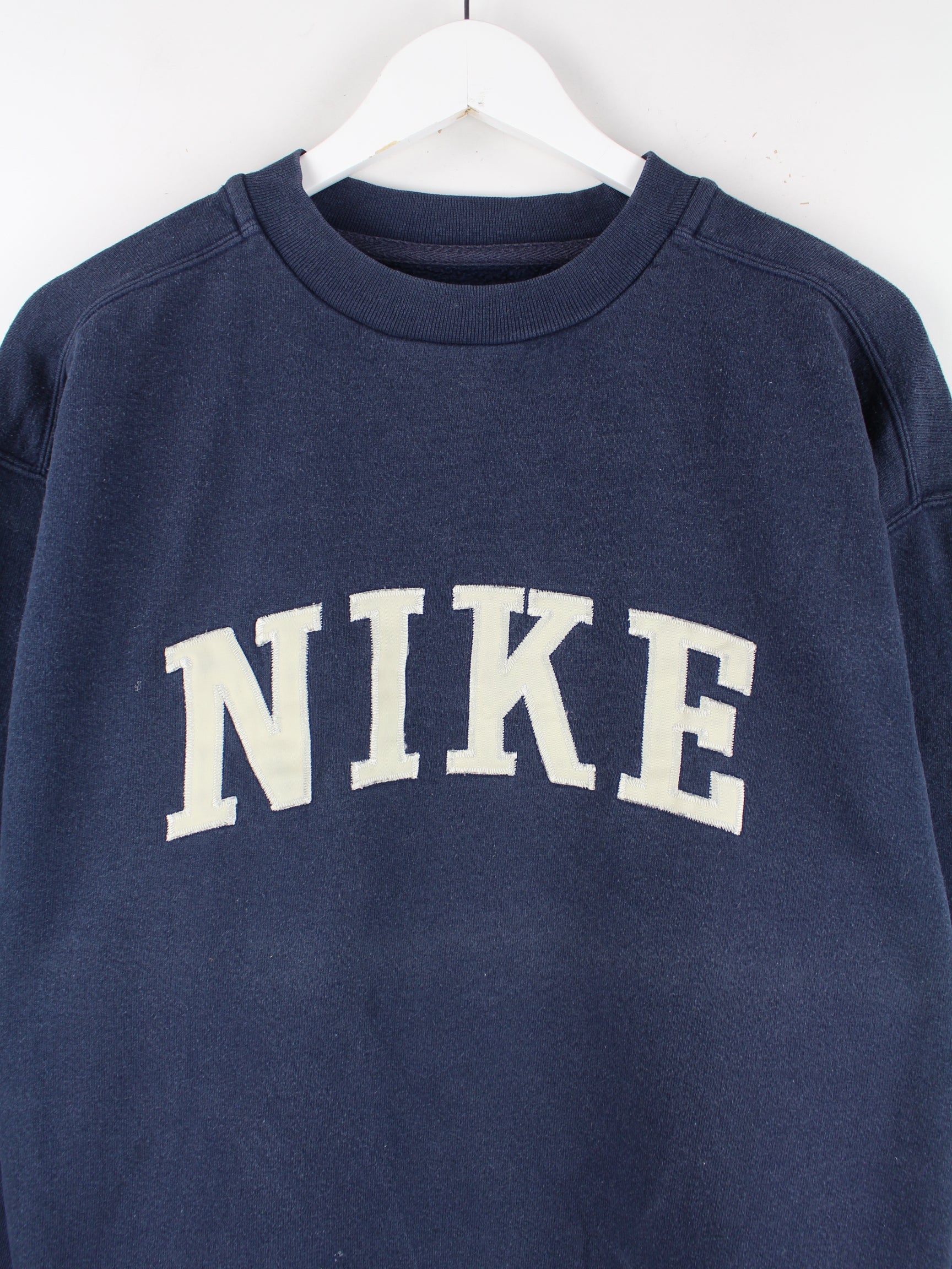 Sweater vom Brand Nike mit Stick in Größe M aus den 90'ern. Er ist aus einer Baumwollmischung hergestellt und in Blau im Bestand.