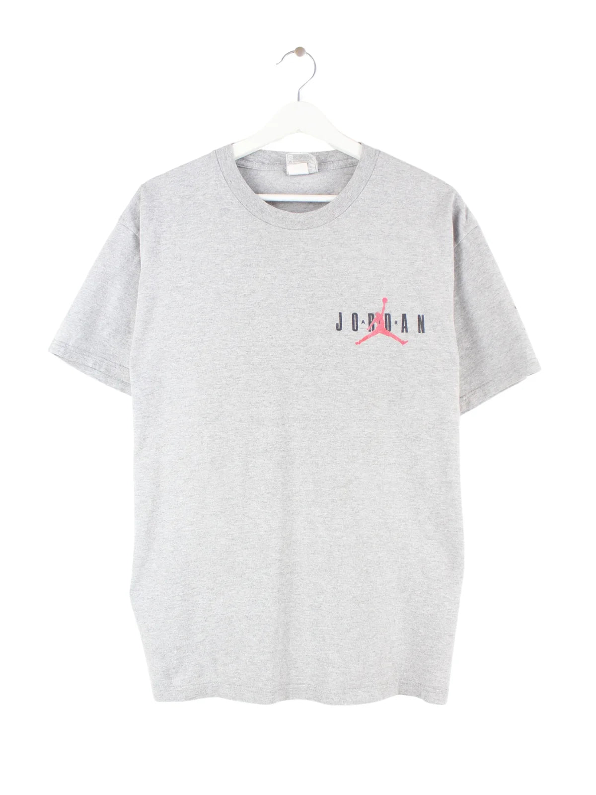 T-Shirt von Nike in Größe M aus den 90'ern. Es ist aus Baumwolle und in Grau bei uns zu bekommen. Mit schönem Jordan Print.