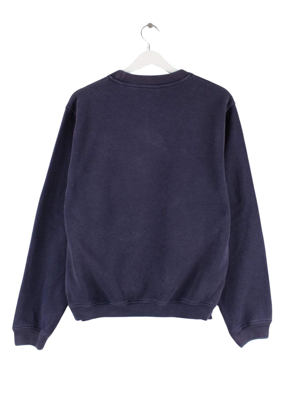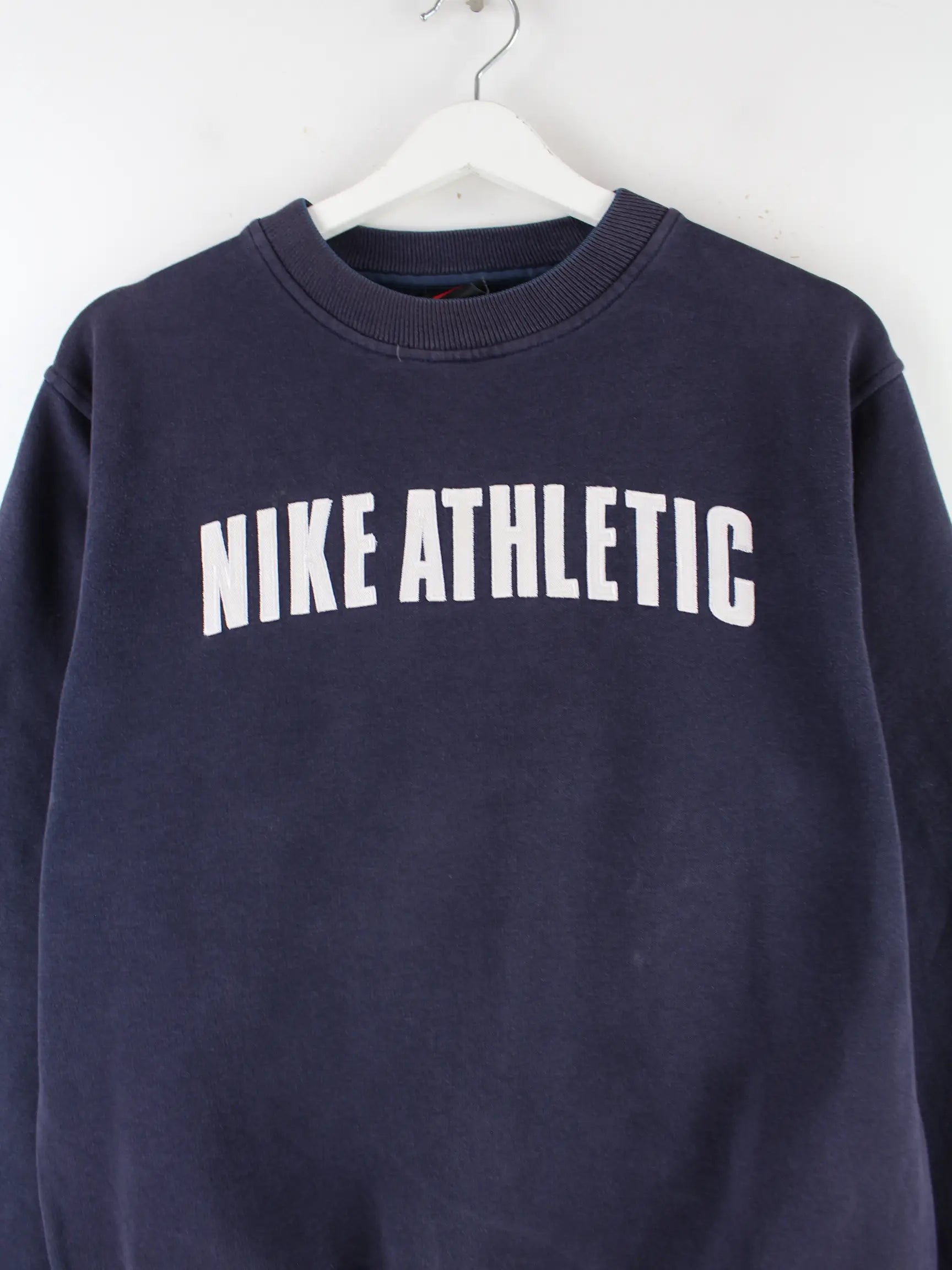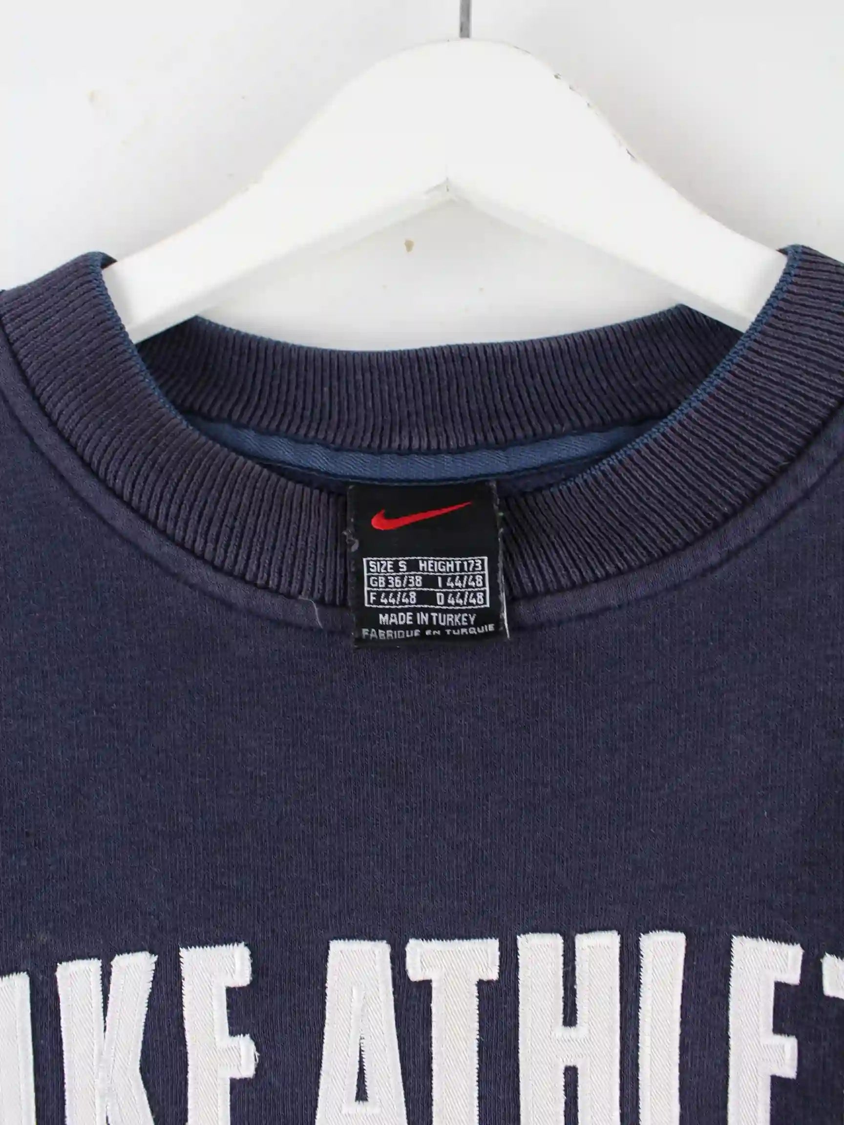 Blauer Sweater mit gestickten Motiven der Marke Nike in Größe S. Er ist aus einer Baumwollmischung produziert. Den Zustand würden wir als 'In Ordnung' bezeichnen (vergl. Bilder).
