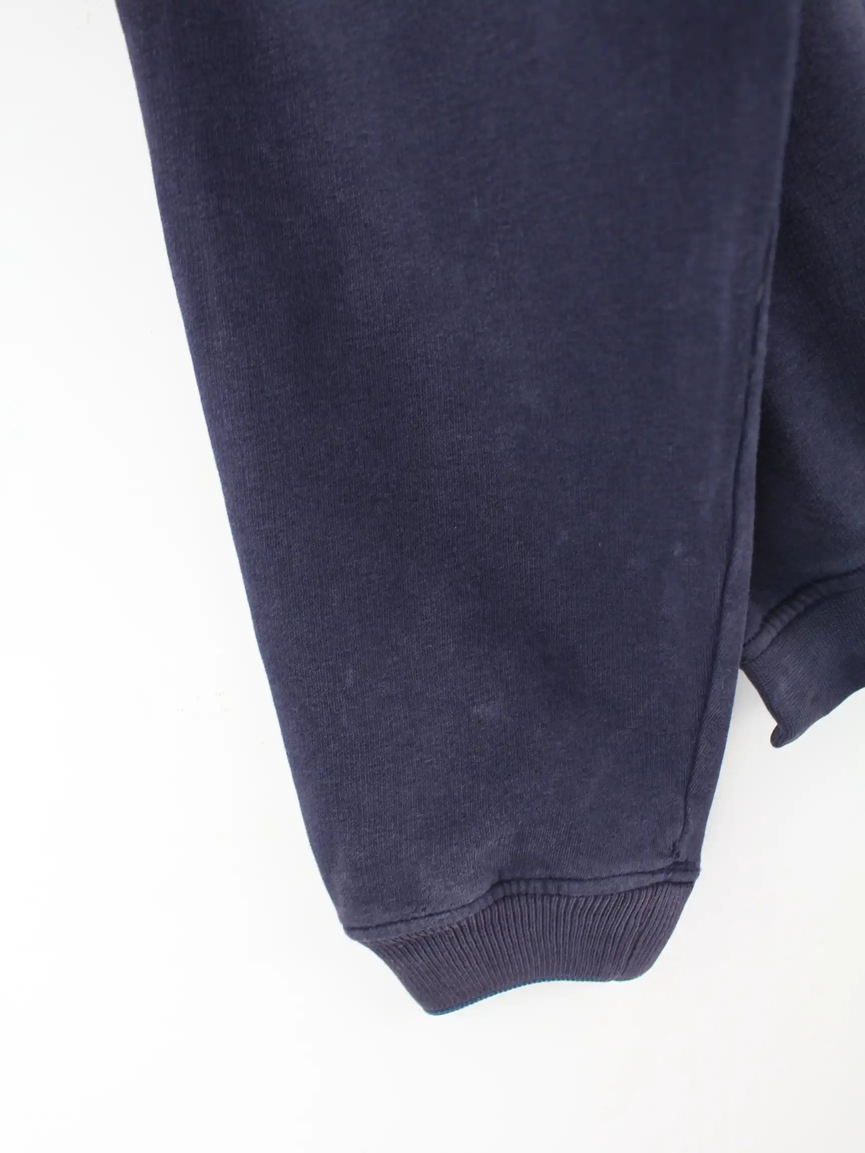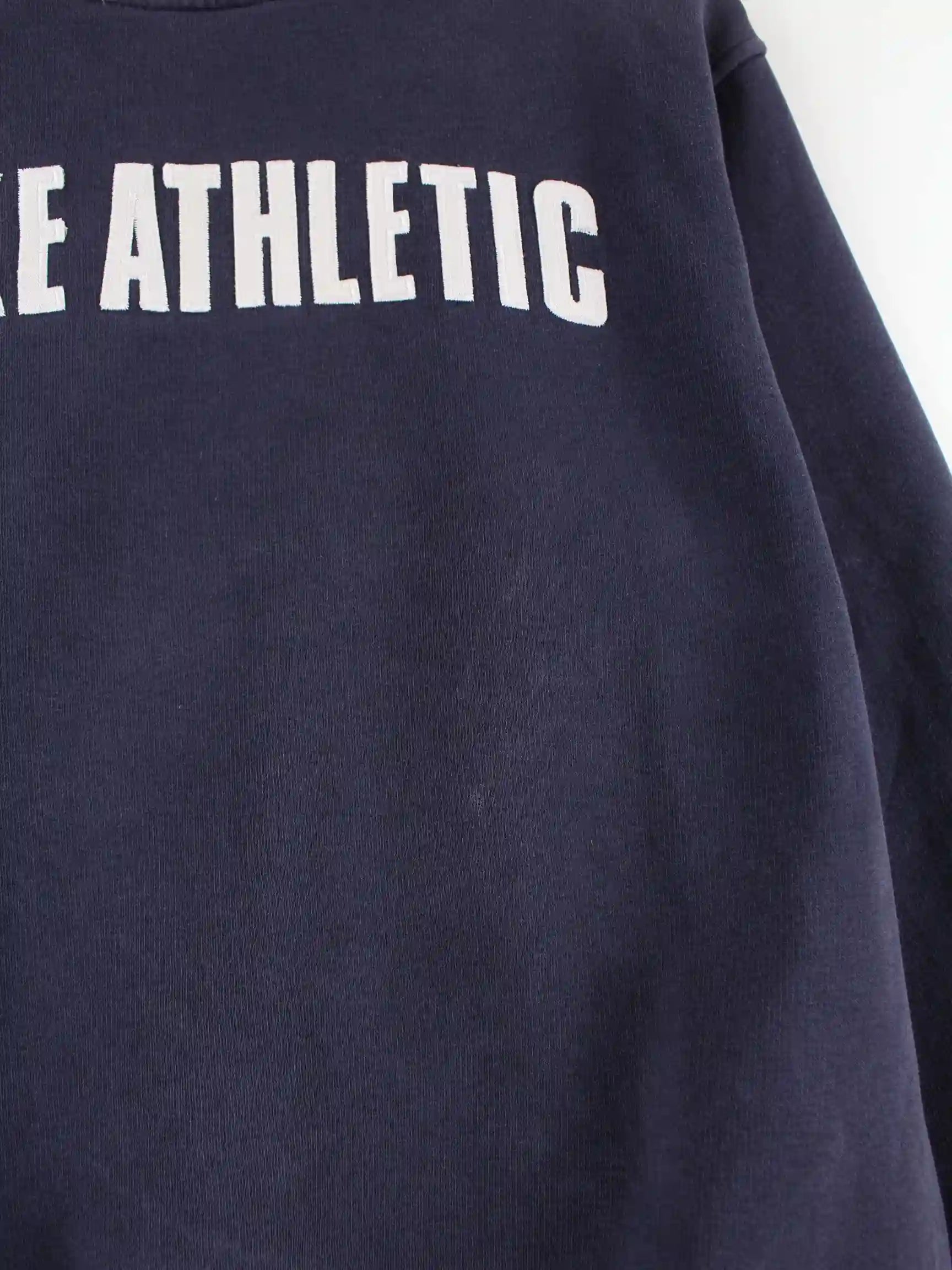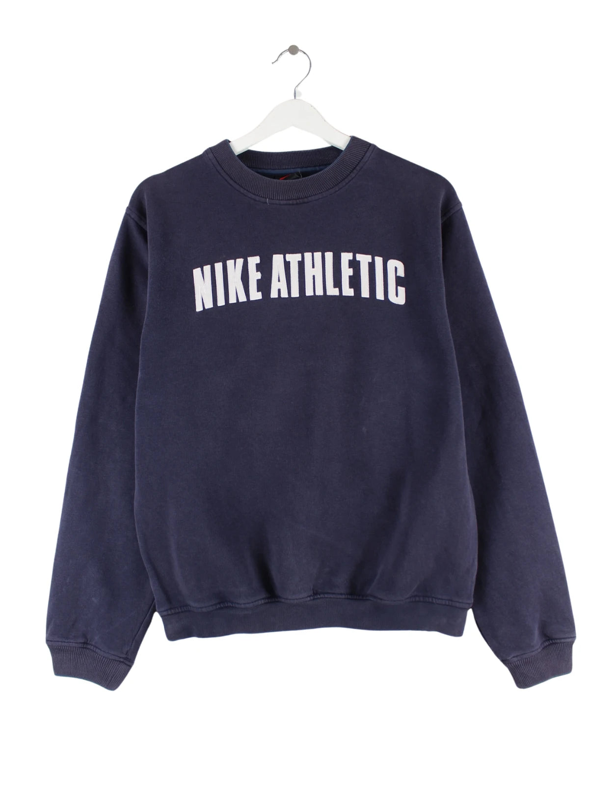 Blauer Sweater mit gestickten Motiven der Marke Nike in Größe S. Er ist aus einer Baumwollmischung produziert. Den Zustand würden wir als 'In Ordnung' bezeichnen (vergl. Bilder).