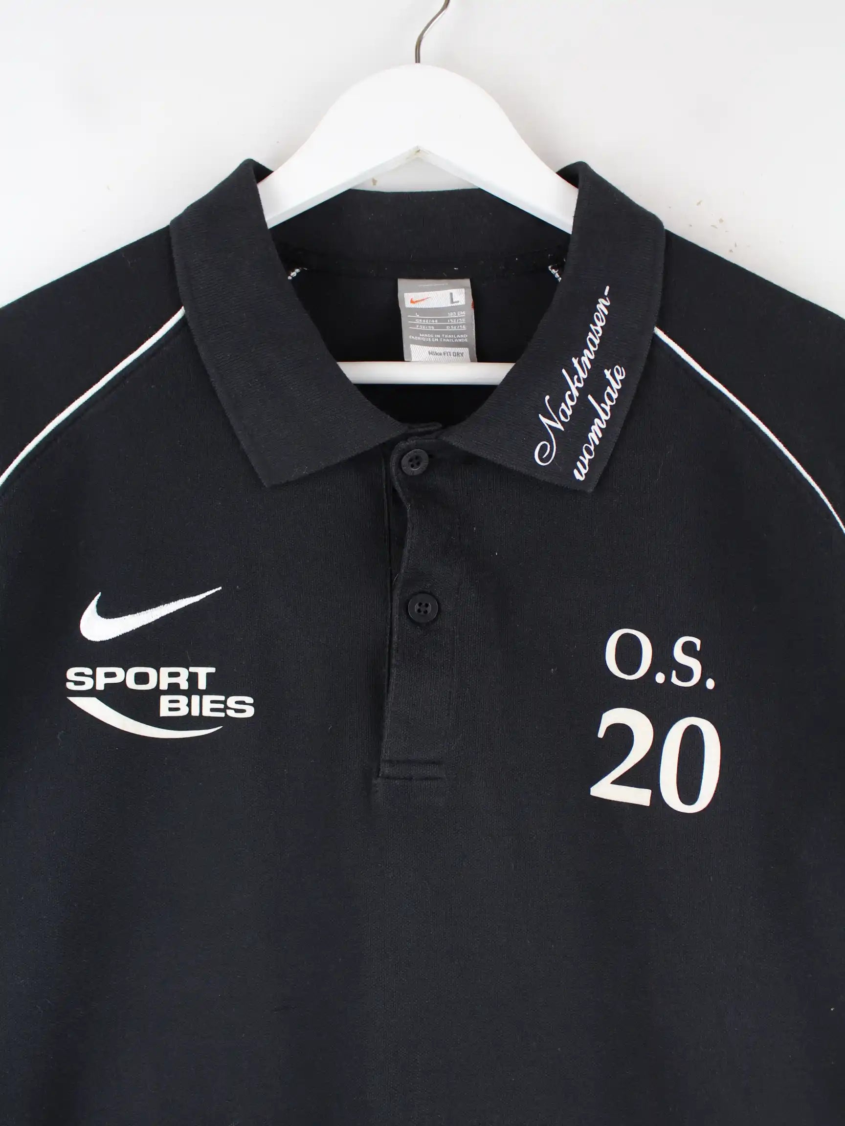 Schwarzes Poloshirt des Labels Nike in Größe L. Es ist aus Baumwolle gefertigt und in gutem Zustand lieferbar. Mit seltenem Nacktnasenwombat Print.