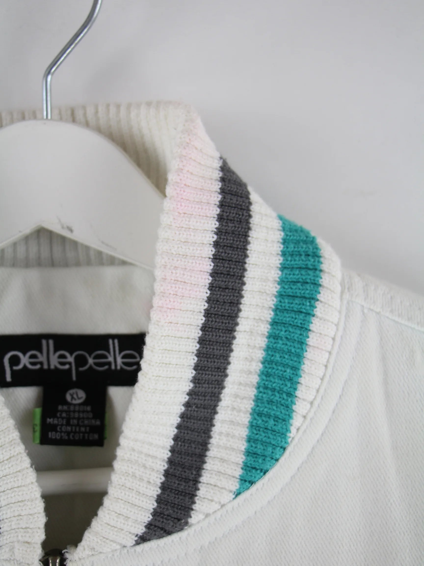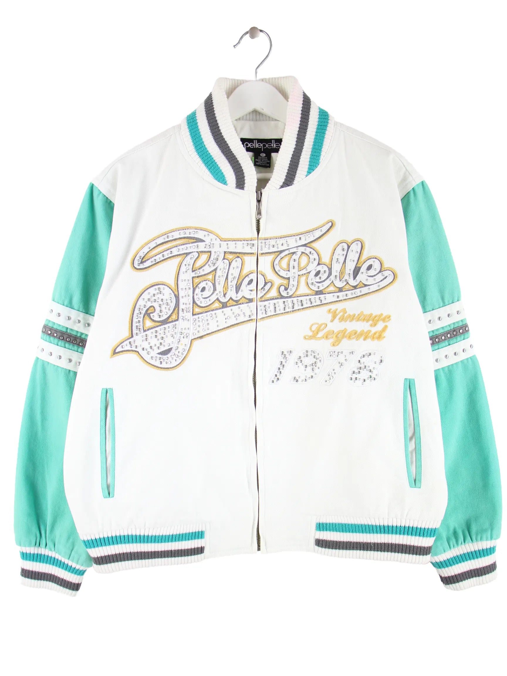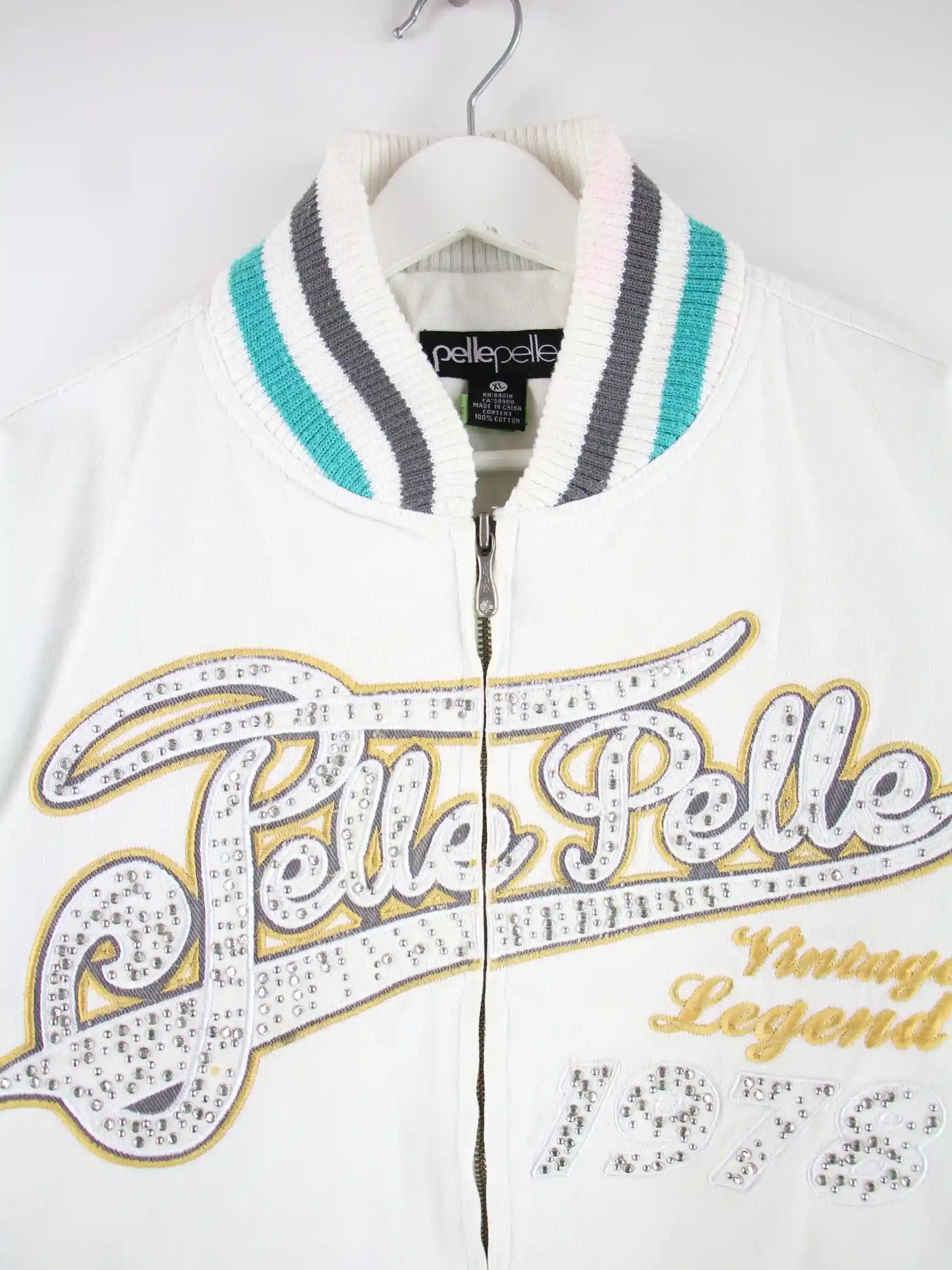 Weiße Leichte Jacke vom Label Pelle Pelle aus Anfang der 2000'er in Größe XL. Sie ist aus einer Baumwollmischung produziert. Den Zustand würden wir als 'In Ordnung' bezeichnen (vergl. Bilder).
