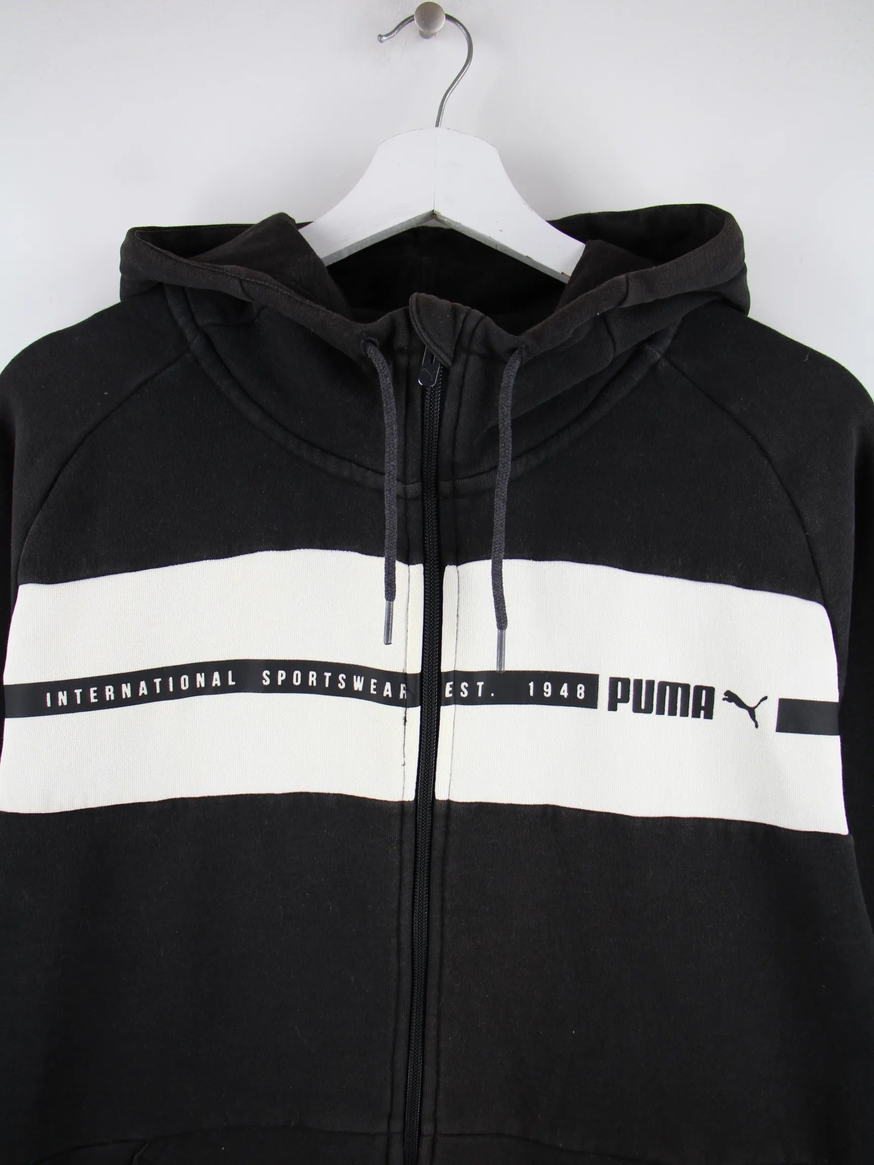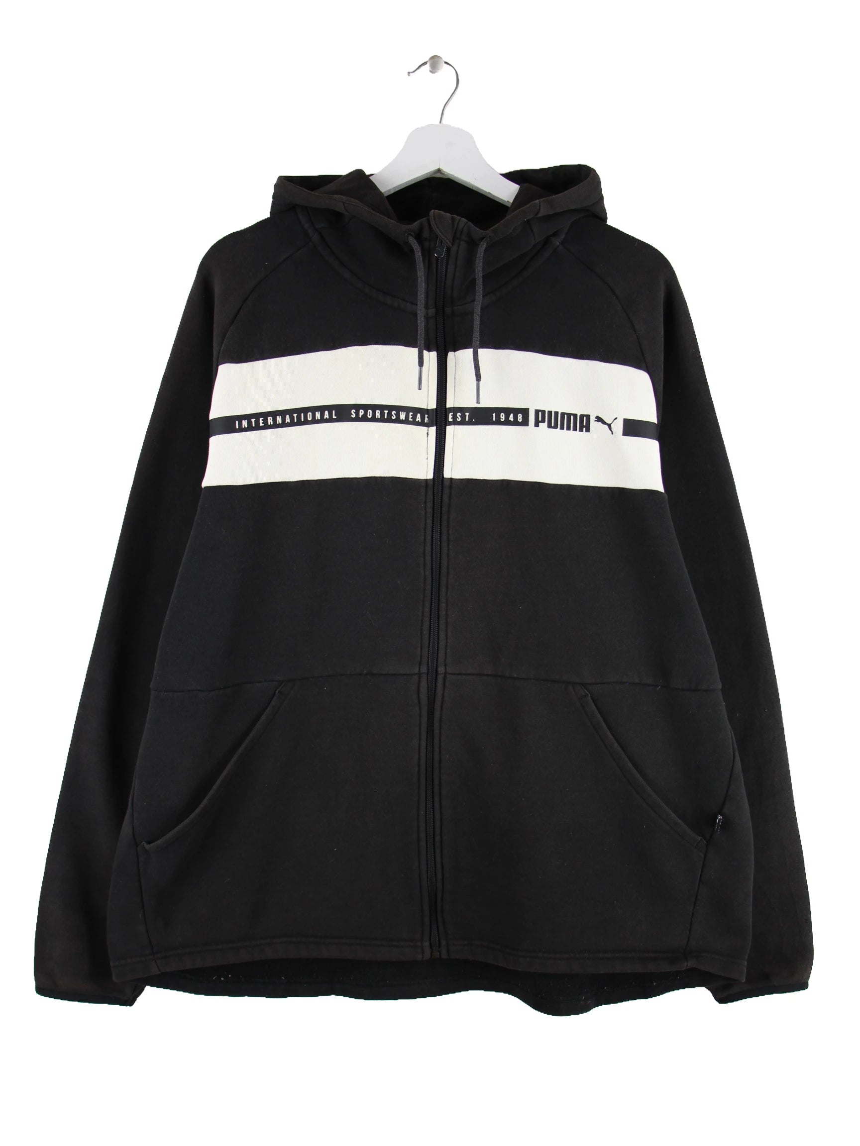 Schwarzer Hoodie mit Reißverschluß aus dem Hause Puma in Größe XL. Er ist aus einer Baumwollmischung angefertigt. Den Zustand würden wir als 'In Ordnung' bezeichnen (vergl. Bilder).Mit schickem undefined Print.
