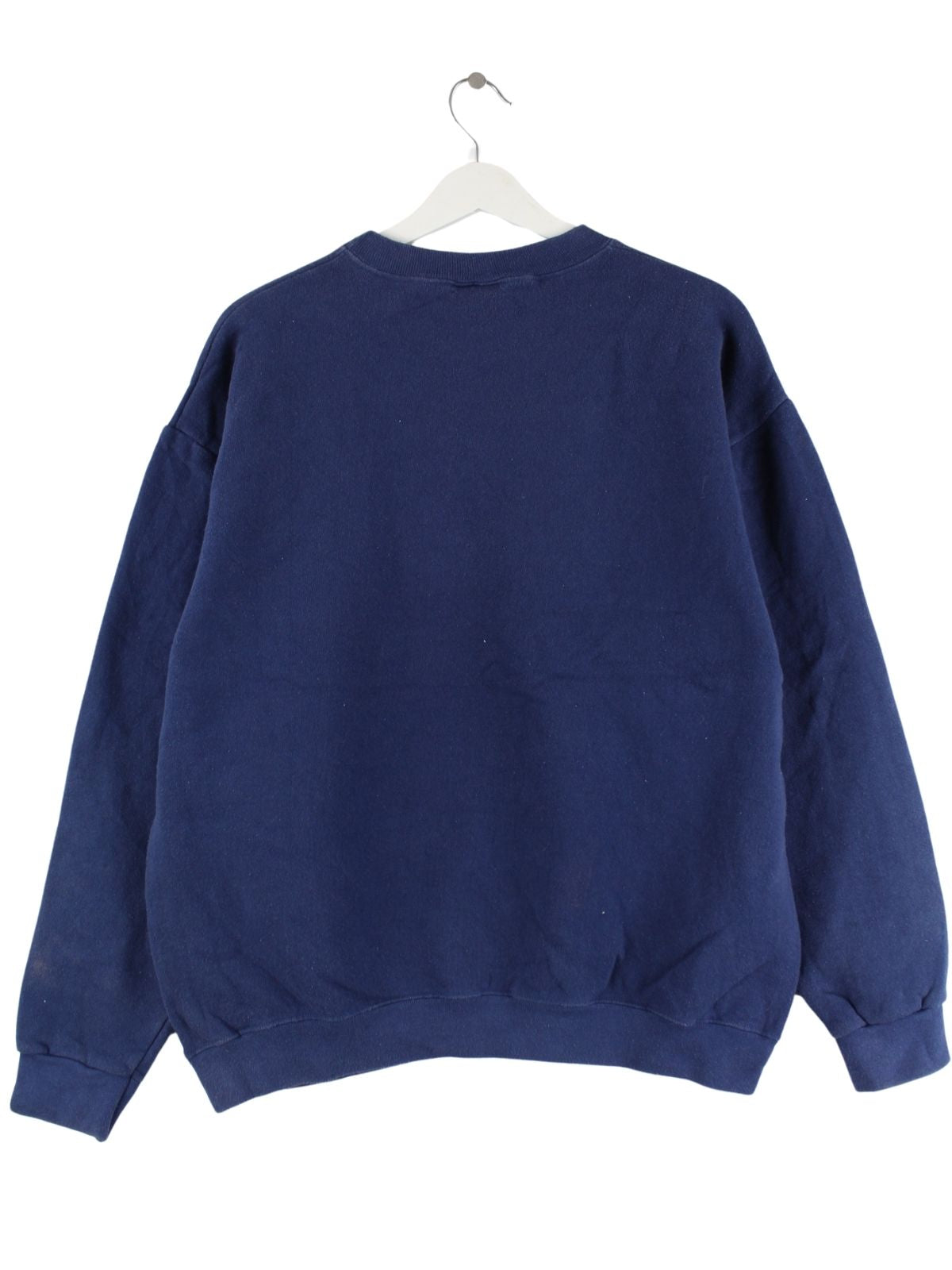 Blauer Vintage Sweater mit Stickereien in Größe L. Er ist aus einer Baumwollmischung hergestellt. Den Zustand würden wir als 'In Ordnung' bezeichnen (vergl. Bilder).