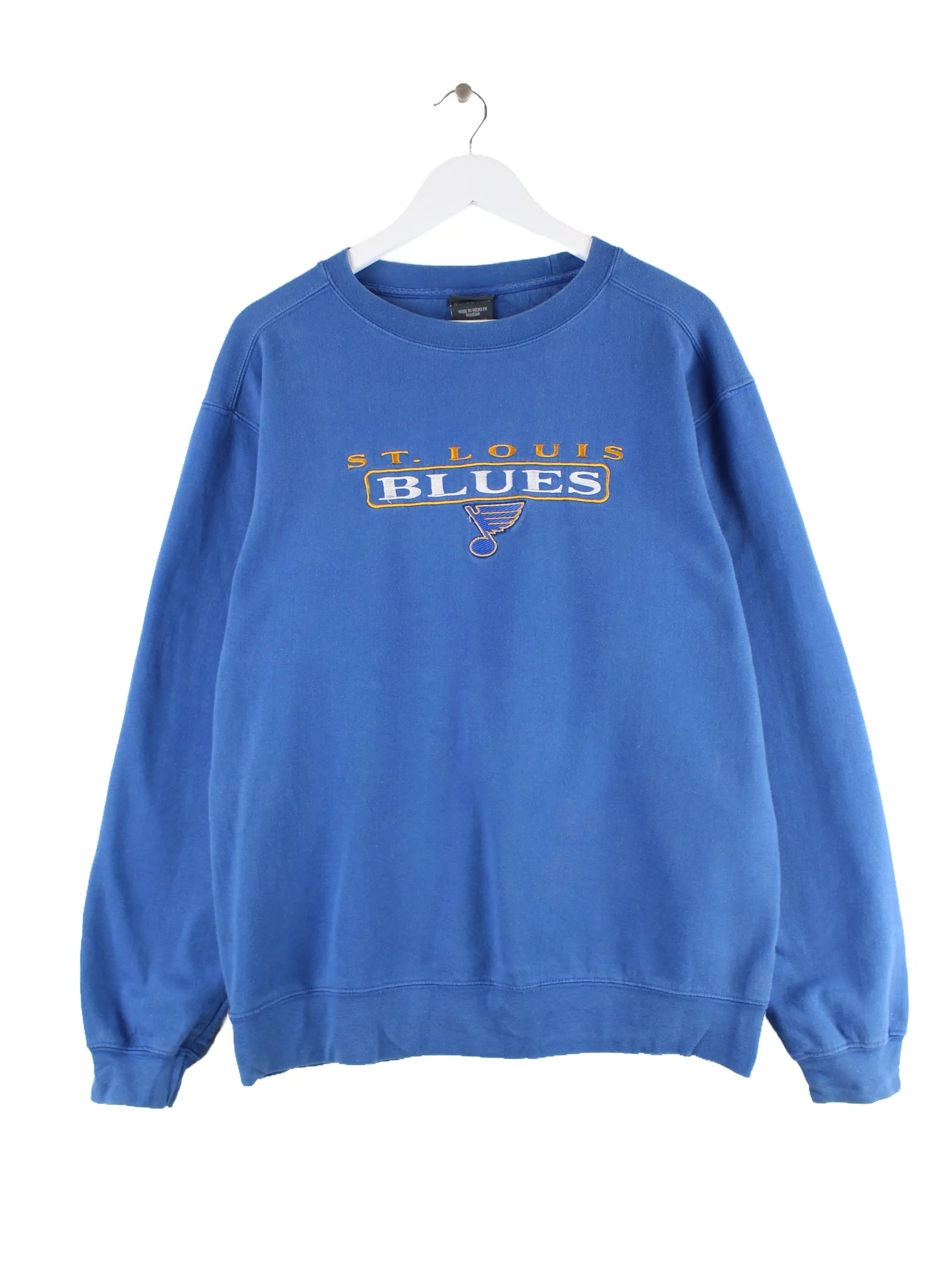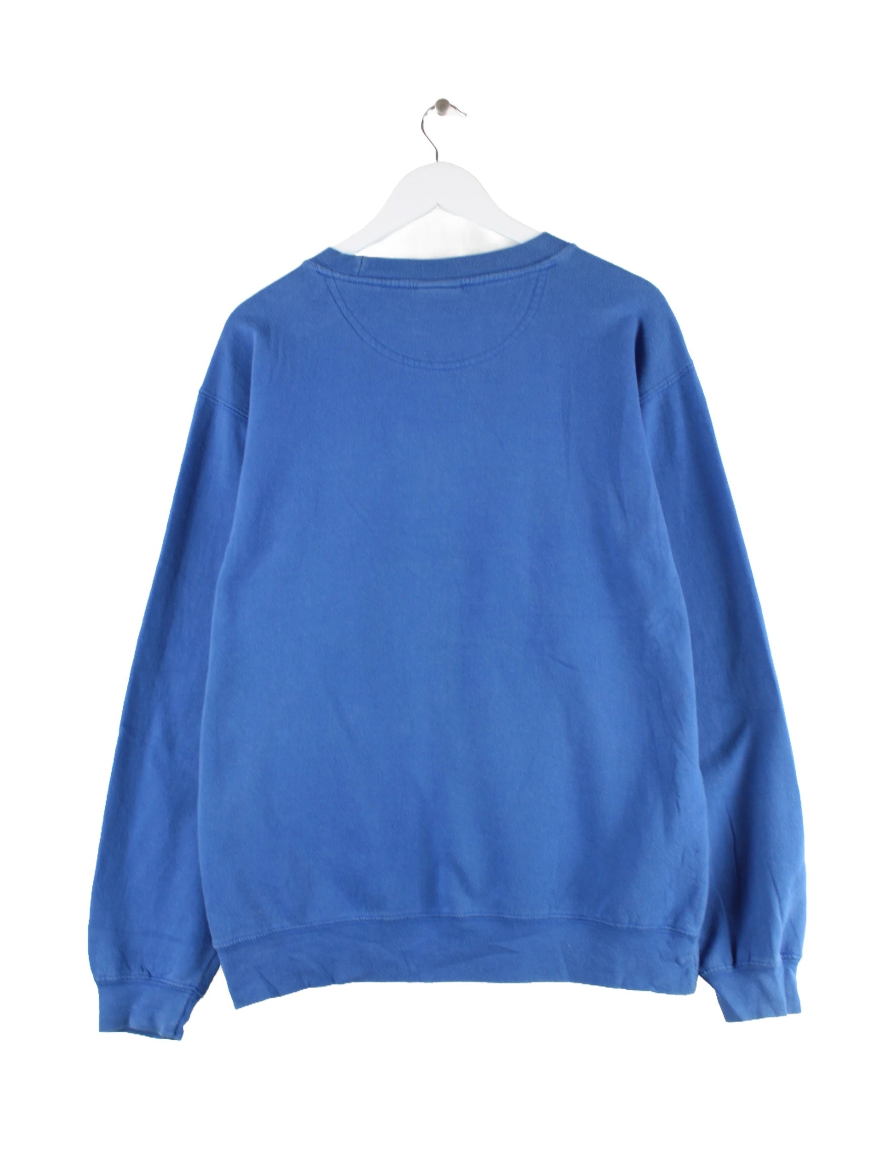 Vintage Sweater in Größe M. Er ist aus einer Baumwollmischung gemacht und in Blau zu haben.