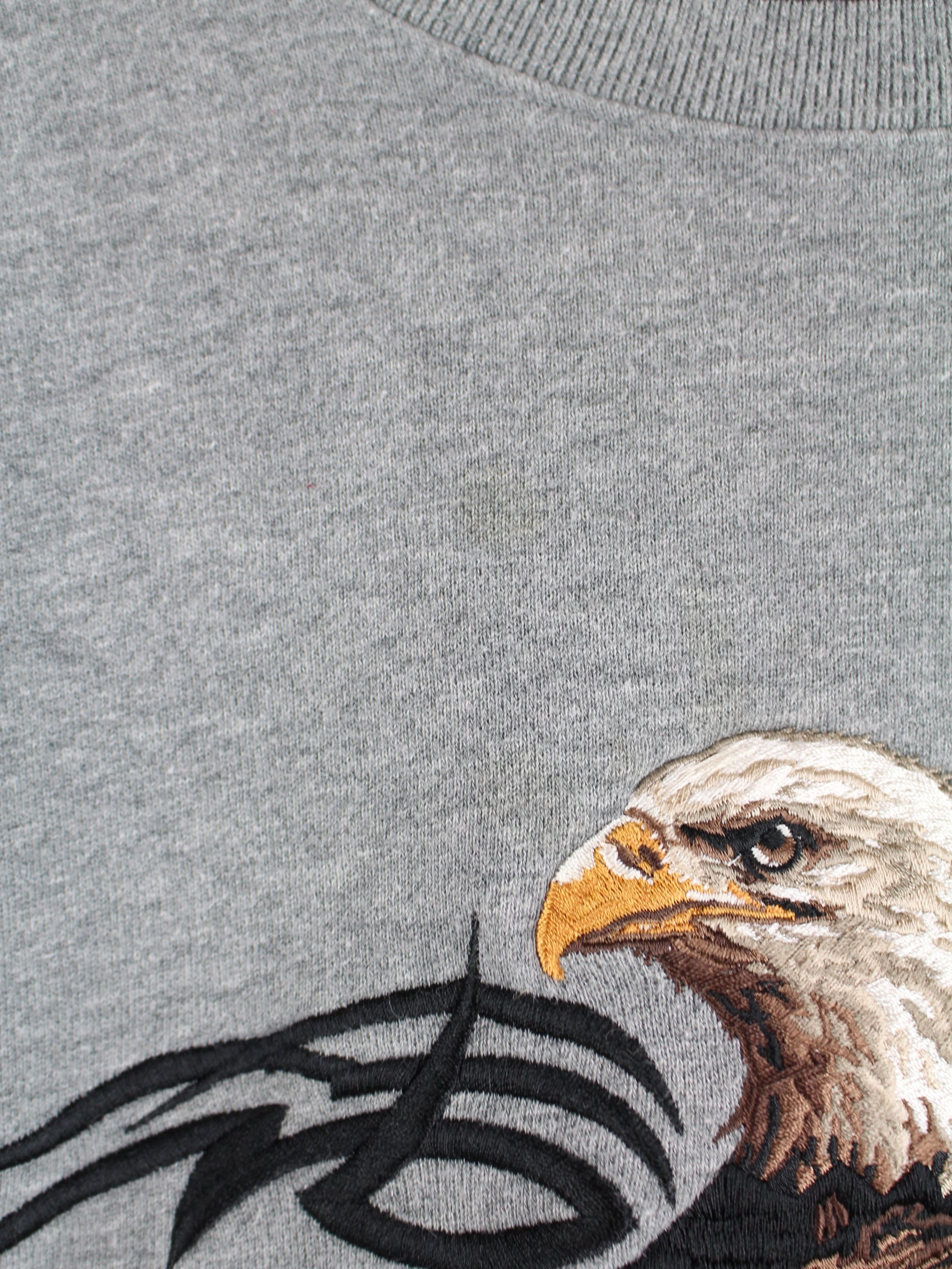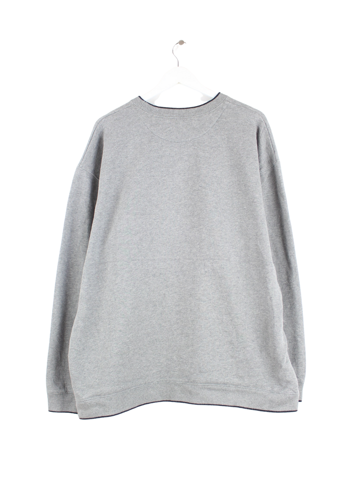 Vintage sweater with embroidered logo in size XXL. It is made from a cotton blend and comes in grey.