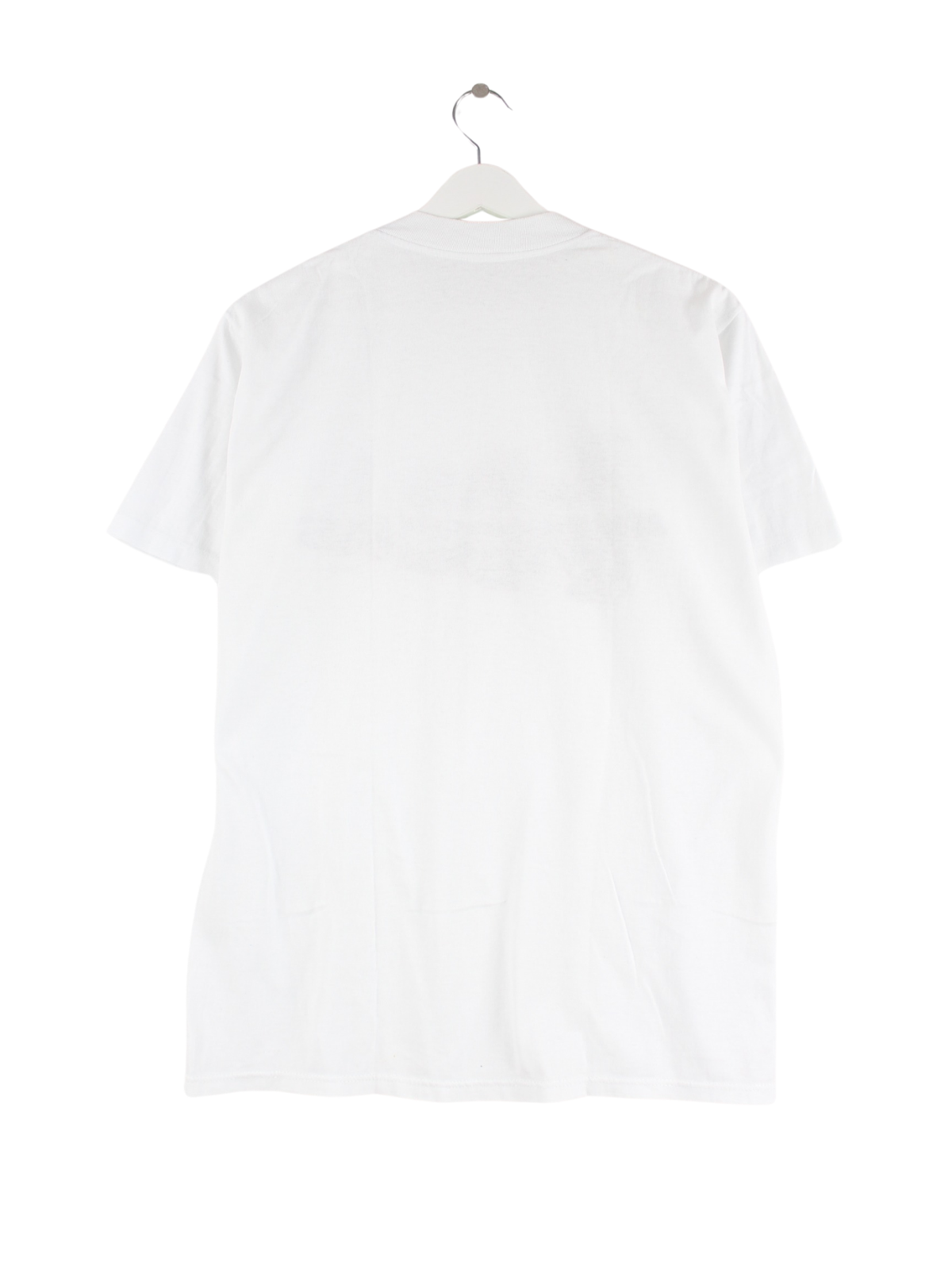 White vintage T-shirt in size L. It is made of a cotton blend and is available from us in very good condition. With a chic Vegas print.
