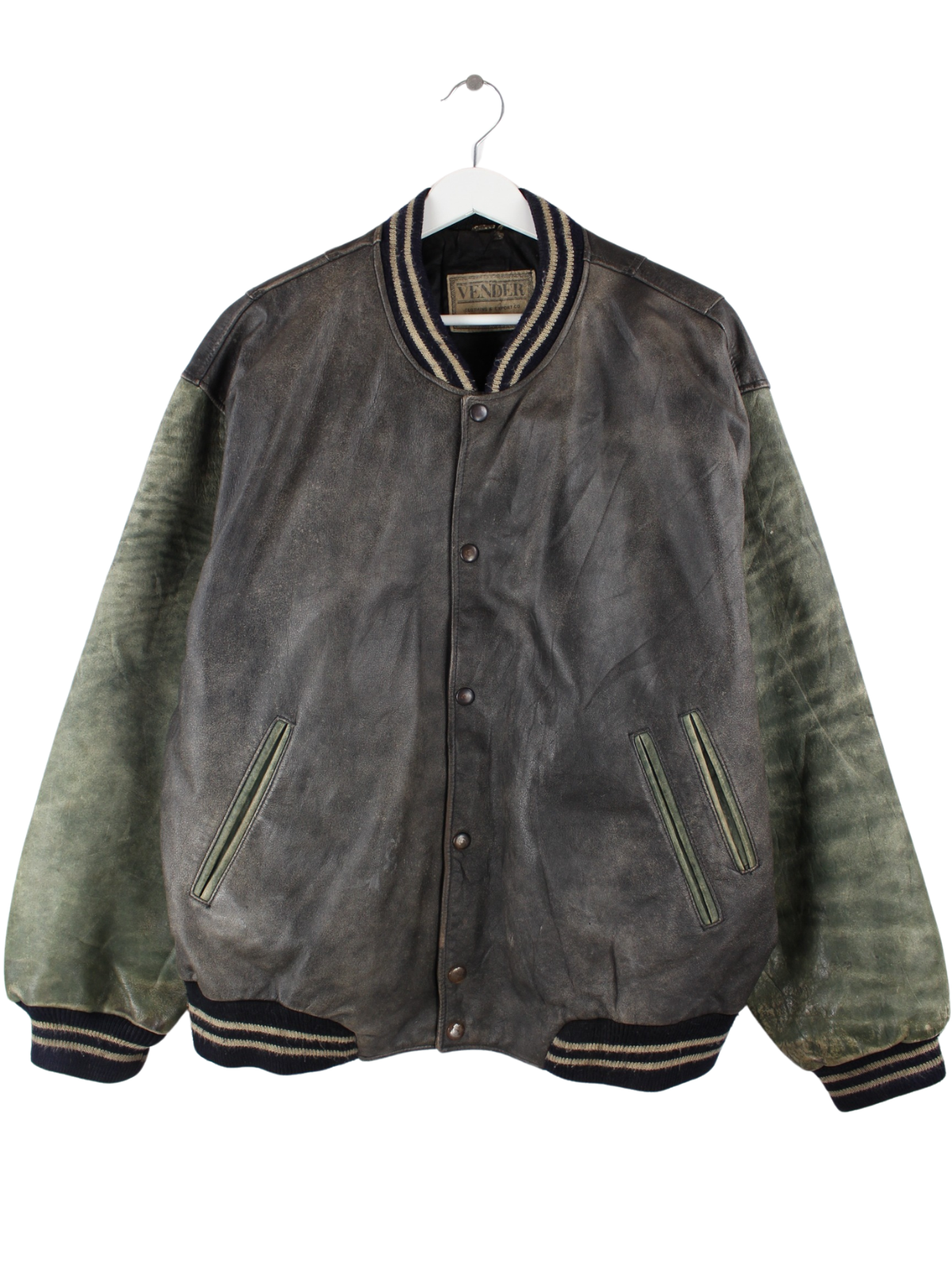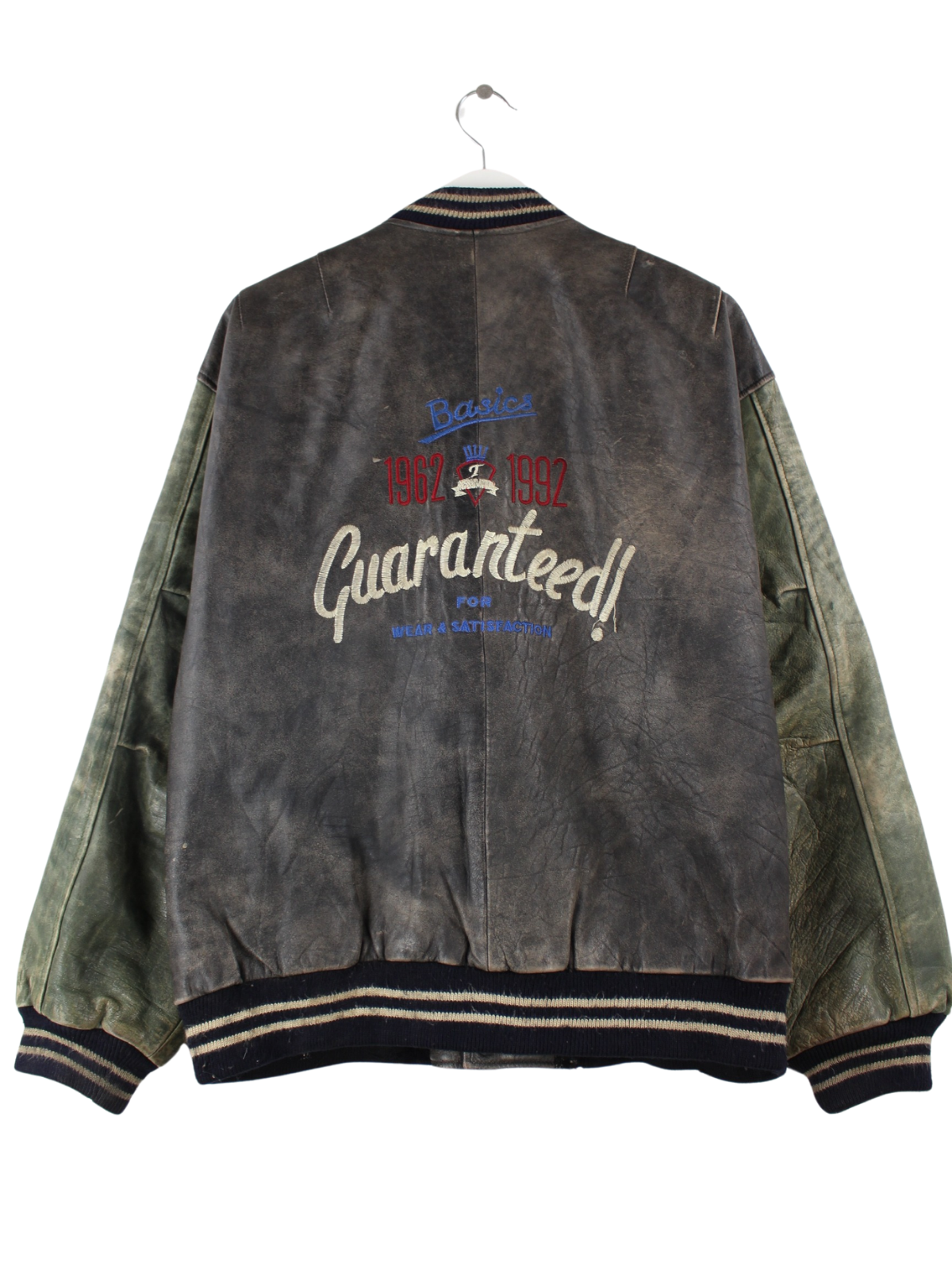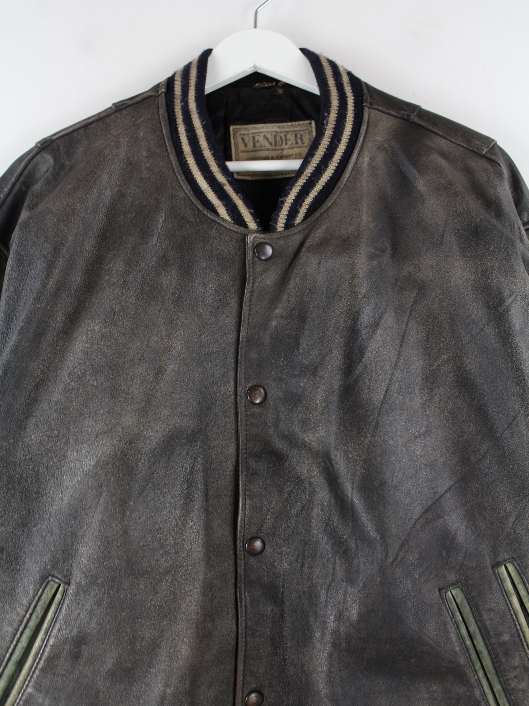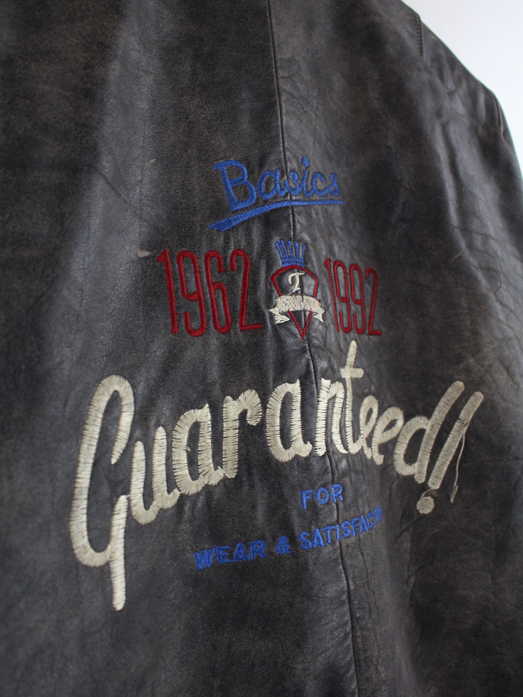 Grey vintage jacket with embroidered logo in size L. It is made of leather and is available in good condition.